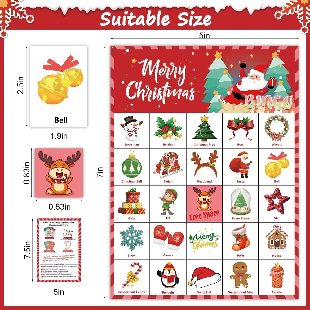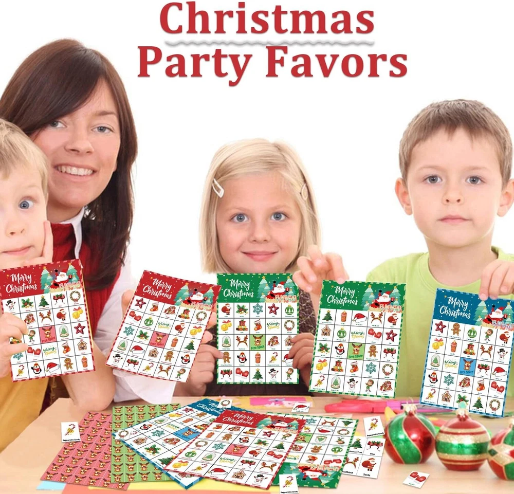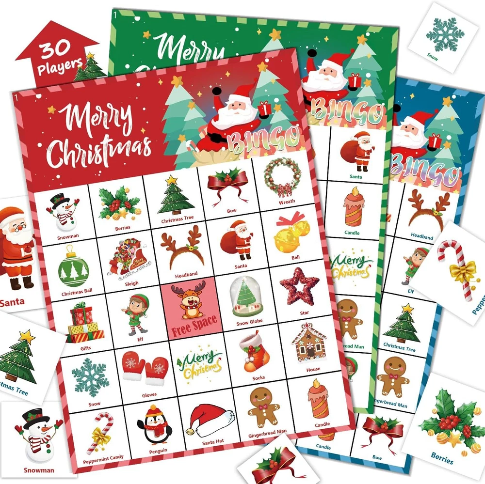 VESPRO 46PCS Christmas Bingo Game Cards for 30 Players Christmas Party Games for Kids Party Classroom Activities Product Details Product Dimensions: 1 x 1 x 1 inches Item Weight: 9.8 ounces Manufacturer recommended age: 3 years and up Manufacturer: VESPRO Christmas Bingo Cards Included:30 sheets Christmas bingo player cards with 24 unique part,24PCS large calling chips,648PCS Bingo marking Chips and a manual.It can make kids adults of all ages and large groups to have a fun time in Christmas party. High Quality:The reusable Christmas bingo games are made of durable cardboard.this set can reused many times.There are many english words on the bingo player cards and calling cards,it can be helpful for the kids to learn and remember words during the card games. Fun Party Supplies:This Christmas party cards game is suitable for classroom game, party game, large groups game,family games or Christmas games, Playing bingo game together is a great chance to increase the relationship between you and your friend and family. Easy to Play:Each player hold a bingo card and some bingo chips,caller hold the calling chips,Then caller randomly call out cards name and the players use the bingo marking chips to mark on the bingo cards,If a player can make a line by 5PCS bingo chips(include free space),he will win the game! Friendly Customer Service:If you have any problems with our Christmas Bingo Sets,please tell us immediately,we have professional person to solve your problem by one-on-one until you are satisfied