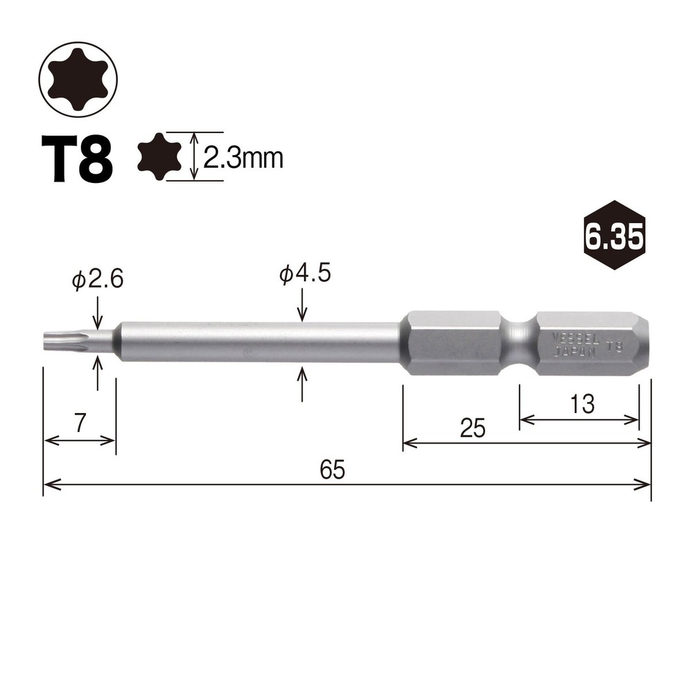 Brand: VESSEL Drive system: Torx Quantity: 1 Manufacturer: VESSEL About this product Blade tip: T8 Total length: 65mm Shank diameter: 6.35mm No magnet Quantity: 10 pieces RoHS 10 substance compliant Country of origin: Japan ☆PRODUCTS☆ Please check the Photo ☆PAYMENTS☆ We accept PayPal and all major Debit / Credit Cards. We can only ship your item after your payment clears. We ship within 10 days of payment. ☆CHECKOUT☆ Please check your address before paying because we can ONLY ship to addresses that are entered before placing the order. We cannot change an address after the order has already been placed. ☆SHIPPING☆ Packages:Box and Bubblerup Packages usually leave our warehouse within 5-7 days of payment. Weekend orders will ship on Monday or Tuesday. We provide valid Tracking Numbers for all orders. ~~For Expedited shipping~~ For Expedited, the item will arrive in about 2-6 days after shipping. ~~For economy shipping~~ Economy shipping to the US (with some exceptions) will take approximately 7-12 business days to arrive after shipping. Even if you select economy shipping, it may be changed to Expedited instead of Economy depending on the size of the product or the size of the package. If it is changed to Expedited, there will be no additional charge, so please rest assured. Only for shipments to Australia, items will be shipped by Japan Post's EMS instead of FedEx (arrival schedule may change slightly) ☆International Packages:☆ We ship to all US Territories, Europe and Asia and Middle East and Australia and Canada including Guam All our international packages ship under the Fedex and Japan Post. ☆CUSTOMER SERVICE☆ If you have any questions or issues, we are at your service. You can email us anytime through eBay messages. ☆RETURN INFORMATION☆ We offer a standard FREE 30 days refund or exchange policy. Item must be returned in original condition in order to receive a full refund. ☆Customs duty☆ Import duties, taxes, and charges are not included in the item price or shipping cost. These charges are the buyer's responsibility. Please check with your country's customs office to determine what these additional costs will be prior to bidding or buying. We will reply to your question or invoice within 3 days. We can't not reply gifts or unreasonable requests such as declared amount.