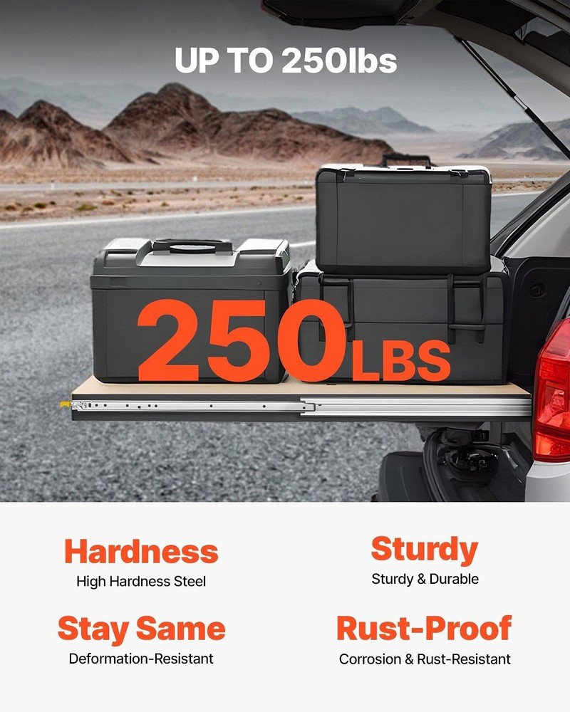 VEVOR Heavy Duty Drawer Slides 16inch, 1 Pair Locking Drawer Slides250lbs Load Capacity, Side Mount Ball Bearing, 3-Fold FullExtension 250 lbs Load Capacity Security Assured Sturdy and Durable Versatile Easy & Quick Assembly User-Friendly Design Suitable Drawer Length: 24.5" / 622 mm,Extension Length: 24" / 600mm,Load Capacity: 250 lbs / 113.4 kg,Item Model Number:5301/5301Z-24",Product Dimensions: 24 x 2.09 x 0.77" / 600 x 53 x19.5 mm (Without Lock), 24.8 x 2.09 x 0.77" / 630 x 53 x 19.5 mm(With Lock),Load Capacity (Fully Extended): 216 lbs / 97.98 kg,NetWeight: 7.28 lbs / 3.3 kg