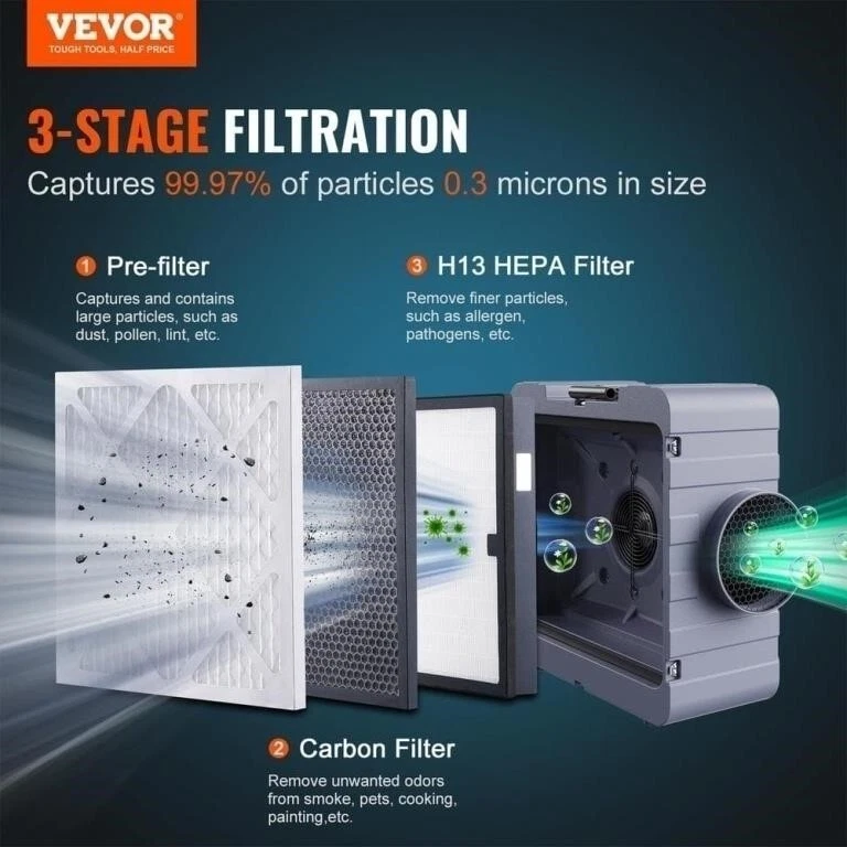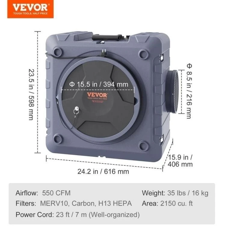 VEVOR's Air Scrubber is a robust addition to any space needing purification. With a 550 CFM airflow, it efficiently cleans the air of dust, pollen, and other particles. The unit features a 3-stage filtration system, including a MERV10 filter, activated carbon, and an H13 HEPA filter, ensuring that the air exiting the machine is clean and fresh. Designed for versatility, this portable air purifier is easy to move around as needed. It operates through an electrical power source and comes with a generous 23-foot power cord. The unit's dimensions, with a 15.5-inch air inlet and an 8.5-inch outlet, make it a practical size for a variety of settings. The gray color provides a sleek, contemporary look.