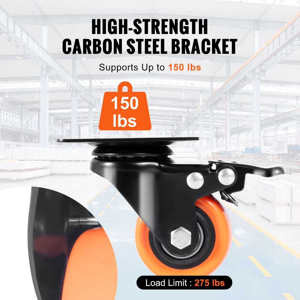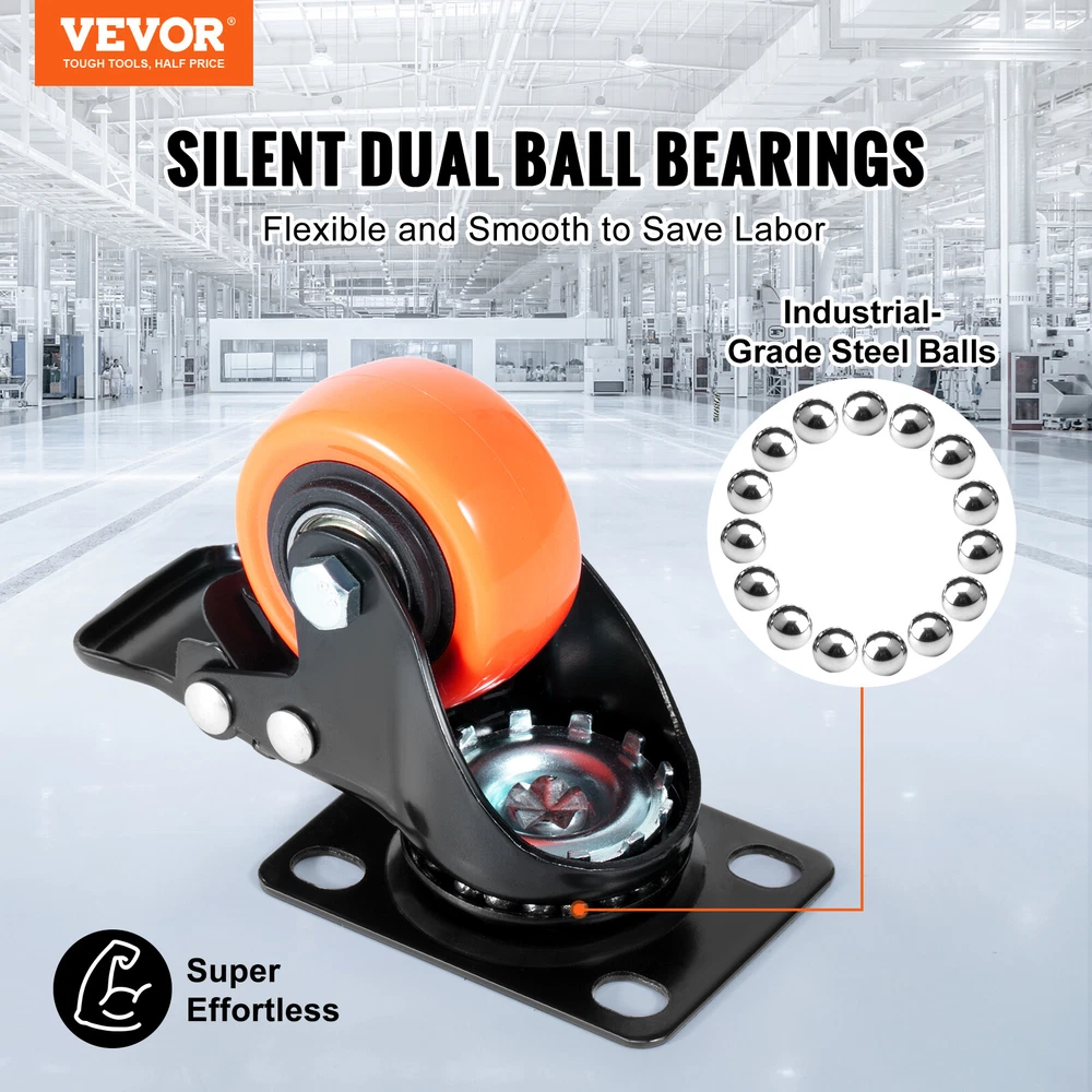 Document Product Description Enjoy Smooth Slide with VEVOR Plate Caster Wheels Meet our unique caster wheels: trendy looks paired with ultra-quiet dual ball bearings make for a smooth, soundless glide. Every move is a silent symphony. The chair wheel boosts a full 360-degree twirl without a hiccup. Plus, our dual brake has got you covered, ensuring the security of individuals and cargo at any time and from any angle. Our office chair wheels are solid as a rock with reinforced carbon steel and a thick design. The 4 heavy duty wheels hold up to 600 lbs. Our computer chair wheels come with a comprehensive set of mounting accessories, making them easy to install and adaptable to various mounting methods. Compact but mighty! Our industrial casters are ideal for a myriad of settings – be it offices, factories, or studios. Let these wheels spin your world! Features & Details Roll Silently & Smoothly: Dive into the bliss of a dual ball bearings design! With selected high-quality ball bearings embedded, rust becomes a myth. Let your caster wheels glide in tranquility, whispering tales of seamless journeys. Move Like the Wind: Feel the freedom of 360° rotation. Move it, swivel it, lock it! Our office chair wheels glide smoothly and come with a beefed-up dual brake system. Pause on a dime and stay safe, no matter where or when! Built Like a Tank, Without the Weight: Forget wimpy wheels. Our heavy duty wheels come with a beefy steel bracket. The thickened design further enhances their strength and durability. Hold up to 600 pounds with 4 wheels? You bet! Accessorize Like a Pro: No more hardware store runs. We've got you covered with all the mounting gear you'll need. So, you can set it up your way, catering to all your weight-bearing requirements with our computer chair wheels. The World's Your Playground: From homes, offices, and studios to factories, our industrial casters play many roles! These casters aren't picky. Slide them under your closet or mount them to your workshop table. They're game for it all. SHIPPING ABOUT US PAYMENT RETURNS CONTACT WARRANTY Welcome to our eBay store. As a leading and emerging company in manufacturer and exporting business, we are specialized in Business and Industrial Products, Sporting Goods, Pet Products, Home and Garden products for more than 10 years. We believe that it is our vision and mission to provide innovative products with best service and competitive price to satisfy you. Our goal is to make sure that you can find exactly what you are looking for and make it easy for you to place your orders. We accept PayPal payment,PayPal Credit,Credit card or debit card and so on. Payment should be completed within 4 (Four) days of auction closing. Or unpaid dispute will be filed for closing auction. We will leave a positive feedback immediately after payment is received. We appreciate a positive feedback as much as you do. If for some reason there is any issue with the purchase, please contact us prior to leaving feedback, we will be glad to work together and provide a satisfying solution. Please be aware that PO Box cannot receive items, please DO NOT fill in the PO Box address. DELIVERY DAYS: 3-7 BUSINESS DAYS 3 BUSINESS DAYS SHIPPING OUT SHIP FROM CA & TX & NJ & GA & NC &OR WAREHOUSE California Warehouse: City of Industry, CA Texas Warehouse : Houston, TX New Jersey Warehouse : Perth Amboy, NJ New York State Warehouse: Perth Amboy, NJ Georgia Warehouse: Austell,GA North Carolina Warehouse: Grove NC Oregon Warehouse: AIRPORT WAY Portland,OR All of our items are backed with a 30-day return policy. We ensure all our items are new and in excellent condition prior to shipping. In case you receive the item that is not to the standards above, please contact us via e-Bay messages. All returns must be in new original condition as received and should be shipped with delivery confirmation Please note that all returns must be pre-approved by us. Unauthorized returns will not be accepted. If you need to return, please check twice to confirm the item not work and contact our customer service representative, let us know the detailed problem and send us some pictures for confirmation. We ONLY accept returns with original package. Please make sure that item has NO man-made sabotage. Used items will not be accepted for return. Email Customer Support: 9:00am-2:00am PST Sunday-Friday All emails will be responded to within 12-24 hours This item comes with 12 months Warranty from the date of customers purchased it. Special circumstances will be listed clearly in the listing. If your item has been damaged in transit or become faulty in warranty period, please email us with pictures or video to show the problem. Please do check everything carefully after you received the parcel, any the damage except DOA (Dead-On-Arrival) would not be covered if it's your fault. Replacement products are provided with the same warranty as the returned products. VEVOR is a leading brand that specializes in equipment and tools. Along with thousands of motivated employees, VEVOR is dedicated to providing our customers with tough equipment & tools at incredibly low prices. Today, VEVOR's products are sold in more than 200 countries and regions with 10 million plus members worldwide. Enjoy Smooth Slide with VEVOR Plate Caster Wheels Meet our unique caster wheels: trendy looks paired with ultra-quiet dual ball bearings make for a smooth, soundless glide. Every move is a silent symphony. The chair wheel boosts a full 360-degree twirl without a hiccup. Plus, our dual brake has got you covered, ensuring the security of individuals and cargo at any time and from any angle. Our office chair wheels are solid as a rock with reinforced carbon steel and a thick design. The 4 heavy duty wheels hold up to 600 lbs. Our computer chair wheels come with a comprehensive set of mounting accessories, making them easy to install and adaptable to various mounting methods. Compact but mighty! Our industrial casters are ideal 