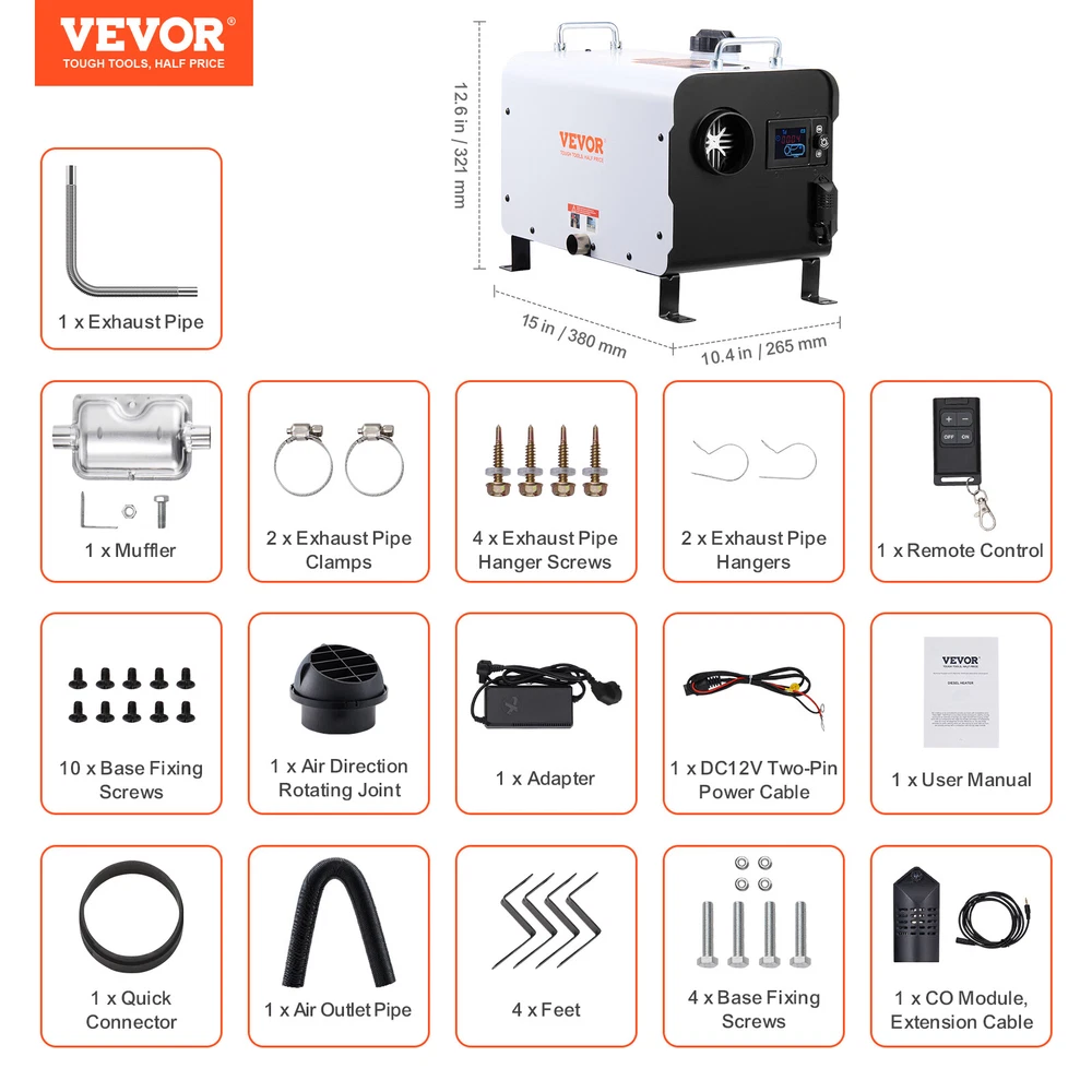 Document Product Description Stay Away from Cold, Warmth All Around Our diesel heater features two wiring options, requiring no complex assembly. The plug-and-play design makes connecting to vehicle power, mains power, or portable power stations easy. Enjoy warmth in your garage, during outdoor camping, or in an RV effortlessly. Featuring an innovative CO alarm system, this diesel air heater continuously monitors carbon monoxide levels. Alerts are triggered at 300 ppm, with auto shutdown at 500 ppm to prevent CO poisoning from incomplete combustion. Control your portable diesel heater from a distance with the Bluetooth app or remote control—start it up with just a button press and walk into warmth. The HD display panel allows for easy operation and provides real-time status updates. Equipped with a premium muffler and fuel pump, this diesel heater operates quietly without disturbing your rest or driving. Its large handle design makes it easy to carry to your garage, RV, or outdoor locations. In addition to overheat protection, this diesel car heater is equipped with a fuel level indicator, and a leak-proof fuel cap—all upgrades that enhance safety for extended use. Features & Details Innovative CO Alarm System: Our diesel heater features enhanced safety with a built-in CO alarm that continuously monitors CO levels, providing alerts or auto shut-off when needed. Additional upgrades include a leak-proof fuel tank cap, fuel level indicator, and overheat protection—ensuring peace of mind during extended use. Wide Compatibility (DC 12-24V): The diesel air heater comes with two wiring options—adapter and DC 12V—making it plug-and-play for versatile use. It is suitable for outlets, DC 12/24V vehicle batteries, or outdoor power stations, providing warmth in cars, RVs, trucks, tractors, garages, cabins, and even during outdoor camping. 8kW 0.18-0.35L/h Consumption: Power: 8kW; Combustion Efficiency:≥90%. Our portable diesel heater is made of a cast aluminum body and ceramic igniter. It delivers rapid heating in cold conditions, consuming only 1 gallon of diesel per night to maintain warmth across a large area. Quiet Operation: This 8kw diesel heater is designed with a premium muffler and fuel pump to minimize noise, operating at ≤75dB. Enjoy a warm, uninterrupted sleep during RV stays or outdoor camping, free from the cold. Smart Control Options: Our diesel car heater is equipped with 3 control method: Bluetooth app, remote control, and display panel. You can control and monitor your heater directly from your smartphone. Adjust temperature settings effortlessly for an intuitive and convenient heating experience. SHIPPING ABOUT US PAYMENT RETURNS CONTACT WARRANTY Welcome to our eBay store. As a leading and emerging company in manufacturer and exporting business, we are specialized in Business and Industrial Products, Sporting Goods, Pet Products, Home and Garden products for more than 10 years. We believe that it is our vision and mission to provide innovative products with best service and competitive price to satisfy you. Our goal is to make sure that you can find exactly what you are looking for and make it easy for you to place your orders. We accept PayPal payment,PayPal Credit,Credit card or debit card and so on. Payment should be completed within 4 (Four) days of auction closing. Or unpaid dispute will be filed for closing auction. We will leave a positive feedback immediately after payment is received. We appreciate a positive feedback as much as you do. If for some reason there is any issue with the purchase, please contact us prior to leaving feedback, we will be glad to work together and provide a satisfying solution. Please be aware that PO Box cannot receive items, please DO NOT fill in the PO Box address. DELIVERY DAYS: 3-7 BUSINESS DAYS 3 BUSINESS DAYS SHIPPING OUT SHIP FROM CA & TX & NJ & GA & NC &OR WAREHOUSE California Warehouse: City of Industry, CA Texas Warehouse : Houston, TX New Jersey Warehouse : Perth Amboy, NJ New York State Warehouse: Perth Amboy, NJ Georgia Warehouse: Austell,GA North Carolina Warehouse: Grove NC Oregon Warehouse: AIRPORT WAY Portland,OR All of our items are backed with a 30-day return policy. We ensure all our items are new and in excellent condition prior to shipping. In case you receive the item that is not to the standards above, please contact us via e-Bay messages. All returns must be in new original condition as received and should be shipped with delivery confirmation Please note that all returns must be pre-approved by us. Unauthorized returns will not be accepted. If you need to return, please check twice to confirm the item not work and contact our customer service representative, let us know the detailed problem and send us some pictures for confirmation. We ONLY accept returns with original package. Please make sure that item has NO man-made sabotage. Used items will not be accepted for return. Email Customer Support: 9:00am-2:00am PST Sunday-Friday All emails will be responded to within 12-24 hours This item comes with 12 months Warranty from the date of customers purchased it. Special circumstances will be listed clearly in the listing. If your item has been damaged in transit or become faulty in warranty period, please email us with pictures or video to show the problem. Please do check everything carefully after you received the parcel, any the damage except DOA (Dead-On-Arrival) would not be covered if it's your fault. Replacement products are provided with the same warranty as the returned products. VEVOR is a leading brand that specializes in equipment and tools. Along with thousands of motivated employees, VEVOR is dedicated to providing our customers with tough equipment & tools at incredibly low prices. Today, VEVOR's products are sold in more than 200 countries and regions with 10 million plus members worldwide. Stay Away from Cold, Warmth All Around Our diesel heater features two wiring options, requiring no comple
