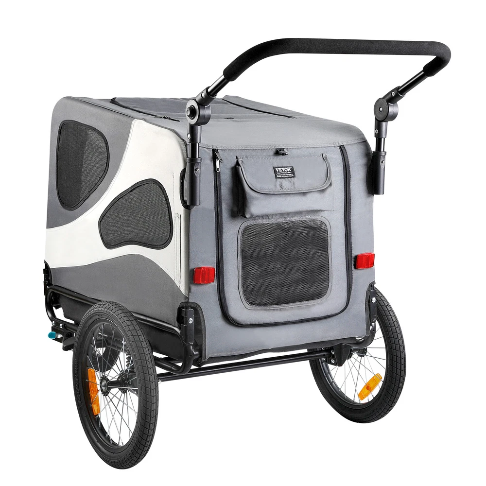 Document Product Description VEVOR Pet Bike Trailer – A Fun Way to Travel Our dog bike trailer provides a roomy compartment where your furry friend can relax while you ride. It's perfect for a medium-sized dog or multiple smaller ones up to 26" tall, with a load limit of 100 lbs/45 kg. Crafted from top-notch materials, our pet bike carrier is made for durability. Tear-resistant mesh on the inside ensures stability, while the exterior's tough texture adds grip. The transparent front door of this bike pet trailer features weather protection and a four-sided mesh design for a comfortable riding experience. Your pet can easily enter through the zippered front and rear doors. We've added a high-visibility flag and four reflectors to make your dog bike carrier easily noticeable on the road, even in low-light conditions. Setting up our bike dog carrier is a piece of cake. No special skills or tools are needed. Even newcomers can have it ready to roll, giving you more time for fun adventures with your pet. Features & Details 2-in-1 Design: This dog bike trailer is your perfect partner for leisurely bike rides and active jogging sessions. It easily transforms from a bicycle trailer to a jogging stroller. It fits most bicycles with wheel diameters of 22-28 inches and can carry up to 100 lbs/45 kg, making it effortless to take your furry companion on adventures. Smooth Riding: Our pet bike carrier ensures a comfortable journey with the built-in shock absorber. Security is a priority with a reliable parking brake to prevent any unexpected movement. Plus, the adjustable handle caters to people of all heights, ranging from 33.07"/840 mm (at a 90° angle) to 44.69"/1135 mm (at a 180° angle). Premium Materials for Durability: This dog bike carrier is built tough with a powder-coated steel frame and waterproof, sunproof 600D polyester fabric. The front door features a zippered mesh layer and a PVC canvas layer. Fold the PVC canvas for a cool breeze, or lower it to keep your pet dry. Let your dog enjoy the ride! Easy In, Easy Out: Getting your pet in and out is a breeze with this pet bike trailer. The transparent front door provides protection from wind and rain while ensuring excellent ventilation. Your pet can hop in through the zippered front and rear doors and even stick their head out, all with ease. Quick Connect and Fold: Assembling our bike dog carrier is a snap, quickly connecting to your bike via a coupler. The wheels are removable, and the frame folds and flips for convenient storage and transportation. SHIPPING ABOUT US PAYMENT RETURNS CONTACT WARRANTY Welcome to our eBay store. As a leading and emerging company in manufacturer and exporting business, we are specialized in Business and Industrial Products, Sporting Goods, Pet Products, Home and Garden products for more than 10 years. We believe that it is our vision and mission to provide innovative products with best service and competitive price to satisfy you. Our goal is to make sure that you can find exactly what you are looking for and make it easy for you to place your orders. We accept PayPal payment,PayPal Credit,Credit card or debit card and so on. Payment should be completed within 4 (Four) days of auction closing. Or unpaid dispute will be filed for closing auction. We will leave a positive feedback immediately after payment is received. We appreciate a positive feedback as much as you do. If for some reason there is any issue with the purchase, please contact us prior to leaving feedback, we will be glad to work together and provide a satisfying solution. Please be aware that PO Box cannot receive items, please DO NOT fill in the PO Box address. DELIVERY DAYS: 3-7 BUSINESS DAYS 3 BUSINESS DAYS SHIPPING OUT SHIP FROM CA & TX & NJ & GA & NC &OR WAREHOUSE California Warehouse: City of Industry, CA Texas Warehouse : Houston, TX New Jersey Warehouse : Perth Amboy, NJ New York State Warehouse: Perth Amboy, NJ Georgia Warehouse: Austell,GA North Carolina Warehouse: Grove NC Oregon Warehouse: AIRPORT WAY Portland,OR All of our items are backed with a 30-day return policy. We ensure all our items are new and in excellent condition prior to shipping. In case you receive the item that is not to the standards above, please contact us via e-Bay messages. All returns must be in new original condition as received and should be shipped with delivery confirmation Please note that all returns must be pre-approved by us. Unauthorized returns will not be accepted. If you need to return, please check twice to confirm the item not work and contact our customer service representative, let us know the detailed problem and send us some pictures for confirmation. We ONLY accept returns with original package. Please make sure that item has NO man-made sabotage. Used items will not be accepted for return. Email Customer Support: 9:00am-2:00am PST Sunday-Friday All emails will be responded to within 12-24 hours This item comes with 12 months Warranty from the date of customers purchased it. Special circumstances will be listed clearly in the listing. If your item has been damaged in transit or become faulty in warranty period, please email us with pictures or video to show the problem. Please do check everything carefully after you received the parcel, any the damage except DOA (Dead-On-Arrival) would not be covered if it's your fault. Replacement products are provided with the same warranty as the returned products. VEVOR is a leading brand that specializes in equipment and tools. Along with thousands of motivated employees, VEVOR is dedicated to providing our customers with tough equipment & tools at incredibly low prices. Today, VEVOR's products are sold in more than 200 countries and regions with 10 million plus members worldwide. VEVOR Pet Bike Trailer – A Fun Way to Travel Our dog bike trailer provides a roomy compartment where your furry friend can relax while you ride. It's perfect for a medium-sized dog or multiple smaller ones up to 26" tall, w