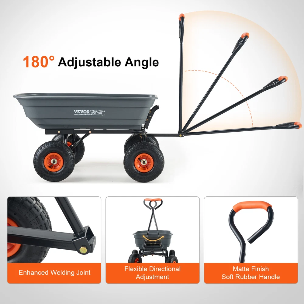 Product Description Transport heavy loads effortlessly with our dump cart! This garden cart with a sturdy thick metal frame, is capable of handling up to 600 lbs of weight. Its generous 4 cu. ft capacity makes each transportation a breeze. The handle features a soft pad, making it more comfortable and effortless to grip. Equipped with large 10" rubber wheels, this garden dump cart provides excellent durability and shock absorption, ensuring smooth movement even on rough terrain. The 360° swivel wheels make turning effortless, making transportation a breeze. The mesh covers effectively prevent small items from falling during transport, ensuring the safety of your cargo. The frame's handlebar simplifies unloading, while the ergonomic handle makes installation exceptionally easy. From beautifying gardens to maintaining orchards, harvesting crops on farms, or managing warehouse logistics, this dump wagon meets all your transportation needs. It's your ideal companion for any task! Features & Details Heavy-Duty Load Capacity: Our dump cart can bear up to 600 lbs, effortlessly handling heavy loads. With a capacity of 4 cu.ft, it boosts your productivity. Its sturdy metal frame and surface coating ensure long-term durability. Easy Dumping: Equipped with a front-handle dumping frame, users can quickly unload items. Simply disassemble the bottom of the frame to the garden dump cart. The 180° adjustable handle facilitates effortless maneuvering, doubling your efficiency. Durable Material: Our dump wagon is crafted from high-quality 3mm thick PP material, designed to carry loads while retaining its shape. Reinforced with 25mm/1" metal brackets and a scratch-resistant painted coating, it's scratch-resistant and suitable for long-term outdoor use. Large Tire Size: With ø255mm/10" rubber tires, the yard cart provides excellent shock absorption, navigating uneven garden terrain or grassy slopes, ensuring smooth transport. Safe Transport: Included mesh cover and cushion ensure item safety, our yard dump cart is suitable for various settings from gardens, orchards, and farms to warehouses, efficiently completing transport tasks. SHIPPING ABOUT US PAYMENT RETURNS CONTACT WARRANTY Welcome to our eBay store. As a leading and emerging company in manufacturer and exporting business, we are specialized in Business and Industrial Products, Sporting Goods, Pet Products, Home and Garden products for more than 10 years. We believe that it is our vision and mission to provide innovative products with best service and competitive price to satisfy you. Our goal is to make sure that you can find exactly what you are looking for and make it easy for you to place your orders. We accept PayPal payment,PayPal Credit,Credit card or debit card and so on. Payment should be completed within 4 (Four) days of auction closing. Or unpaid dispute will be filed for closing auction. We will leave a positive feedback immediately after payment is received. We appreciate a positive feedback as much as you do. If for some reason there is any issue with the purchase, please contact us prior to leaving feedback, we will be glad to work together and provide a satisfying solution. Please be aware that PO Box cannot receive items, please DO NOT fill in the PO Box address. DELIVERY DAYS: 3-7 BUSINESS DAYS 3 BUSINESS DAYS SHIPPING OUT SHIP FROM CA & TX & NJ & GA & NC &OR WAREHOUSE California Warehouse: City of Industry, CA Texas Warehouse : Houston, TX New Jersey Warehouse : Perth Amboy, NJ New York State Warehouse: Perth Amboy, NJ Georgia Warehouse: Austell,GA North Carolina Warehouse: Grove NC Oregon Warehouse: AIRPORT WAY Portland,OR All of our items are backed with a 30-day return policy. We ensure all our items are new and in excellent condition prior to shipping. In case you receive the item that is not to the standards above, please contact us via e-Bay messages. All returns must be in new original condition as received and should be shipped with delivery confirmation Please note that all returns must be pre-approved by us. Unauthorized returns will not be accepted. If you need to return, please check twice to confirm the item not work and contact our customer service representative, let us know the detailed problem and send us some pictures for confirmation. We ONLY accept returns with original package. Please make sure that item has NO man-made sabotage. Used items will not be accepted for return. Email Customer Support: 9:00am-2:00am PST Sunday-Friday All emails will be responded to within 12-24 hours This item comes with 12 months Warranty from the date of customers purchased it. Special circumstances will be listed clearly in the listing. If your item has been damaged in transit or become faulty in warranty period, please email us with pictures or video to show the problem. Please do check everything carefully after you received the parcel, any the damage except DOA (Dead-On-Arrival) would not be covered if it's your fault. Replacement products are provided with the same warranty as the returned products. VEVOR is a leading brand that specializes in equipment and tools. Along with thousands of motivated employees, VEVOR is dedicated to providing our customers with tough equipment & tools at incredibly low prices. Today, VEVOR's products are sold in more than 200 countries and regions with 10 million plus members worldwide. Transport heavy loads effortlessly with our dump cart! This garden cart with a sturdy thick metal frame, is capable of handling up to 600 lbs of weight. Its generous 4 cu. ft capacity makes each transportation a breeze. The handle features a soft pad, making it more comfortable and effortless to grip. Equipped with large 10" rubber wheels, this garden dump cart provides excellent durability and shock absorption, ensuring smooth movement even on rough terrain. The 360° swivel wheels make turning effortless, making transportation a breeze. The mesh covers effectively prevent small items from falling during trans