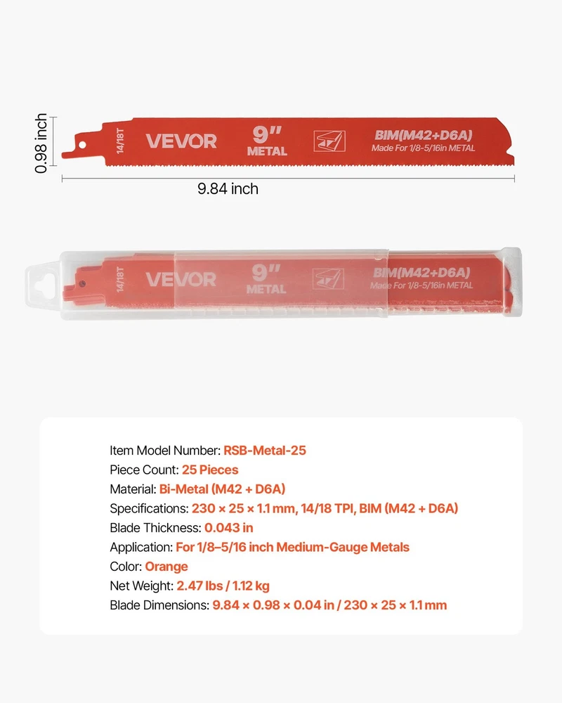 ●【Product Information】High-Quality BladesVersatile UseHardened MaterialWide CompatibilityPortable & Dust-ResistantProtective CoatingBlade Dimensions: 9.84 x 0.98 x 0.04 in / 230 x 25 x 1.1 mmSpecifications: 230 x 25 x 1.1 mm 14/18 TPI BIM (M42 + D6A)Blade Thickness: 0.043 inColor: OrangeItem Model Number: RSB-Metal-25Material: Bi-Metal (M42 + D6A)Piece Count: 25 PiecesApplication: For 1/8–5/16 inch Medium-Gauge MetalsNet Weight: 2.47 lbs / 1.12 kg ✅ 【Features】● Wide Application: Available in various specifications, these reciprocating saw blades are ideal for cutting metal materials such as pipes, steel sheets, and bolts. Ideal for daily metal cutting applications● Efficient Cutting: Sharp teeth combined with hardened material pro... VEVOR Reciprocating Saw Blades,25 Pack,14/18 TPI Bi-Metal Reciprocating Saw Blade Set with Universal Shank,Sharp Teeth for Fast and Smooth Cuts,for Cutting 1/8-5/16 inch Medium Metals,Orange ●【Product Information】 High-Quality Blades Versatile Use Hardened Material Wide Compatibility Portable & Dust-Resistant Protective Coating Blade Dimensions: 9.84 x 0.98 x 0.04 in / 230 x 25 x 1.1 mm Specifications: 230 x 25 x 1.1 mm 14/18 TPI BIM (M42 + D6A) Blade Thickness: 0.043 in Color: Orange Item Model Number: RSB-Metal-25 Material: Bi-Metal (M42 + D6A) Piece Count: 25 Pieces Application: For 1/8–5/16 inch Medium-Gauge Metals Net Weight: 2.47 lbs / 1.12 kg ✅ 【Features】 ● Wide Application: Available in various specifications, these reciprocating saw blades are ideal for cutting metal materials such as pipes, steel sheets, and bolts. Ideal for daily metal cutting applications ● Efficient Cutting: Sharp teeth combined with hardened material provide exceptional cutting performance and smooth edges, making the saw blades ideal for home repairs, outdoor tasks, DIY projects, and professional construction work ● Long-Lasting Durability: The metal cutting saw blades' thickness withstands high temperatures and wear during cutting, minimizing breakage risks. Special surface treatment further enhances the lifespan ● Easy to Use: No complex steps required for replacement. Simply swap out the old blade. The included transparent storage case keeps all bi-metal reciprocating saw blades organized and makes it easy to carry when working outdoors ● Strong Compatibility: The universal shank design ensures compatibility with various major reciprocating saws, including both corded and cordless models, making the bi metal blades versatile and easy to use Item Specifics Type Saw Blades Brand VEVOR Quantity 25 pcs About us Dear buyer, Thank you for visiting my store! Our warehouses are located in many regions around the United States. According to the customer's delivery address. Use USPS/UPS/DHL logistics transportation service. Prioritize the best quality logistics solutions to transport packages. Ensure package delivery time, At the same time. Have any after-sales problems, Feel free to contact us. At your service Payment PayPal is our preferred method of payments it's the quickest, easiest and most secure way to pay for your goods or services online. PayPal offers buyer and seller protection should there be a problem. If you do not have a PayPal account, to get started and buy your first item with us is very easy. Simply click on the 'Buy It Now' button and follow the eBay checkout steps. Select PayPal as the payment method you then will be given the chance to enter your card details in to PayPal's secure checkout in order to pay for your order. Shipping 1. Your purchase is shipped directly to you as soon as we have received your cleared payment. 2. Normally all of parcels would be shipped within 3days(From Monday to Saturday). 3. We will send information on eBay or email if the parcel was delayed due to our holiday. 4. We provide three kinds of shipping for choice. Shipping way depend on delivery address. Returns If an unit is received defective, of course we take it back or replace it. If the unit is received as expected, we must charge for our expenses if you want to send it back. We have to charge for the work of handling, retesting and restocking. DESCRIPTION PAYMENT SHIPPING RETURN POLICY CONTACT US Shop Category Store Home Home & Garden ◈ Tools ◈ Ride-Ons & Tricycles ▷ Furniture ♢ Sofa Art ◈ Paintings Other Hot Item New Moet & Chandon Champagne Tin Sign Metal Poster Wine Bar Pub Liquor Store USD 15.00 nel Retro Art Decoration for Home Club Cabin Garage Store Bar Cafe Farm 12" X 8" USD 15.77 Munsters Koach Comic Metal Tin Sign USD 15.77 Picture New List Item Help & Info Payment Policy Shipping Policy Return Policy FAQ About Us VEVOR Reciprocating Saw Blades,25 Pack,14/18 TPI Bi-Metal Reciprocating Saw Blade Set with Universal Shank,Sharp Teeth for Fast and Smooth Cuts,for Cutting 1/8-5/16 inch Medium Metals,Orange ●【Product Information】 High-Quality Blades Versatile Use Hardened Material Wide Compatibility Portable & Dust-Resistant Protective Coating Blade Dimensions: 9.84 x 0.98 x 0.04 in / 230 x 25 x 1.1 mm Specifications: 230 x 25 x 1.1 mm 14/18 TPI BIM (M42 + D6A) Blade Thickness: 0.043 in Color: Orange Item Model Number: RSB-Metal-25 Material: Bi-Metal (M42 + D6A) Piece Count: 25 Pieces Application: For 1/8–5/16 inch Medium-Gauge Metals Net Weight: 2.47 lbs / 1.12 kg ✅ 【Features】 ● Wide Application: Available in various specifications, these reciprocating saw blades are ideal for cutting metal materials such as pipes, steel sheets, and bolts. Ideal for daily metal cutting applications ● Efficient Cutting: Sharp teeth combined with hardened material provide exceptional cutting performance and smooth edges, making the saw blades ideal for home repairs, outdoor tasks, DIY projects, and professional construction work ● Long-Lasting Durability: The metal cutting saw blades' thickness withstands high temperatures and wear during cutting, minimizing breakage risks. Special surface treatment further enhances the