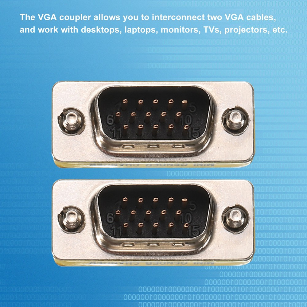 Document What is this?The VGA coupler allows you to interconnect two VGA cables, and work with desktops, laptops, monitors, TVs, projectors, etc.What will I get?Package Content: 10pcs x VGA Gender Changer Adapter Coupler; Total Size(LxW): 31x18mm/1.2x0.7 inch; Material: MetalAre there any advantages of the product?No signal attenuation, the VGA changer gender can ensure high-definition screen signal transmission, and convenient VGA inline couplers are easy to carry for office monitor or projector connections.How to use it?Easy to install, plug and play, VGA gender changer coupler to connect two VGA cables to get a longer cable.What should I notice?Please note that the VGA cable plugs are Male to Male. 15pcs USB 2.0 A Type Male Jack Soldering Connectors Adapters USD 9.51 10Pcs DB 15 Pin 3 Row Female D-SUB VGA Connector PCB Mounting Right Angle USD 13.99 DB9 9-Pin 2 Rows Male Converter Connector Adapter w Plastic Housing Assembly USD 8.89 VGA Coupler VGA Gender Changer Connector Male to Male VGA Adapter, Pack of 10 What is this? The VGA coupler allows you to interconnect two VGA cables, and work with desktops, laptops, monitors, TVs, projectors, etc. What will I get? Package Content: 10pcs x VGA Gender Changer Adapter Coupler; Total Size(LxW): 31x18mm/1.2x0.7 inch; Material: Metal Are there any advantages of the product? No signal attenuation, the VGA changer gender can ensure high-definition screen signal transmission, and convenient VGA inline couplers are easy to carry for office monitor or projector connections. How to use it? Easy to install, plug and play, VGA gender changer coupler to connect two VGA cables to get a longer cable. What should I notice? Please note that the VGA cable plugs are Male to Male. Hot Item DB9 9-Pin 2 Rows Male Converter Connector Adapter w Plastic Housing Assembly USD 8.89 15pcs USB 2.0 A Type Male Jack Soldering Connectors Adapters USD 9.51 10Pcs DB 15 Pin 3 Row Female D-SUB VGA Connector PCB Mounting Right Angle USD 13.99 Payment We accept eBay payment. Please do not email us to ask for other payment option. We appreciate prompt payment and look forward to your business in the future. Unpaid item will be filed without receiving payment in 7 days from listing ended. Shipping Usually we ship your order out within 24 hours in business day. For shipping and handling charges (S&H) for specific item, please refer to the item listing page for more details. Please make sure your shipping address is correct. We are not responsible for any loss in transit if a wrong address is provided. Return Policy Returns for exchange are permitted and must be initiated by the buyer within 30 days upon receipt. If you would like to return your product(s) for repair / replacement / refund, please kindly contact our customer service representatives via email for an authorized RMA number. Your returned product(s) will not be processed without a completed RMA. About Us We are continually expanding our product selection to better serve your need. We look forward to providing the best sevice to you - our dear customers, so take a look around our store and find the product that you want. You can put your trust in us! If you need any help or have any suggestions, please don't hesititate to contact us anytime , we will reply you within 24 hours and try the best to help you. Description Policy VGA Coupler VGA Gender Changer Connector Male to Male VGA Adapter, Pack of 10 What is this? The VGA coupler allows you to interconnect two VGA cables, and work with desktops, laptops, monitors, TVs, projectors, etc. What will I get? Package Content: 10pcs x VGA Gender Changer Adapter Coupler; Total Size(LxW): 31x18mm/1.2x0.7 inch; Material: Metal Are there any advantages of the product? No signal attenuation, the VGA changer gender can ensure high-definition screen signal transmission, and convenient VGA inline couplers are easy to carry for office monitor or projector connections. How to use it? Easy to install, plug and play, VGA gender changer coupler to connect two VGA cables to get a longer cable. What should I notice? Please note that the VGA cable plugs are Male to Male. 15pcs USB 2.0 A Type Male Jack Soldering Connectors Adapters USD 9.51 10Pcs DB 15 Pin 3 Row Female D-SUB VGA Connector PCB Mounting Right Angle USD 13.99 DB9 9-Pin 2 Rows Male Converter Connector Adapter w Plastic Housing Assembly USD 8.89 Hot Item DB9 9-Pin 2 Rows Male Converter Connector Adapter w Plastic Housing Assembly USD 8.89 15pcs USB 2.0 A Type Male Jack Soldering Connectors Adapters USD 9.51 10Pcs DB 15 Pin 3 Row Female D-SUB VGA Connector PCB Mounting Right Angle USD 13.99 Payment We accept eBay payment. Please do not email us to ask for other payment option. We appreciate prompt payment and look forward to your business in the future. Unpaid item will be filed without receiving payment in 7 days from listing ended. Shipping Usually we ship your order out within 24 hours in business day. For shipping and handling charges (S&H) for specific item, please refer to the item listing page for more details. Please make sure your shipping address is correct. We are not responsible for any loss in transit if a wrong address is provided. Return Policy Returns for exchange are permitted and must be initiated by the buyer within 30 days upon receipt. If you would like to return your product(s) for repair / replacement / refund, please kindly contact our customer service representatives via email for an authorized RMA number. Your returned product(s) will not be processed without a completed RMA. About Us We are continually expanding our product selection to better serve your need. We look forward to providing the best sevice to you - our dear customers, so take a look around our store and find the product that you want. You can put your trust in us! If you need any help or have any suggestions, please don't hesititate to contact us anytime , we will reply you within 24 hours and try the best to help you.