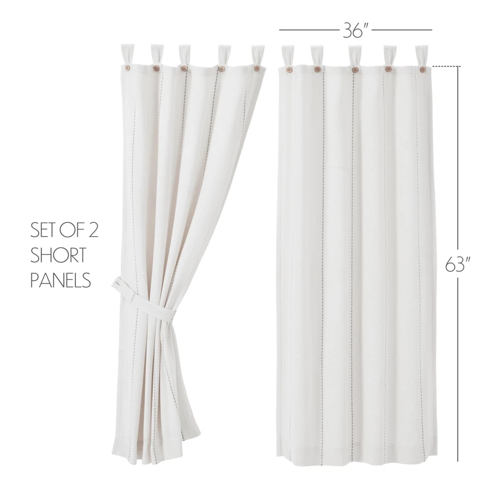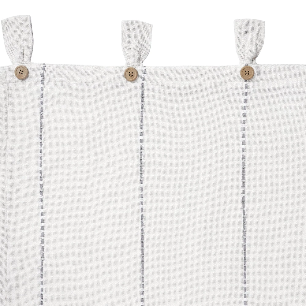 FARMHOUSE CURTAINS: Includes two 63 by 36 inch panels made from high-quality, textured white burlap with dove grey stitching. Features a white cotton lining and a tab top for easy hanging. Includes matching tie backs. Tabs not included in the overall dimensions. LIGHT FILTERING: Lined to provide additional privacy while filtering out harsh outside light. FLEXIBLE STYLING: White burlap blends easily into farmhouse, cottage, and modern country home decor. EASY CARE: Machine wash on gentle and tumble dry on low. Iron safe. When washed, the weave tightens. Gently iron to relax the weave and return burlap to its original state. BURLAP CHARM: Cozy texture, white burlap and dove gray stitching details create a relaxed yet fashionable rustic look.