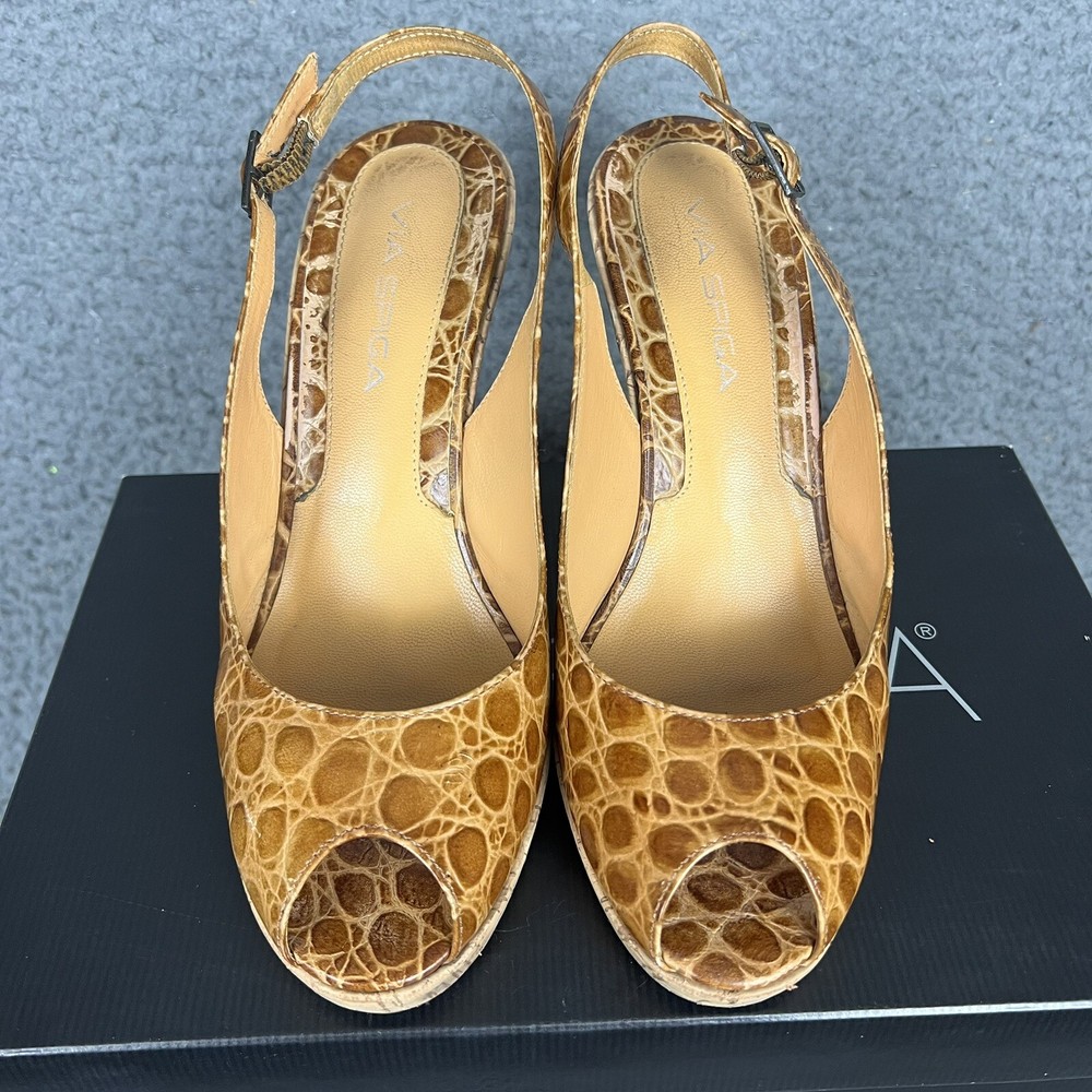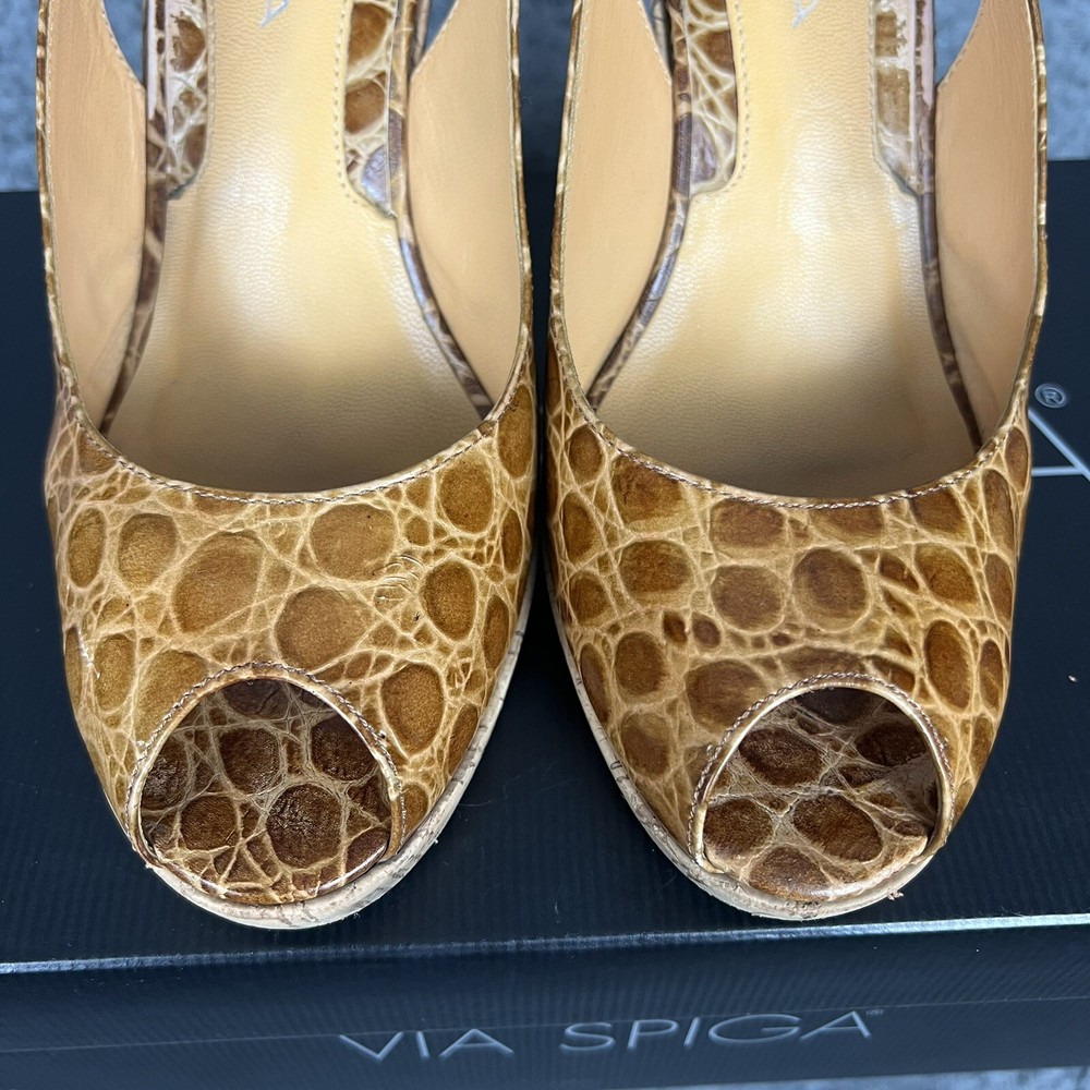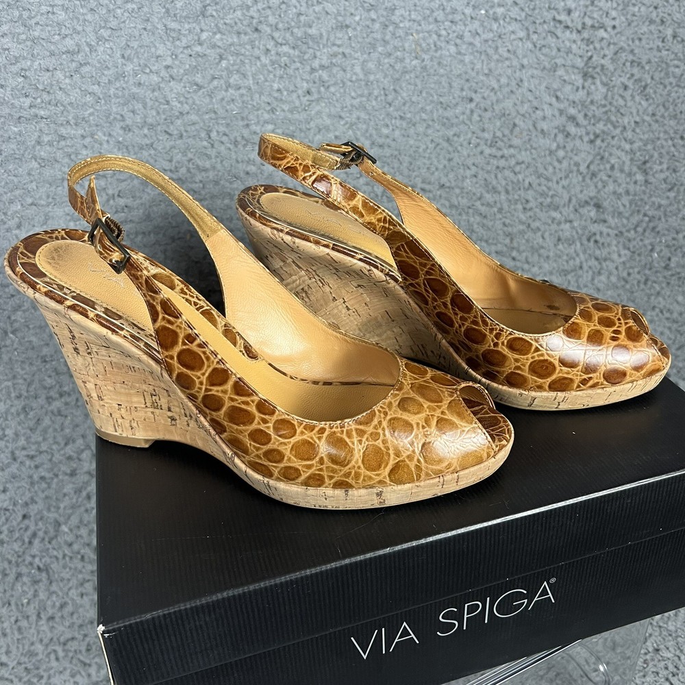 The VIA SPIGA Brown Faux Croc Leather Embossed Peep Toe Heel Wedges are stylish and versatile shoes perfect for a variety of occasions. With a high wedge heel and slip-on closure, these cork-lined heels feature a chic animal print pattern and retro design. Made of leather with a faux leather lining, these shoes add a touch of sophistication to any outfit, whether for a formal event or a casual night out. The peep toe shape and ankle strap detail make them a trendy choice for the fashion-forward woman.