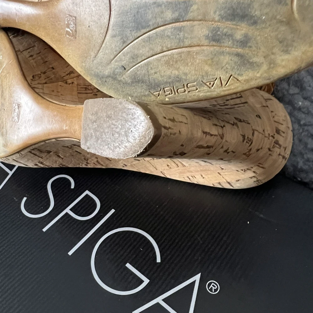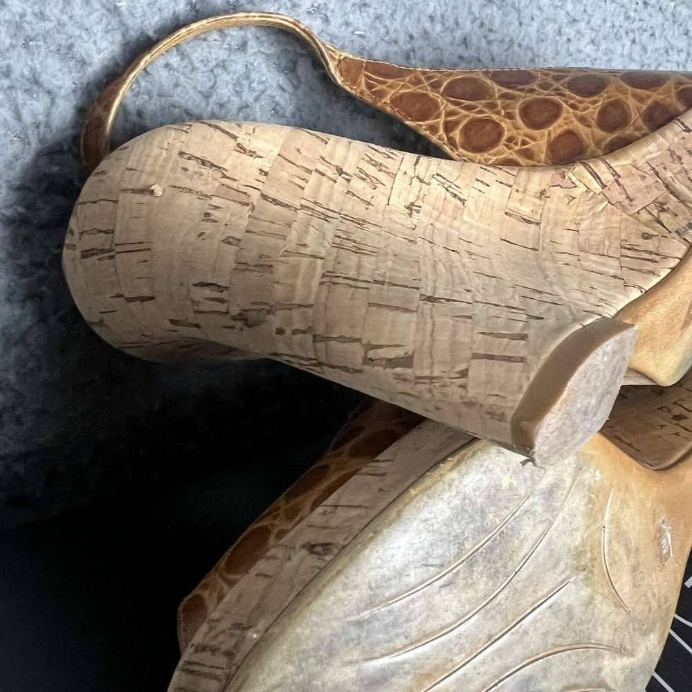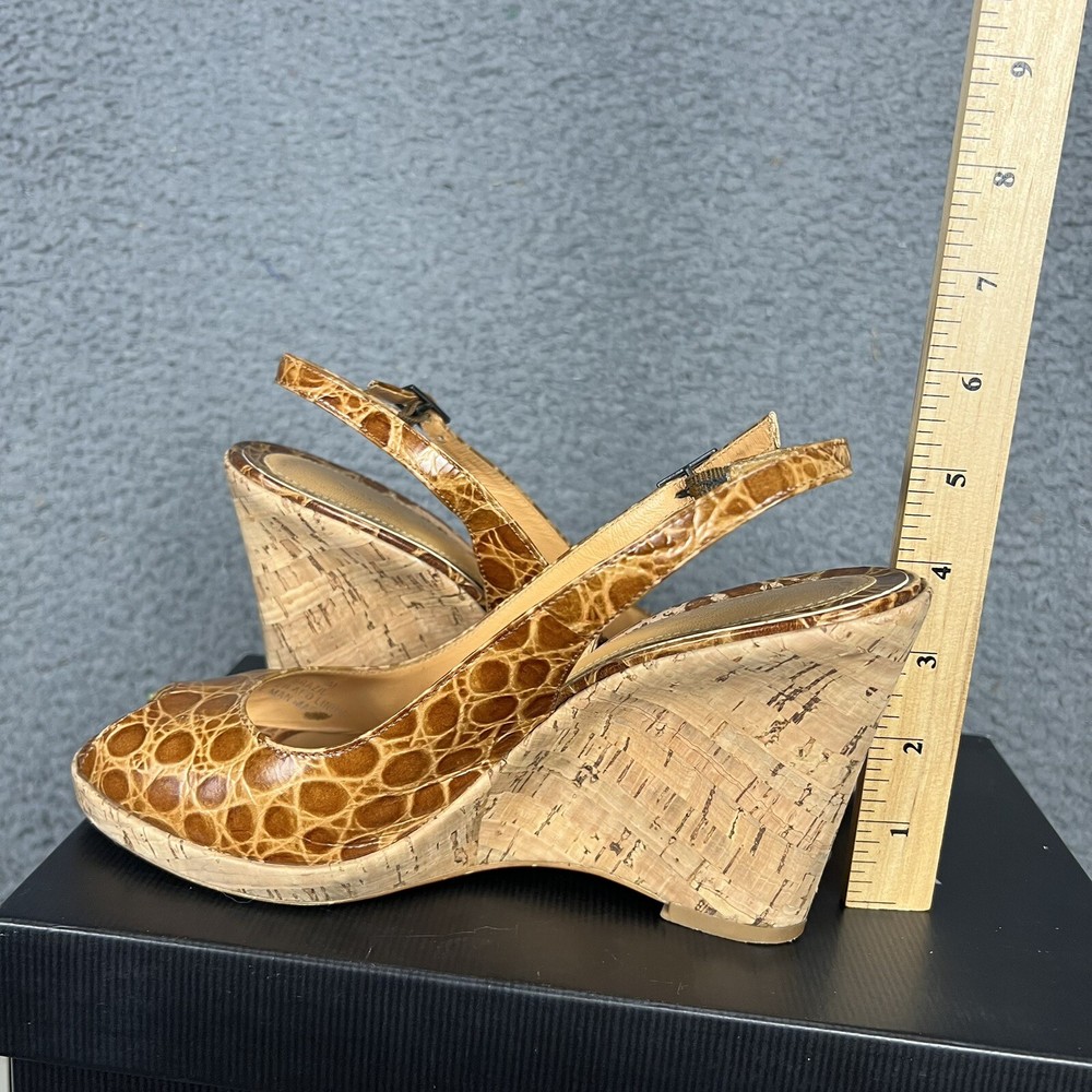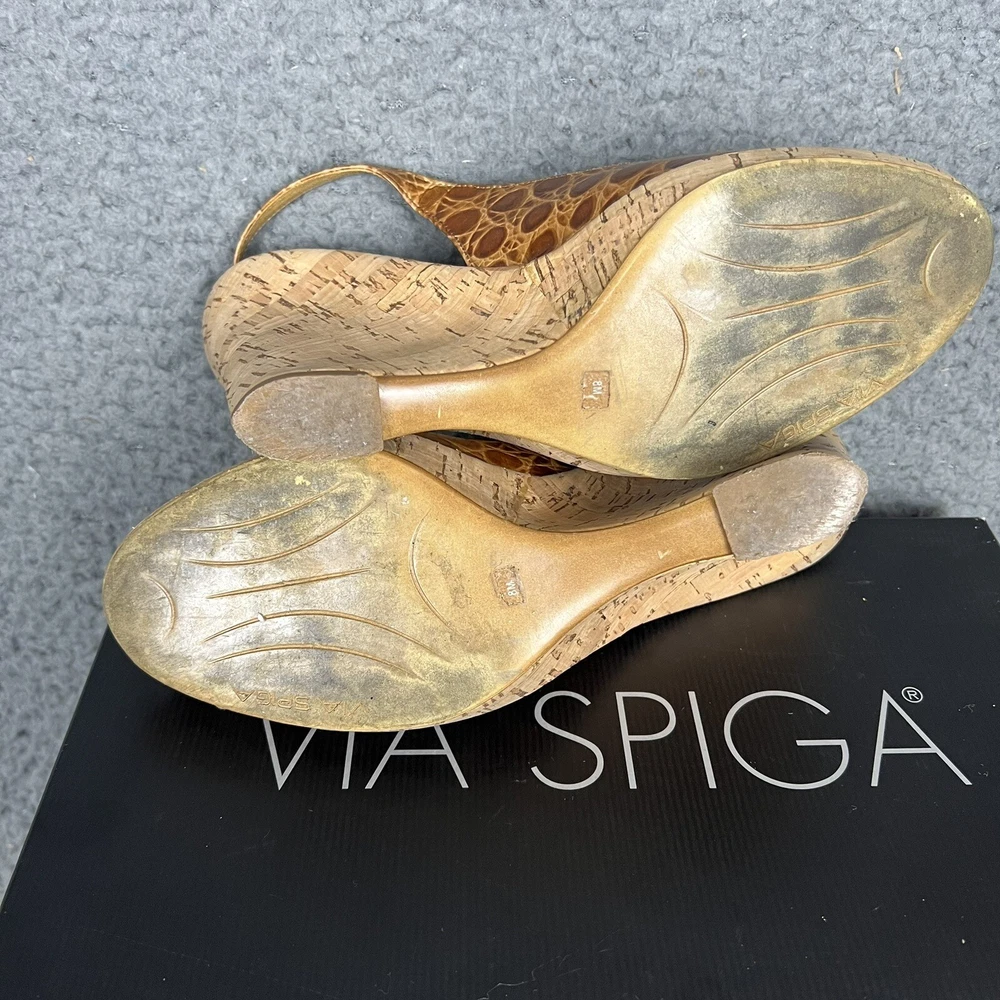 The VIA SPIGA Brown Faux Croc Leather Embossed Peep Toe Heel Wedges are stylish and versatile shoes perfect for a variety of occasions. With a high wedge heel and slip-on closure, these cork-lined heels feature a chic animal print pattern and retro design. Made of leather with a faux leather lining, these shoes add a touch of sophistication to any outfit, whether for a formal event or a casual night out. The peep toe shape and ankle strap detail make them a trendy choice for the fashion-forward woman.