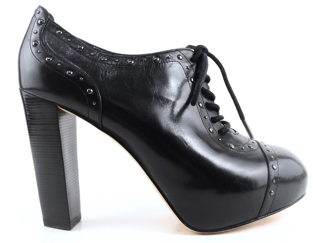 Theme: Designer Shoe Width: M Type: Heel Main Color: Black Style: Pump Sub Style: Booties Size Chart: Women's Shoes US Occasion: Casual, Party/Cocktail Heel Height: Ultra High (4 in & Higher) Material: Leather Toe Shape: Almond Toe Width: Medium (B, M) UPC: 093637765305 Brand Style: HEWITT gtin13: 093637765305 Heel Type: Block US Shoe Size (Women's): 9 Closure: Lace Up US Shoe Size: 9 Heel Style: Block Exact Heel Height: 4 1/4 in. Upper Material: Leather Brand: Via Spiga Season: Fall, Spring Fastening: Lace Up Accents: Studded DSB sku: A2166 Department: Women Toe Style: Round US Size: 9 Color: Black