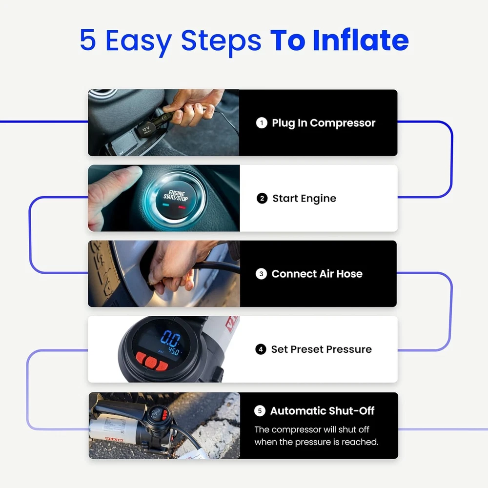 B R A N D N E W VIAIR Digital EVC85P Portable Air Compressor Tire Inflator for Car, SUV & Truck Preset Automatic Shut Off Feature 12V Road Tire Pump Air Compressor 60 PSI The VIAIR Every Vehicle Carry 85P - Digital 12 Volt Portable Air Compressor for All Vehicles The new and improved version of the customer favorite 85P delivers a digital gauge and preset pressure for easier-than-ever functionality. 5-Step to Air Up with Preset Pressure Feature (1) Push the plug into the cigarette lighter port in your vehicle's interior. (2) Start your engine. (3) Attach the twist-on chuck to the tire valve. (4) Set the desired pressure and wait for the tire to inflate. (5) The portable tire air pump will automatically shut off when the desired pressure is reached. Road Ready, Offroad Capable The sky's the limit with the EVC85P. Servicing all vehicle types, from sedans, sports cars, and small trucks, no vehicle in your garage will ever be without air. Includes a Presta valve adapter for bikes, balls and inflatables. Filling a 225/60/18 tire from 30 to 40 PSI in 1.08 minutes or less, the Every Vehicle Carry 85P gets you back on the road in no time. Great for Families Enjoy peace of mind as you send your teenager, college student and other family members off with a reliable, easy to use air pump. Ultra Portable with Canvas Carrying Case The EVC85P electric car & truck tire pump has a maximum dimension of 9.1 inches and weight of 4.3 pounds. Store it in your trunk or mount to your vehicle for easy access and never be without air. Conveniently stored in a durable canvas carrying case with top handle, the tire inflator air compressor is ready to use at any moment, whether you're at home, stopped on a busy roadway or out in the middle of nowhere. Choosing Between 12V Battery Clamps and Cigarette Lighter Plug: Pros & Cons The EVC88P uses alligator clips for a direct battery connection due to its higher current draw. In contrast, the EVC85P uses a cigarette lighter plug, drawing less current and allowing access from your car's interior. The choice depends on your preference. DIGITAL COMPRESSOR for ALL VEHICLES: The new & improved version of the customer favorite 85P, the Every Vehicle Carry 85P features a digital gauge and preset pressure with automatic shut-off feature. Now, every driver can experience VIAIR's legendary long-lasting performance and reliability with ease. HOW TO USE PRESET PRESSURE: (1) Push the plug into the cigarette lighter port in your vehicle's interior. (2) Start your engine. (3) Attach the chuck to the tire valve. (4) Set the desired pressure and wait for the tire to inflate. (5) The portable tire air pump will automatically shut off when the desired pressure is reached. INCLUDED COMPONENTS: 12V mini air compressor tire inflator has a 3 ft air hose, 10 ft power cord, built-in pressure gauge, deluxe carry bag, 3 inflation tips (3/16" nozzle, 5/16" nozzle, and needle adapter) stored on compressor, press-on chuck, LED light, and Presta valve adapter. RAPID, ACCURATE INFLATION: With the press of a button, it delivers a maximum working pressure of 60 PSI with a duty cycle of 20 minutes at 30 PSI; Free flow capacity: 1.26 CFM. Maximum Recommended Tire Size: 31". Fills a 225/60/18 tire from 30 to 40 PSI in 1.08 minutes or less and is 65% faster than leading competitors. Dimensions: 9.1″L x 3.1″W x 5.6″H; 4.3 lbs. SAFE & RELIABLE: Inflate tires on sedans, SUVs and sports cars. Even capable on small trucks and ATVs. Reliable, convenient and easy to use. Great for families and daily driver vehicles. So easy, anyone can use it. We Do Not Ship P.O BOX AND Outside of the Continental US.