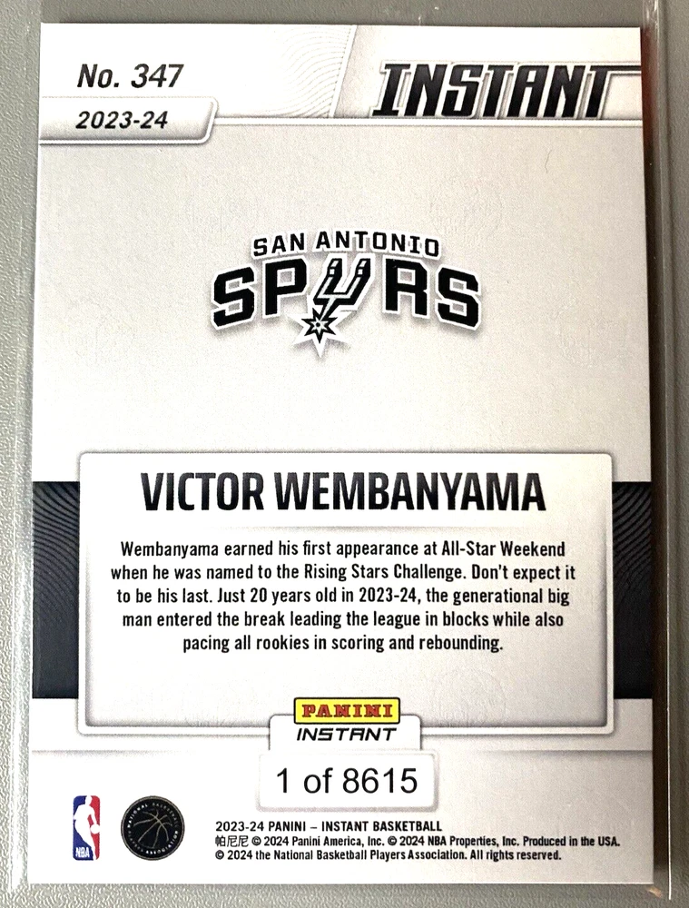 This is a rare and valuable VICTOR WEMBANYAMA 2023-24 Panini NBA Instant #347 RC Card SPURS SP /8615 Wemby trading card. It features the promising rookie athlete from the San Antonio Spurs team, Victor Wembanyama. The card is an original and authentic product from the Panini manufacturer, with all the necessary card attributes for a successful collection. The card is part of the Panini Instant series and is a single product that will surely be a great addition to any sports trading card collection. It is a modern era basketball card, manufactured in the United States, and is perfect for any fan of the sport. This card is a must-have for collectors and enthusiasts alike, and is sure to be a valuable addition to any collection.