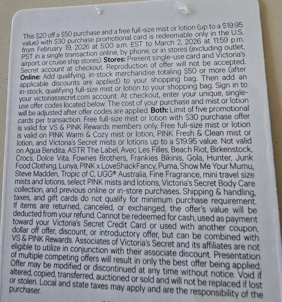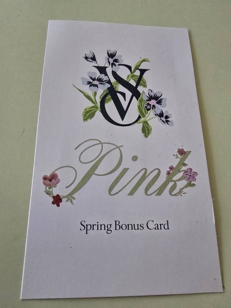 Victoria's Secret and PINK coupon for $20 off $50 Spring Bonus Card PLUS Full Size mist or lotion! Starting February 19 - March 2, 2026! Please read the terms and conditions on the back of the card! Will send to you thru here so you can use right away! Thanks for looking! ***this is for 1 and 8 are available***