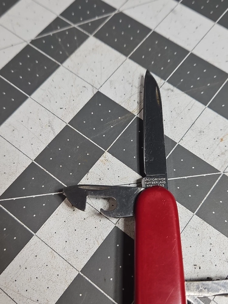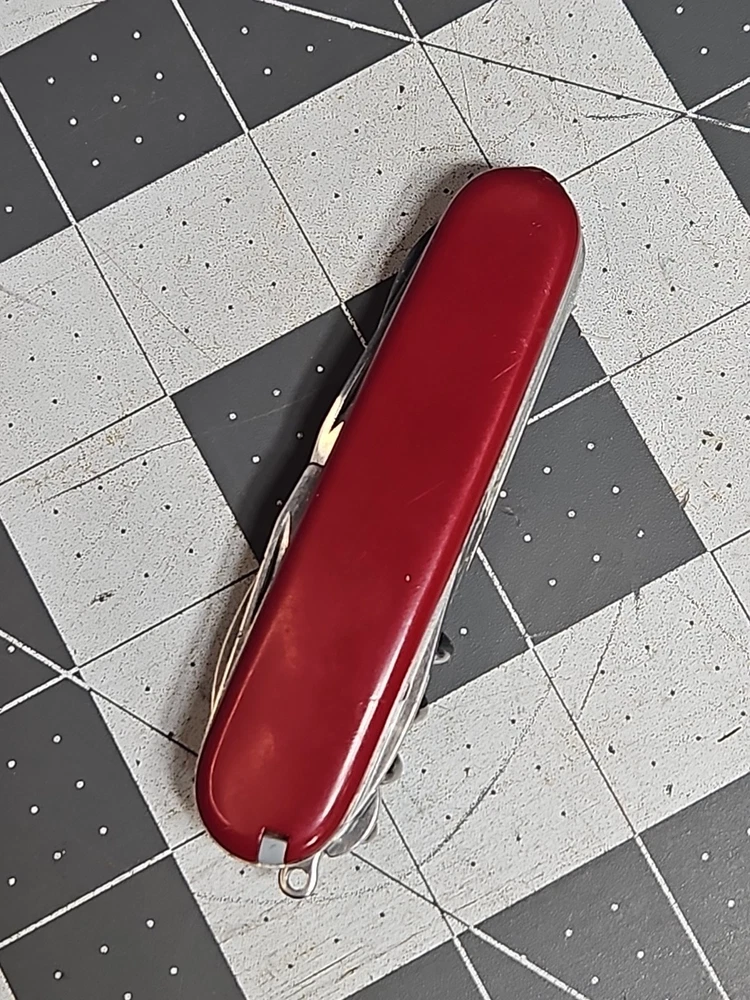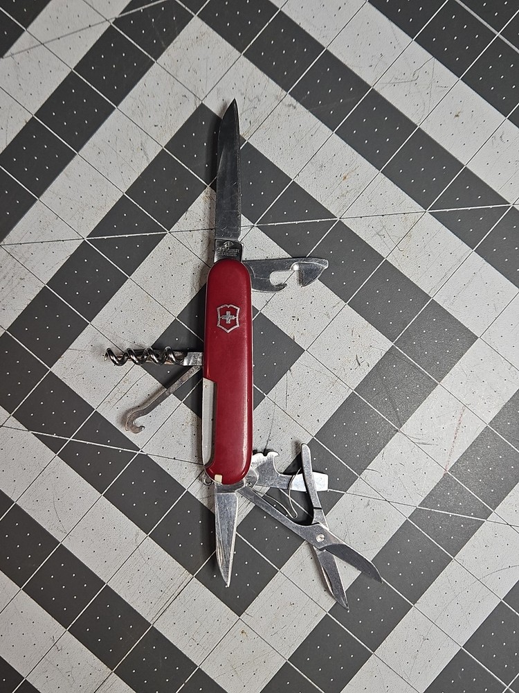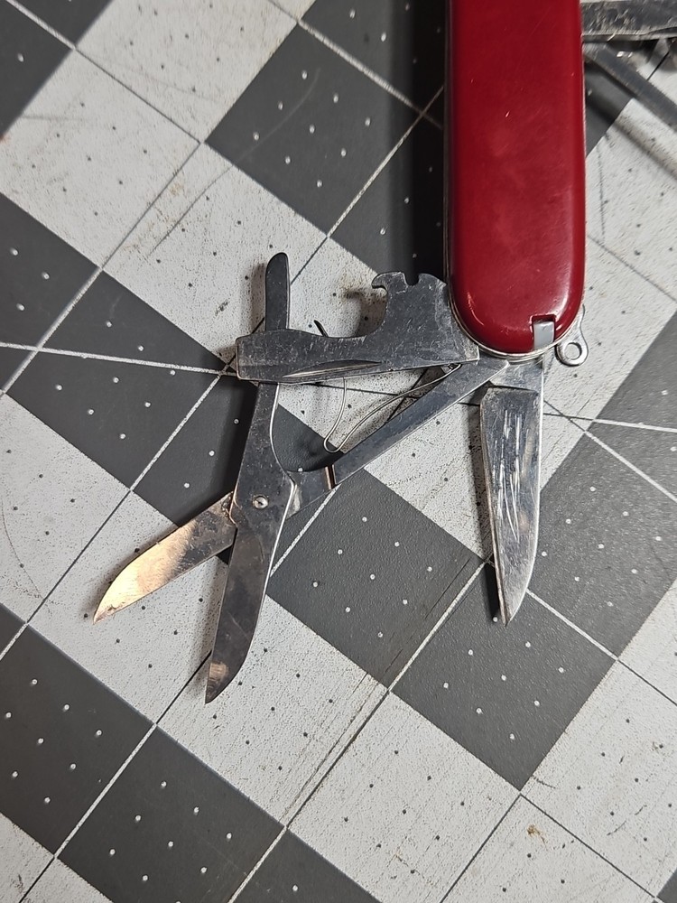 VICTORINOX "Huntsman" Swiss Army Knife 15 Functions Officier Suisse GUC Worn Good used condition. Light wear from age and use. Markings from age and use. See pictures Product will be shipped timely and packaged with care. Offers are encouraged. Please feel free to reach out with questions. Please see pictures. Thank you. The VICTORINOX Huntsman Swiss Army Knife is a 15-function tool that is perfect for any outdoor enthusiast. It features a manual opening mechanism and three blades made of high-quality plastic. The red handle adds a pop of color to the knife, making it easy to find in a crowded toolbox. This knife is a great addition to any collection and is sure to impress. HLB2 hunts