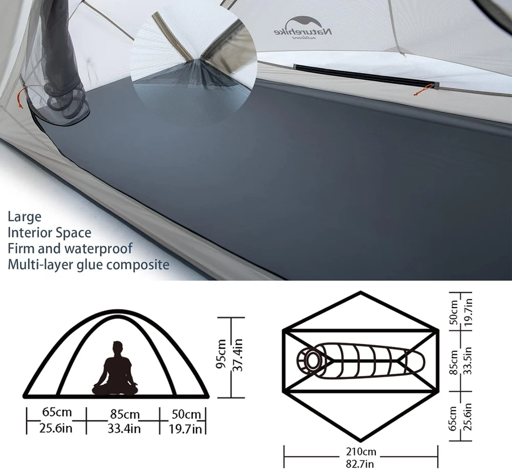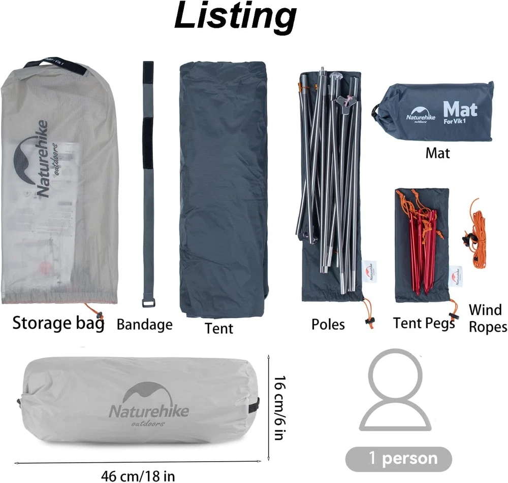 Store New Arrivals Add to Favorite View Feedback Contact VIK 2 Person Ultralight Backpacking Tent, Ultralight Tent for 2 Person, Two Person Tents for Camping, Hiking, Backpacking Description Style Modern Special Feature Portable, Ultralight Water Resistance Technology 2000 millimeters Floor Area 210 Centimeters Number of Doors 1 Occupancy 1 Person Occupant Capacity 1 Support Pole Attachment Mechanism Pre-Attached Maximum Height 37.5 Inches Assembly Time 5 minutes Product Dimensions 82.7"L x 78.8"W x 37.4"H Pole Material Type Aluminum Number Of Poles 1 Material Nylon, Aluminum Installation Type Free Standing Age Range (Description) Adult Seasons 3 Season Tent Floor Material Nylon Form Factor Backpacking tent for 1 Person Item Package Dimensions L x W x H 18 x 8.5 x 4.25 inches Included Components Carry Bag, Gear Pockets, Stakes Closure Type Zipper Model Name Vik Number of Vestibules 1 Floor Width 85 Centimeters Water Resistance Level Waterproof Fabric Type Nylon Item Weight 2.9 Pounds Size 1 Person Package Weight 1.33 Kilograms Rainfly Material nylon Number of Windows 2 Item Dimensions LxWxH 82.6 x 33.4 x 37.4 inches Part Number 6927595733844 Sport Backpacking, Camping & Hiking, Hiking Stake Material Aluminum Assembly Required Yes Is Waterproof True Minimum Trail Weight 2.3 Pounds Base Material Nylon Color 1P-white Shape Round Number of Stakes 9 Design Camping Tent Ultraviolet Light Protection [Inferred] Silicone-coated nylon material provides some level of ultraviolet light protection Recommended Uses For Product Backpacking, Camping & Hiking Floor Length 19.17 Inches Model Year 2019 Number of Rooms 1 Product Care Instructions Hand Wash Number of Guylines 3 Nylon Imported Ultralight 1 Person Tent : Weight under 3lbs: total weight about 2.95lbs(1342g), small packed size:18 x 6 x 6 inch, ultralight for 1 person backpacking, camping, hiking,trekking and cycling. Easy Set up Free Standing Structure: It’s super easy to set up, even for one has no camping experience,It takes less than 5 minutes to set this up even when use it the first time. Waterproof and Windproof: Tent fly is made of ultralight 15D nylon with silicone coating, waterproof 3000mm; Tent bottom is made of 20D nylon with silicone coating, waterproof 4000mm; with all the corners seam-taped, the tent provides a great waterproof performance in bad weather.Tough and strong aluminum alloy poles keep the tent firm and stable in windstorm. 【Perfect Detail Design】 There are some small magnets along with the door of the tent, which can be automatically closed. And the tent has 3 guy rope buckles and an enhanced version of the 3-way joint on the pole for easy pulling of the rope; The feet are made of high-quality fasteners, which are distinguished by different colors; it's a must-have for your next adventure! Roomy One Person Tent: tent dimension:82.7"L x 78.74"W x 35.43"H, enough spacious for one person sleeping comfortably, and the sided vestibule space is large enough for storage one person’s camping gears. Great Ventilation: this ultralight one person tent is a single layer tent with good ventilation, two ceiling vents provide more air flow, no water condensation inside. Tent with Vestibule: With two trekking poles or two sticks to build a small sun shelter, provide more shade area to put your camping gears.(Notice: the trekking poles are not included. You need to buy separately.) Footprint is Included: This backpacking tent comes with the footprint for the tent, you don’t need to purchase separately. And you will also get Pegs x 9, wind ropes x 3, 7001 Aluminum alloy poles x 1 set, tent x 1, strapping tape x 1, carry bag x 1 Product Description Good Ventilation With two ventilation windows at the top of the tent, provide more air flow, effectively reduce the water condensation problems. Interier Storage Space With storage bags inside, to storage your telephone or some other small goods, get it conveniently. Waterproof Coating Tent fly is made of 15D nylon with silicone coating, waterproof 3000mm; Tent bottom is made of 20D nylon with silicone coating, waterproof 4000mm; with all the corners seam-taped. Two Way Zippers The zippers are excellent quality, and zip easily. Aluminum Alloy Poles Made of tough and strong aluminum alloy poles keep the tent firm and stable in windstorm. Ultralight Backpacking Tent Naturehike Vik 1 Person Tent is the Ultralight Tent for one Person, total weight under 3lbs; Super easy to set up, and with great waterproof windproof performance. Packs down small and lightweight for solo backpacking, camping, hiking, cycling. Naturehike 1 Person Backpacking Tent Add to Cart Add to Cart Add to Cart Add to Cart Customer Reviews 4.2 out of 5 stars 452 4.4 out of 5 stars 1,290 4.4 out of 5 stars 687 4.4 out of 5 stars 1,290 Price $140.08 $ 140 . 08 $107.10 $ 107 . 10 $84.99 $ 84 . 99 $80.99 $ 80 . 99 Capacity 1 Person 1 Person 1 Person 1 Person Weight 2.95lbs 3.3 lbs 3.63lbs 3.74lbs Dimension 82.7 x 78.74 x 35.43 inch 82.7 x 43.3 x 39.7 inch 80.7 x 37.4 x 43.3 inch 82.7 x 43.3 x 39.7 inch Packed Size 18 x 6 x 6 inch 16.1 x 5.1 x 5.1 inch 15.7 x 5.9 x5.9 inch 16.1 x 5.1 x 5.1 inch Tent Material 15D silicone coated nylon 20D silicone coated nylon 20D silicone coated nylon 210T polyester ABOUT US We offer the best prices around on high quality products. Our E-store includes media such as books, movies, music and games while offering electronics, toys, sporting apparel, clothing, tools, general home, garden items and more. SHIPPING We are always working hard to ensure your package arrives as soon as possible. Please understand that some factors like weather, high postal traffic, and the performance of shipping companies are outside of our control. We offer free shipping to the lower 48 states and ship within 2 business days of payment, usually sooner. We do not accept P.O. Boxes. Please provide a physical address. For shipping outside of the continental USA, we only use eBay's Global Shipping Program.The item is 