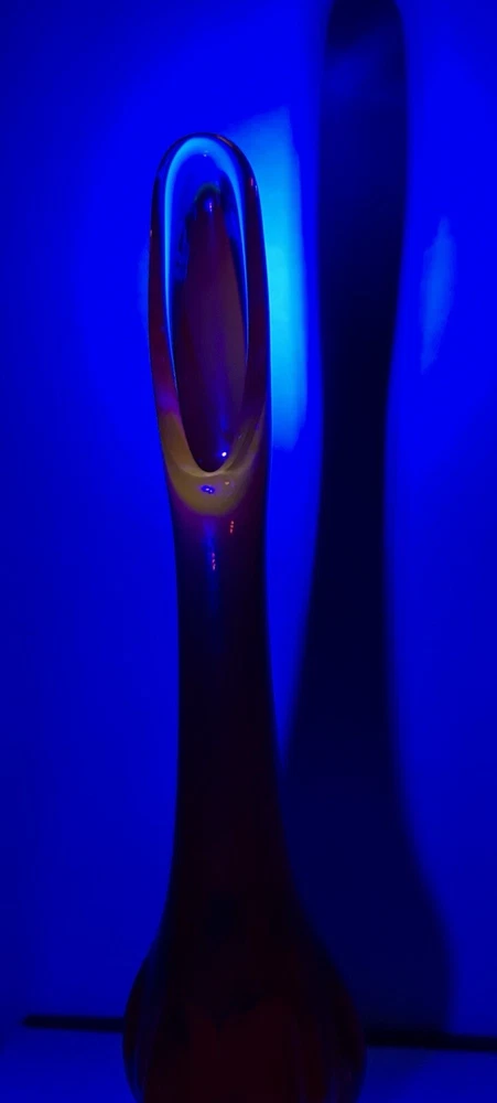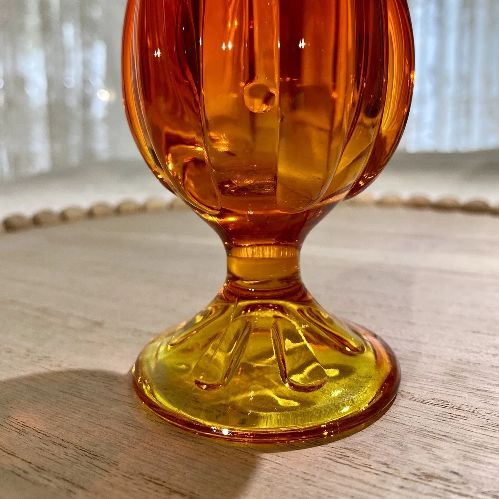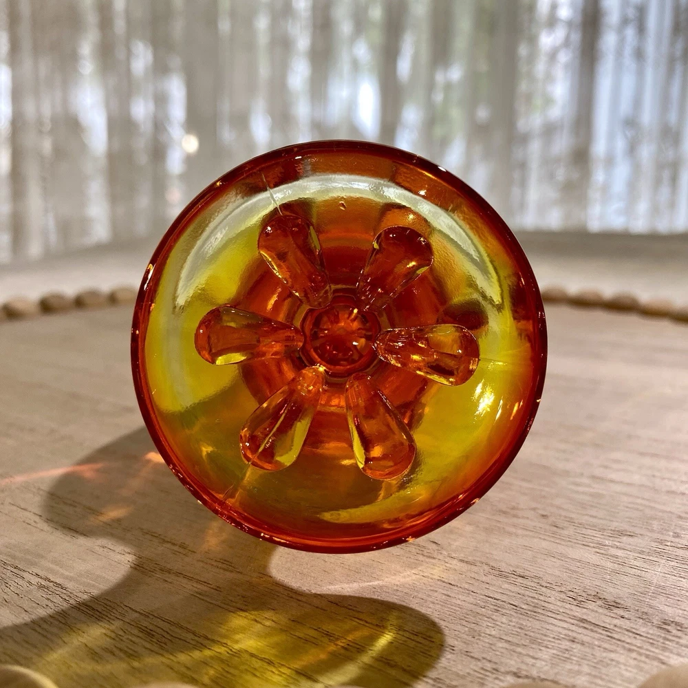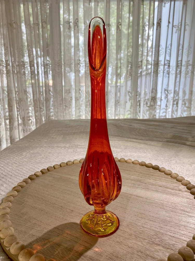EDIT: If you like this listing, see a similar listings in 18.5 inches - available at my eBay store YUNI SNOW. This item is a vintage VIKING GLASS, acquired in the early 2000's. It features a handmade amberina swung vase. Amberina is an American art glass that refers to a graduation in color. The colors of this vase transitions from red orange to an orange yellow base, and it features the persimmon 6-petal design on the pedestal base. The glass is removed from the base mold and "swung" while still in its hot and elastic form to its desired length. The item glows under UV lighting. Made in the U.S.A. Height: 12 in Diameter: 2.75 in Weight: 11.9 oz These measurements are Seller's best approximations. Vintage. Pre-owned and in excellent condition. No flaws observed. Please see all photos. SHIPPING: From Hawaii. All items will be weighed, photographed and/or video-recorded while item is prepared for shipment. Shipping of items will always prioritize the care and safety of the item, but at times will use recyclable materials (to include boxes and packaging materials). The packaging may not be aesthetically pleasing, but will be safe and secure. DISCLAIMER: All photographs provided do not use filters with any intent to alter or improve the appearance or condition of the item. All items are inspected carefully and flaws are photographed and presented as transparently as possible to The Buyer. All measurements provided are done to the best of the ability by The Seller. If you have any further questions pertaining to the description of this item, please contact The Seller BEFORE purchasing or placing an offer.