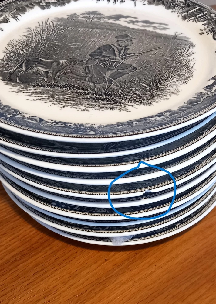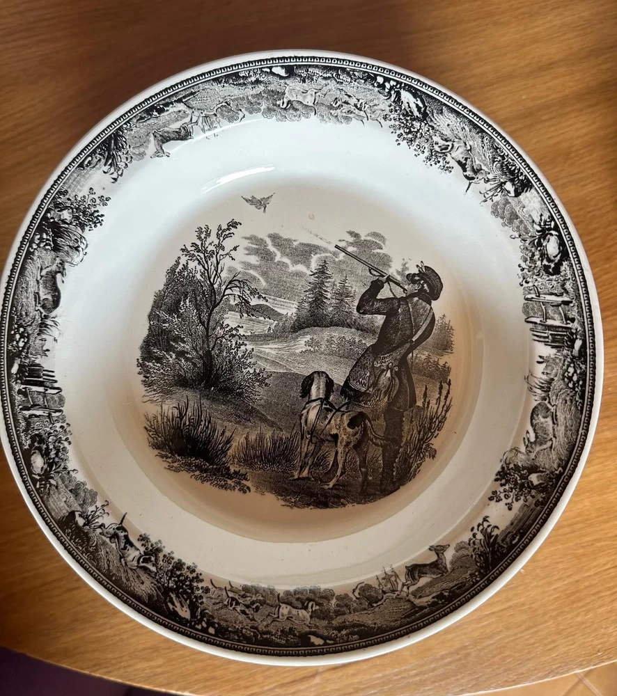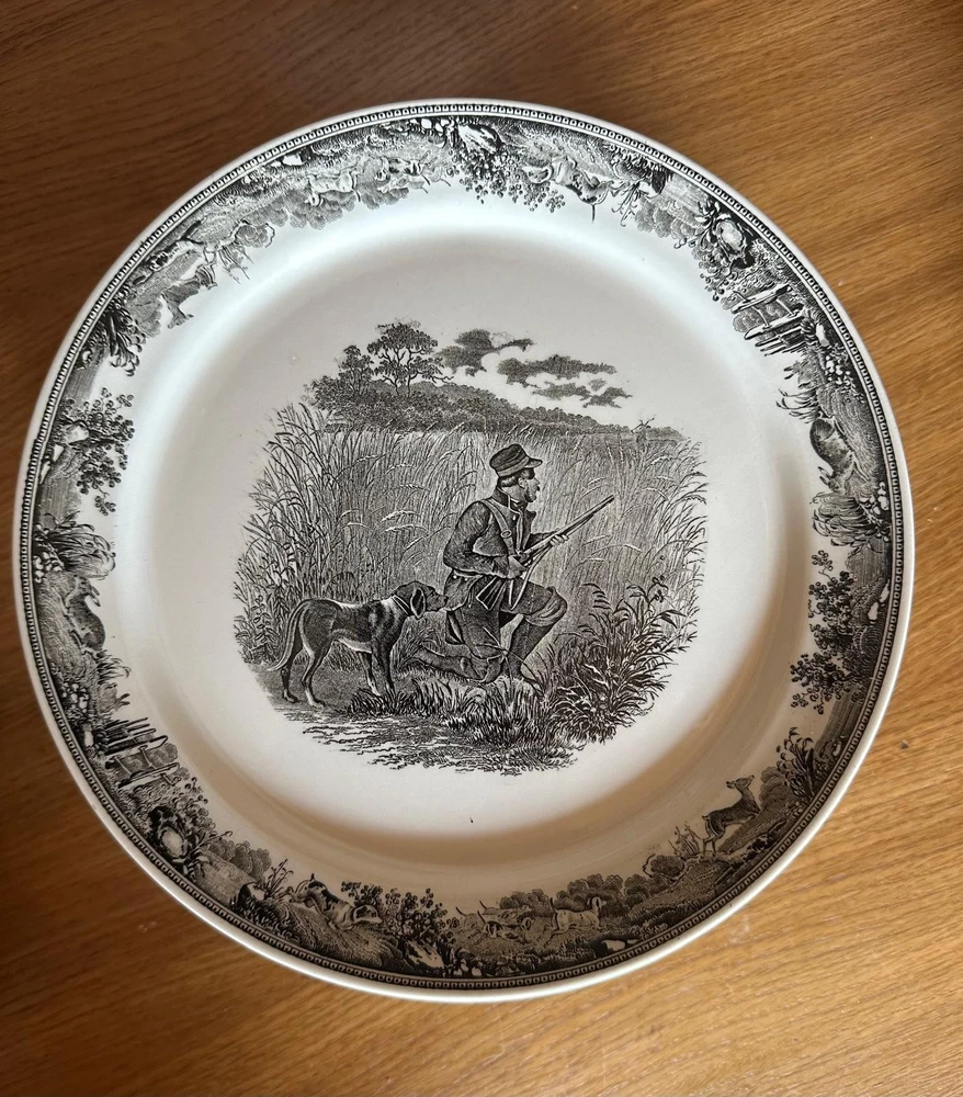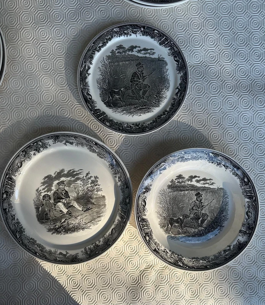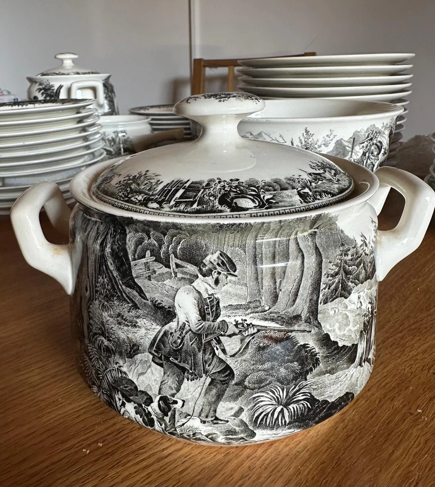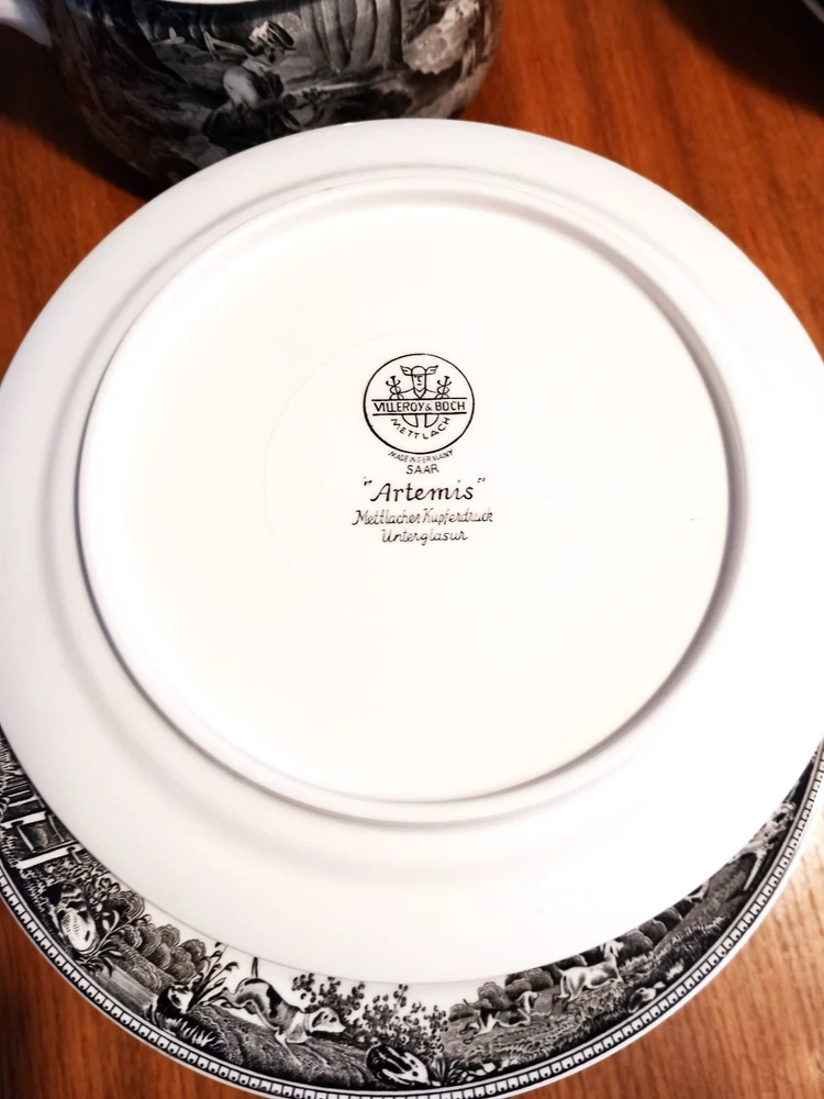 Collezione Artemis, anni ‘50/’60, manifattura tedesca, calcografia su lastra rame applicata sotto smalto. Motivo: scena caccia tradizionali. Monocromatico nero su bianco/crema. Prestigioso servizio completo per 10 persone, per un totale di 47 pezzi così suddivisi: • Piatti fondi – 10 pezzi • Piatti piani – 20 pezzi • Piattini dessert – 10 pezzi • Vassoi di portata, varie dimensioni: 3 pezzi • Zuppiere con coperchio, varie dimensioni: 2 pezzi • Terrina con manico; 1 pezzo • Porta frutta: 1 pezzo Nel suo assieme, il set appare in ottime condizioni. Si notano due scheggiature come da foto (su un piatto piano ed uno da dessert) ed alcune macchie del tempo coerenti con l’età ed il materiale. Naturalmente disponibile a fornire ulteriori dettagli, foto e/o dimensioni dei componenti. INFO per la CONSEGNA. Le dimensioni totali (approssimative) sono: 60x60x60 cm, 25 kg. Se ritiro a mano, la zona principale di riferimento è Roma Sud (Eur). Se spedito, il costo è a carico acquirente: quanto indicato è di riferimento, ma il valore definitivo sarà da valutare e concordare in funzione della destinazione finale (Italia o estero).