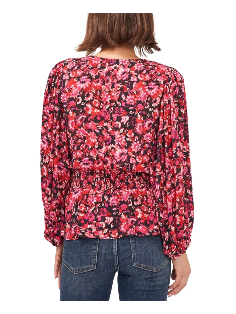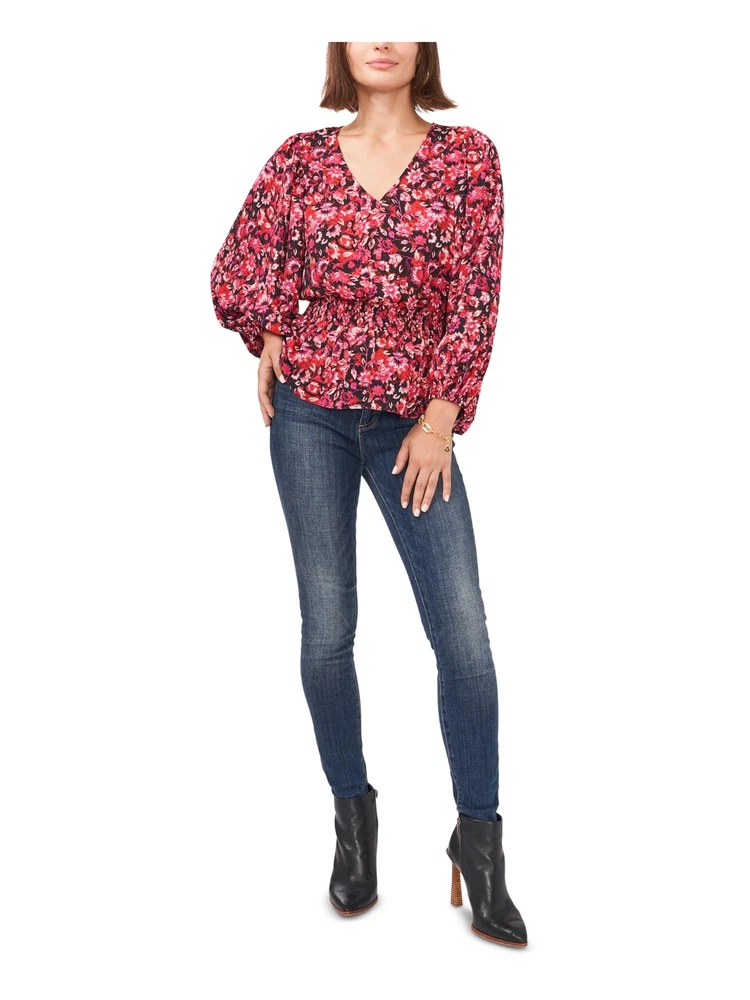 VINCE CAMUTO Womens Black Smocked Floral Blouson Sleeve V Neck Peplum Top XS