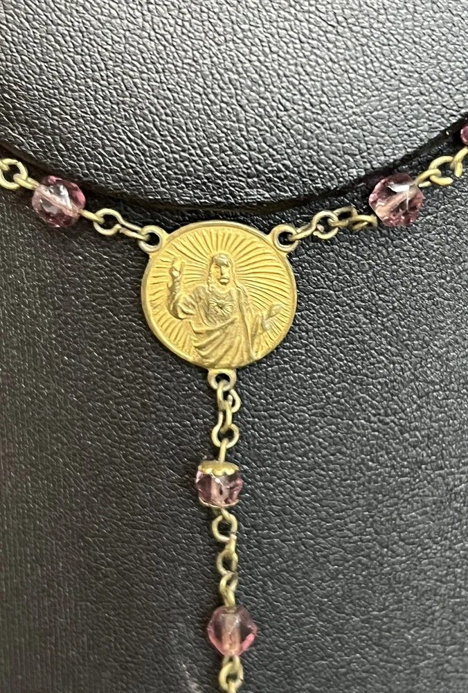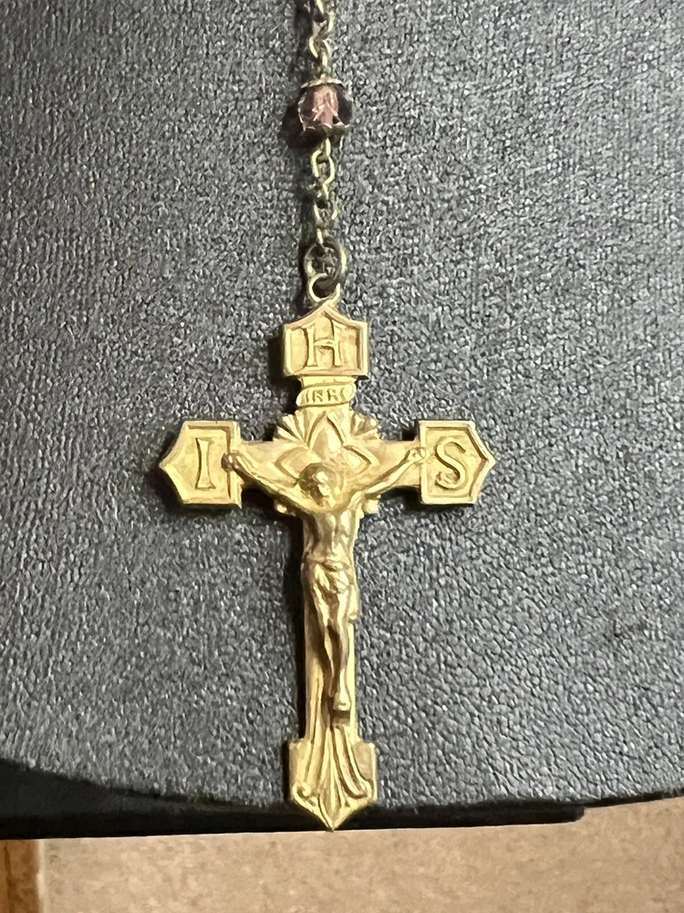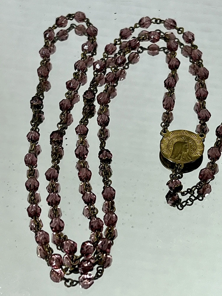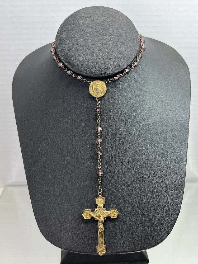 VINTAGE 18.5" Rosary Amethyst / Purple Beads Catholic Cross Necklace. Measures approx. 18 1/2" from the bottom of the cross to the top bead. Please see my pictures and ask any questions. WE WILL DEFINITELY COMBINE SHIPPING ON ANY OF OUR AUCTIONS! PICK YOUR ITEMS OUT AND I WILL SEND A COMBINED INVOICE.