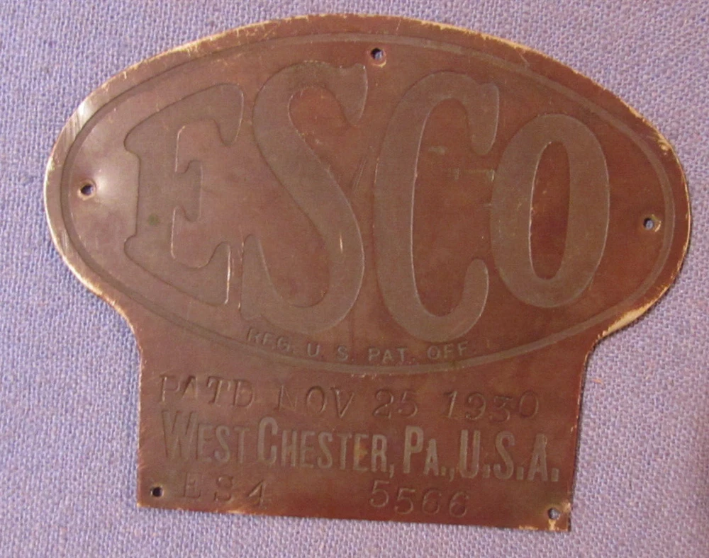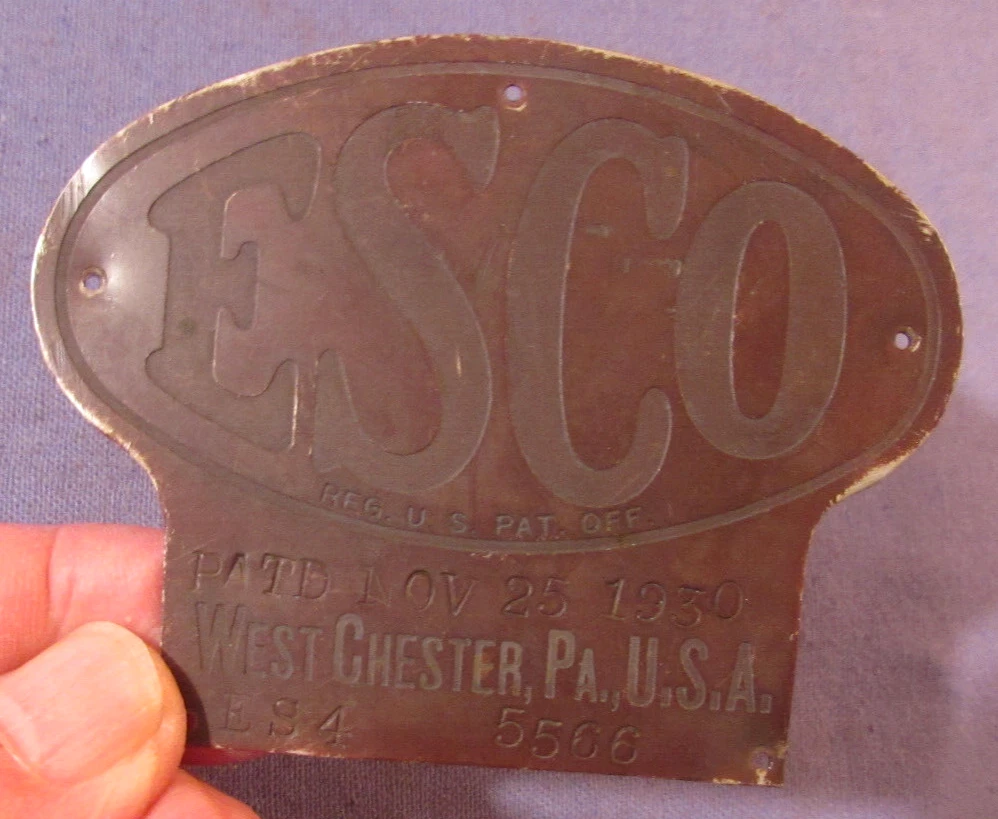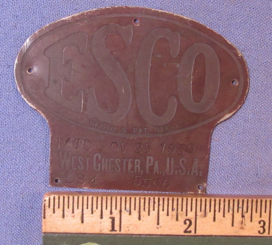 VINTAGE ESCO WEST CHESTER PA METAL NAME PLATE -- PAT. NOV. 25 1930 -- HAS 5 DRILLED HOLES AT EDGE FOR ATTACHING TO PRODUCT -- 3 1/8 INCHES IN WIDTH BY 2 1/2 INCHES IN LENGTH -- GOOD CONDITION --- ANY QUESTIONS PLEASE EMAIL US