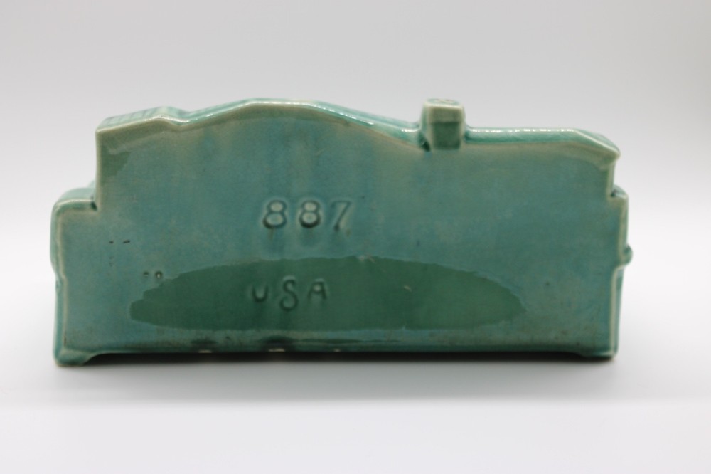 The Vintage 1950s Brush McCoy Pottery Green Ranch Planter #887 is a unique piece of decorative pottery from the United States in the Mid-Century Modern style. Made of ceramic with a glossy green finish, this rectangular planter features a Brush pattern and is adorned with an incised backstamp. With its nostalgic ranch theme and production technique of pottery, this original vintage piece is a charming addition to any indoor space, measuring 11 inches in length and 5 inches in height.