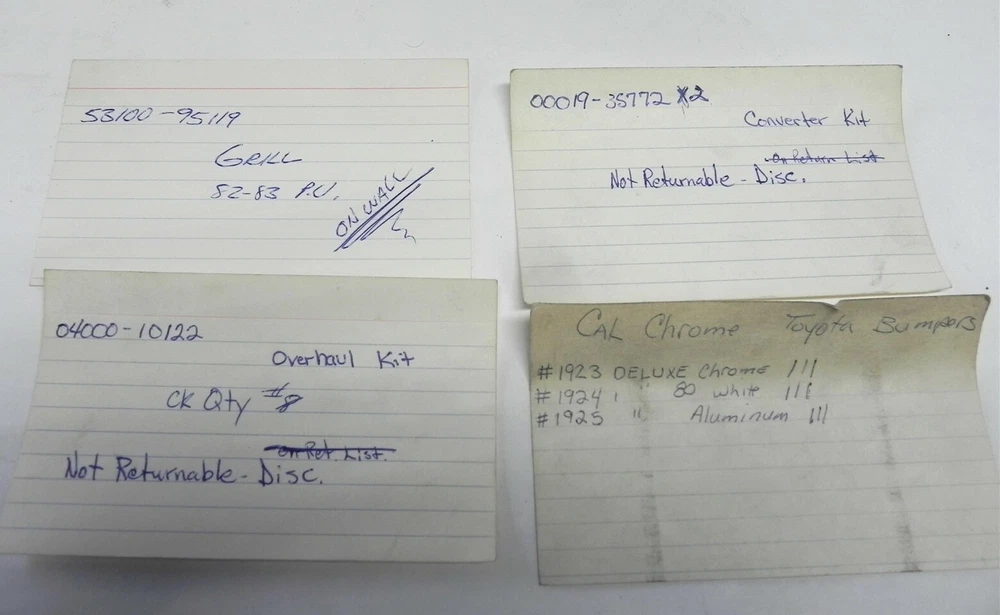 VINTAGE 1960S-70S HANDWRITTEN TOYOTA DEALER SHIPPING/PARTS DEPT CARD FILE VINTAGE 1960S-70S HANDWRITTEN TOYOTA DEALER SHIPPING/PARTS DEPT CARD FILE See photos below for details. You may be interested in our other eBay listings . Powered by SixBit's eCommerce Solution