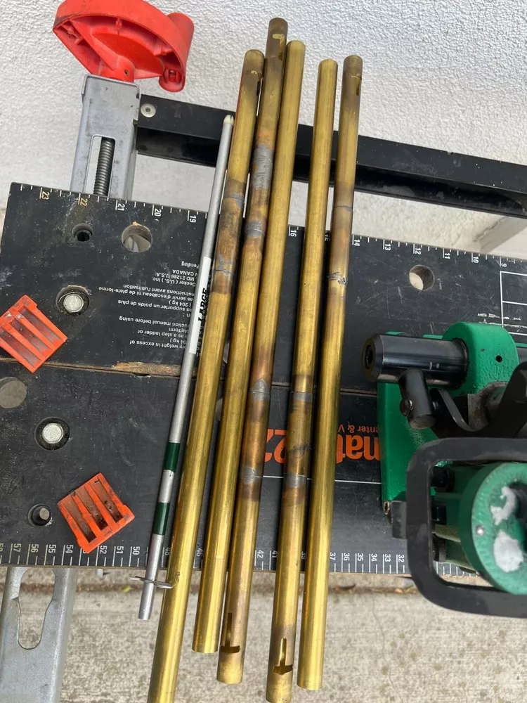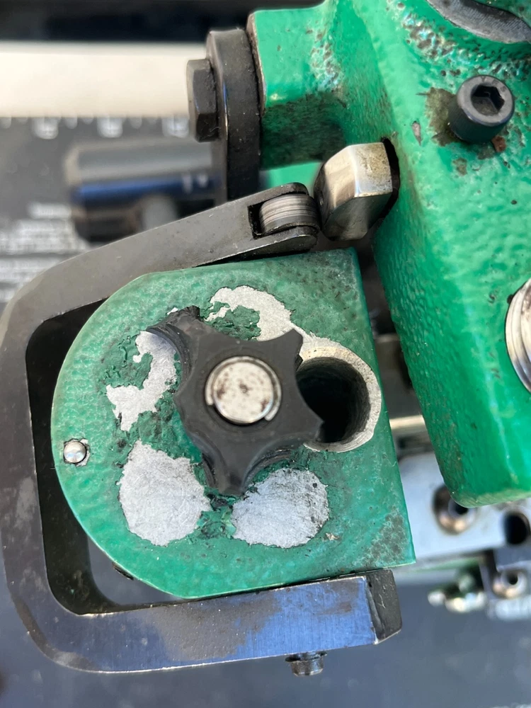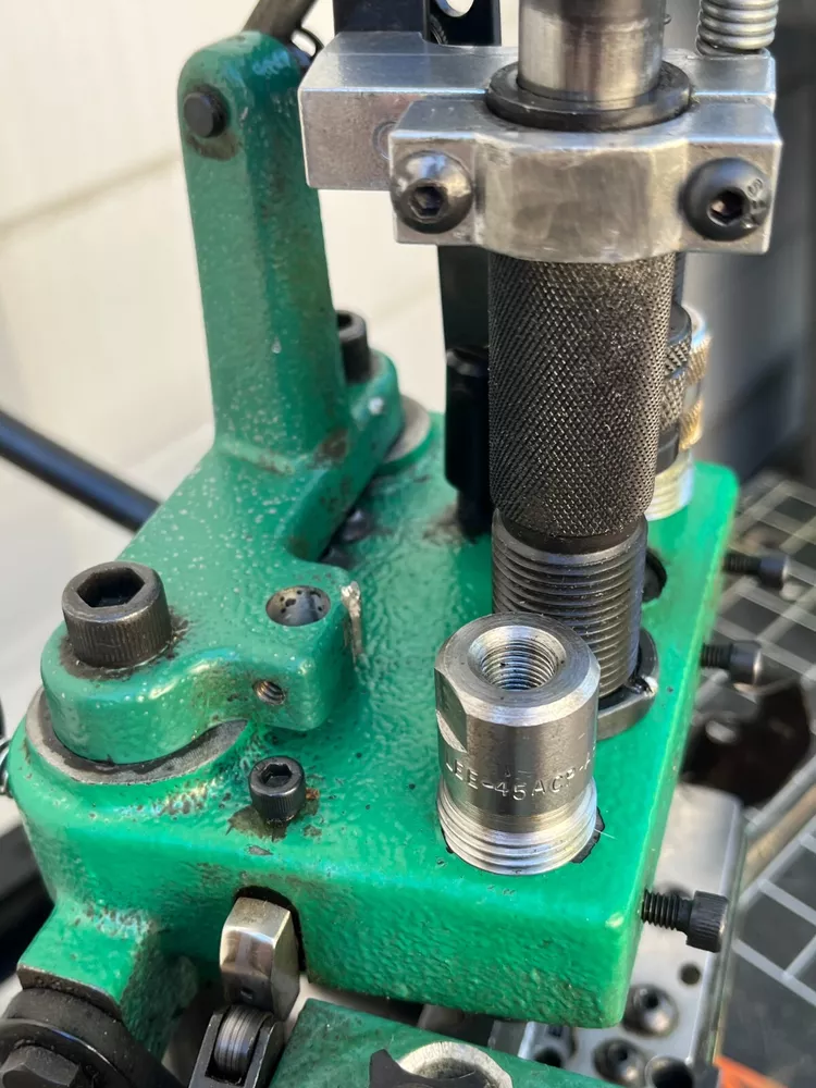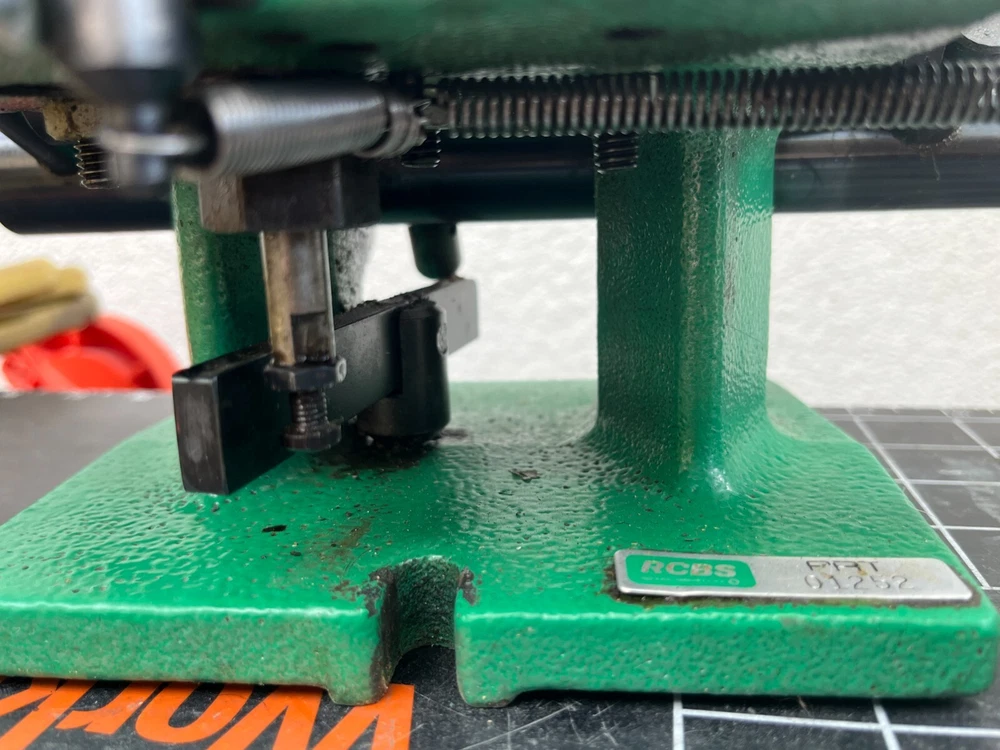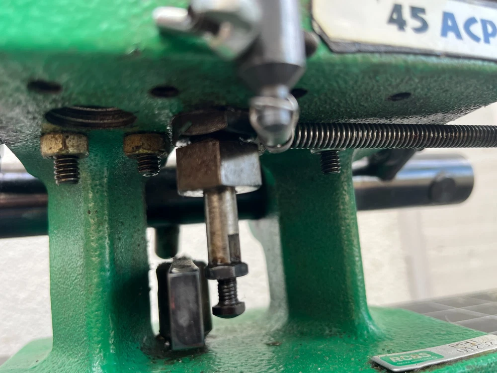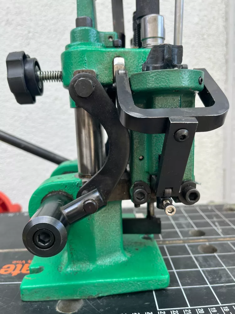 Vintage RCBS Green Machine inline progressive reloading press which was set up in .45 acp. The original owner made some modifications to it including upgrading to a Uniflow powder measure, tube primer feed, 8 ball handle and brass loading tubes. I t's out of adjustment or needs some TLC. Case advance is off a bit and it's not centering over the primer seater nor is it fully advancing the piece of brass I tested it with. Possibly the case holder bars are out as well. Case advance arm will jam if that lower adjuster bolt turns sideways. Powder measure is not actuating but maybe it needs brass to dump? The primer tube is very close to the new powder measure, not sure if there is a conflict when working the press. The case feed has a broken bottom plastic tube retainer and missing the top one. Plastic powder hopper has a crack but RCBS still has these available. Lee carbide sizing die and a Lyman seating die. Press #01252. You will need to disassemble, clean, lube and adjust to get it up and running. I will be listing more of these in the near future but different calibers .45 Colt, .44 Special/Magnum, .38 S&W, 9mm, and .357 Magnum. Please refer to images. This press is very heavy, in excess of 30 lbs. and will be partially disassembled for shipping which will be two insured Priority mail boxes. Pickup is an option but not listed on the shipment methods. Please feel free to discuss before purchase. Glad to combine freight when possible, please message me prior to paying for an invoice with combined freight amount. USA shipping only. Message any questions or for more images. Thanks for looking!