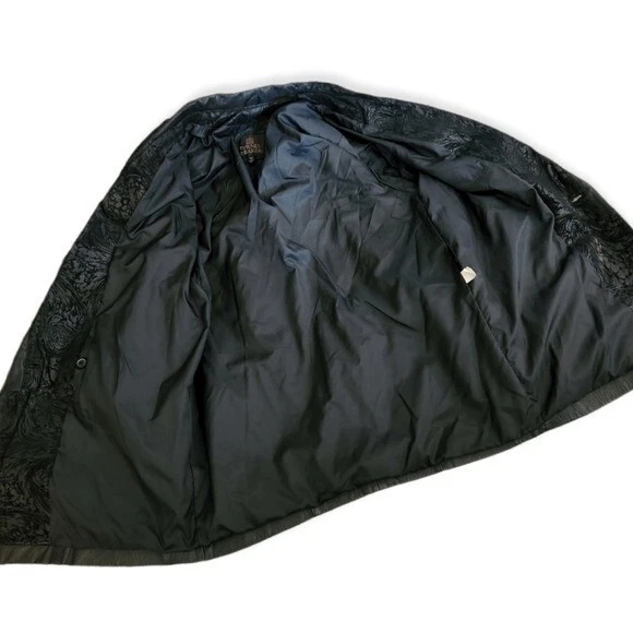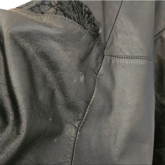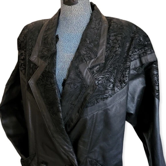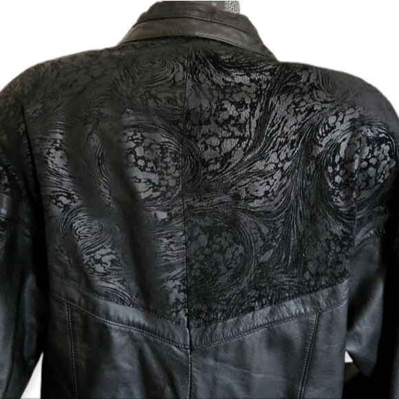 This leather coat is so cool! Vintage as anything, black leather with a paisley-floral style embossed detail around the yoke or shoulders. This does have shoulder pads. It's in very good condition with just a few light spots on one side (puctured)pictured. They are present but not easy to see. Please note that the fit is Oversozed, so the shoulders are bigger and the sleeves a bit shorter. Approximate measurements: Chest - 23" Length - 31" Sleeves - 19" Shoulders - 26" Around the hips area is about 21"