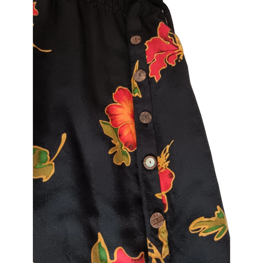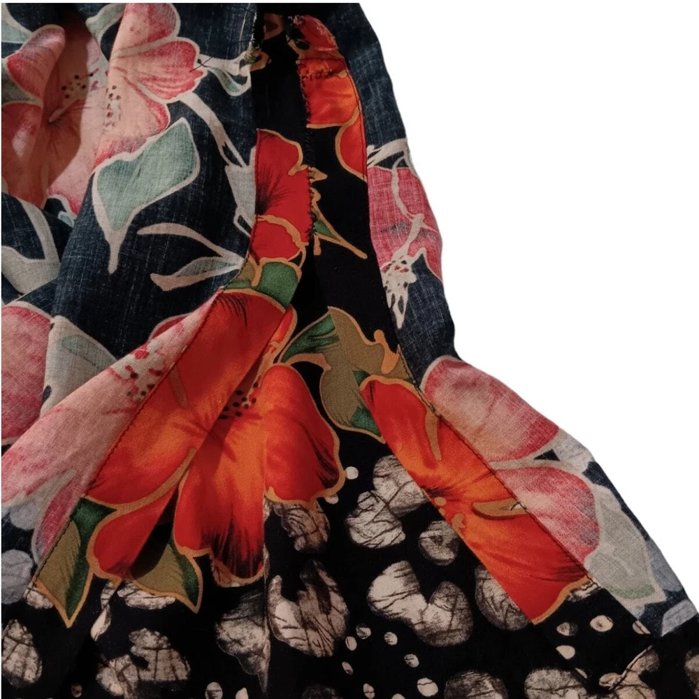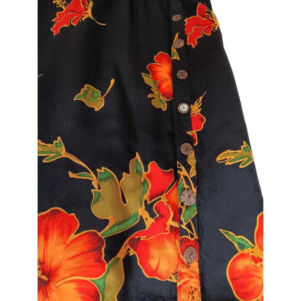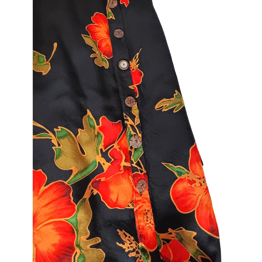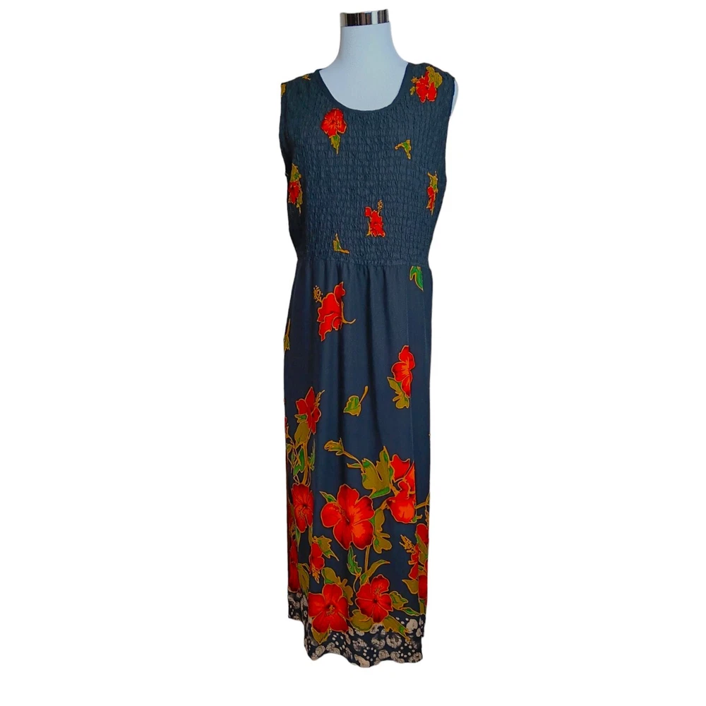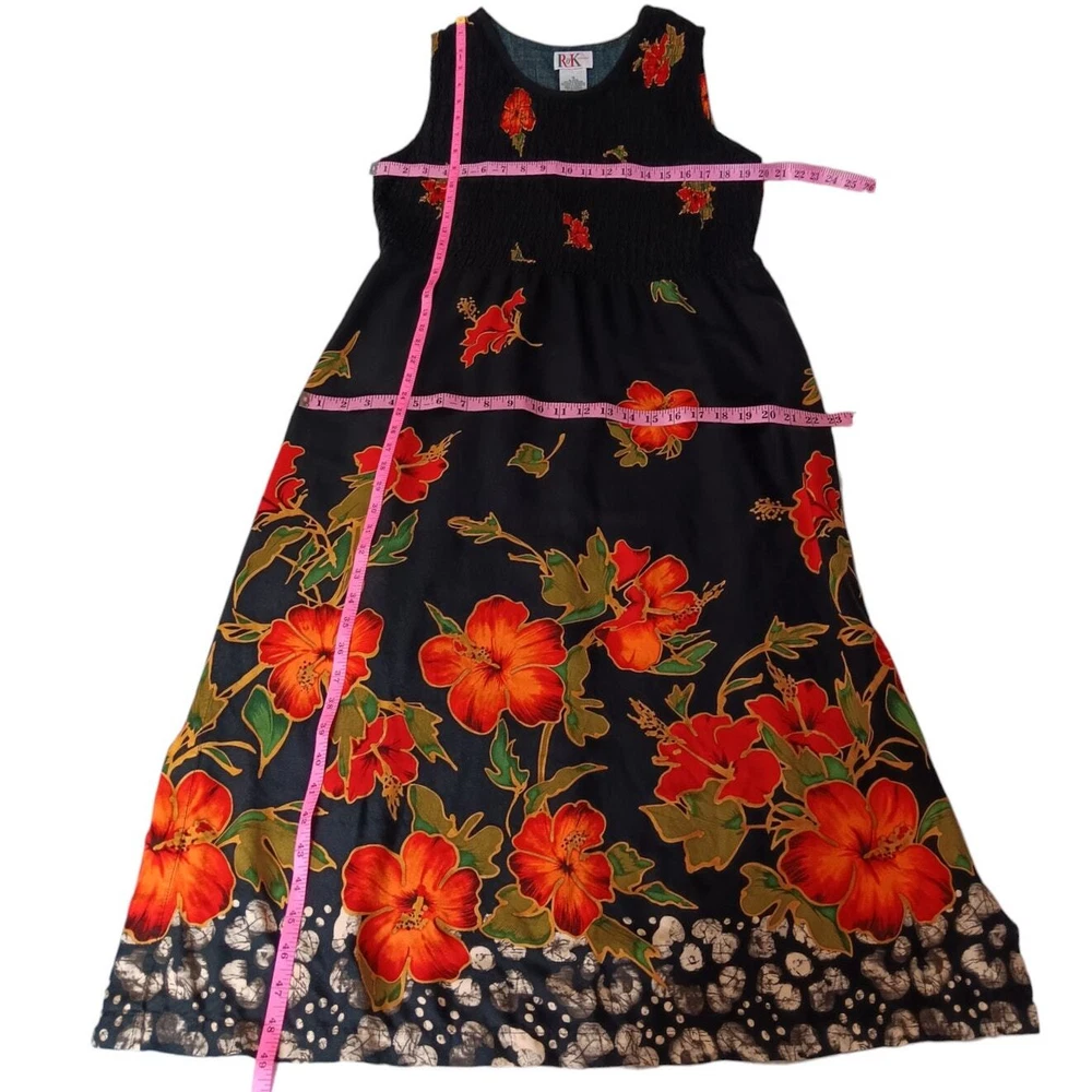 Gorgeous, vibrant vintage dress from the 1990's era. Beautiful soft fabric and flattering design! Zoom in on the adorable mismatched (purposeful) button embellishment. In great vintage condition with only faint signs of wear/laundering. Note: The side slits have been partially sewn to make them shorter, but this can be taken out if you prefer higher slits. Please review measurements in photos before buying. VINTAGE 1990s Maxi Dress Smocked Front Small attached tie belt in back Size 12 (see measurements in pics) Tropical Floral Hibiscus Design Black Orange Brand: R&K Originals Keywords: 90's 1990's VTG Long Tall Cottagecore Boho Bohemian Tropical Travel Vacation Holiday Event Cruise Hawaii Garden Romantic Feminine Girly Office Career Work Sustainable Minimalist Dressy Casual Secondhand Used Preowned Smoke-free/pet-free home Color/texture may vary due to lighting/devices Items may show wrinkling from packing/transit ID:B2/10