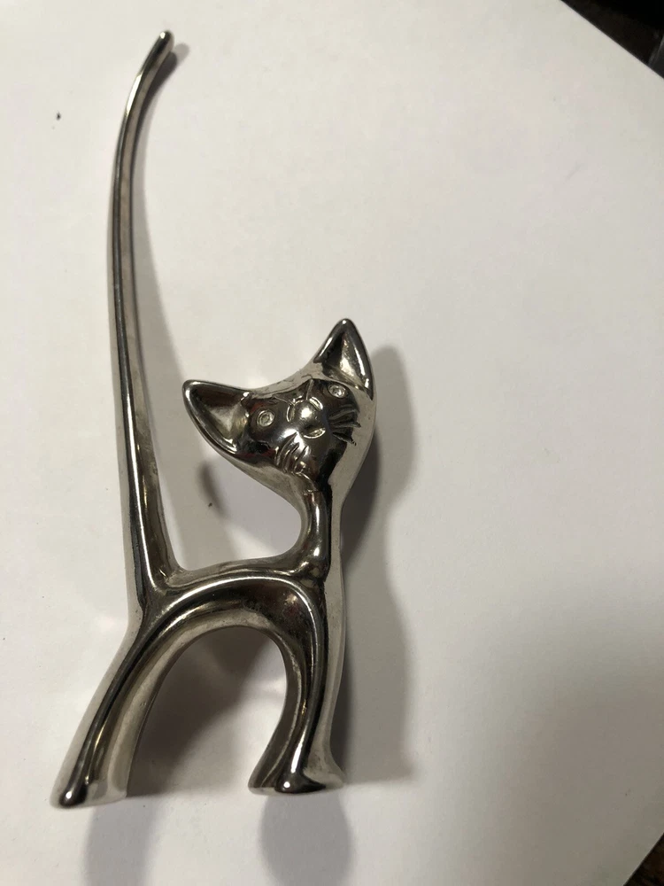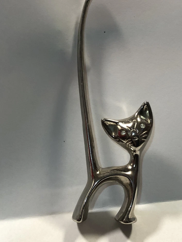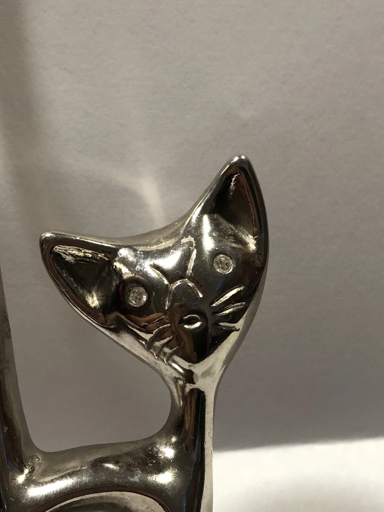 This vintage ring holder is a silver tone long tailed kitty with rhinestone eyes. It is a lovely ring holder and is perfect for unisex adults or children . The holder is made of metal and is in the shape of a cute cat figurine. This vintage piece is from the 40's and 50's and is a great addition to any jewelry collection. Please feel free to ask any questions prior to purchasing , all sales are final. If we have made a mistake, please contact us prior to leaving feedback and we will take care of it. Thank you kindly.