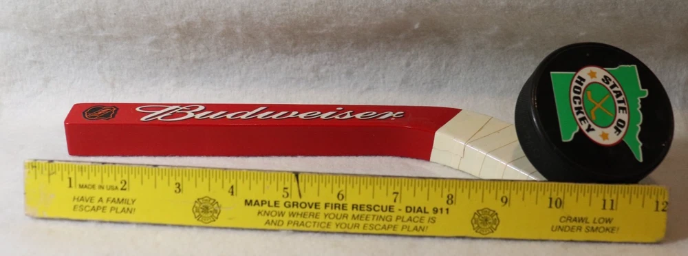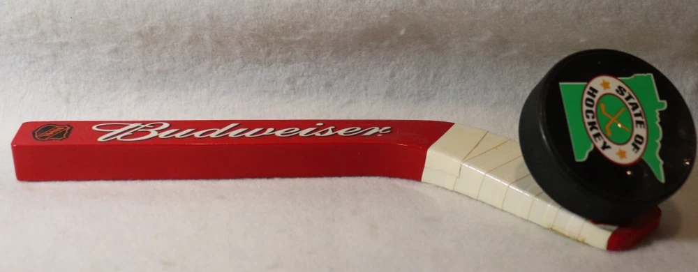 Up for Sale from "BUDWEISER" is a Beer Tap Pull, featuring a Hockey Stick & Puck (touting the "STATE OF HOCKEY" against a background of the State of Minnesota. (See Pictures #1, 2 & #6) Beautifully done in multi-colors--Red, Black, White, Green & Orange-----All featuring a High Gloss Fininsh. (See Pictures) Will be coming to you in Excellent Condition, doesn`t look like it was used. (See Pictures) There are 13 pictures for you to get a goo d look at what you are bidding on. WE SHIP INSURED, PRIORITY, FIRST CLASS AND MEDIA USPS MAIL WITH DELIVERY CONFIRMATION RECEIPT. WE SHIP FIRST CLASS INTERNATIONAL MAIL USPS with NO INSURANCE. WE SHIP PRIORITY MAIL INTERNATIONAL WITH INSURANCE and GLOBAL USPS ONLY! The postage for this item is $8.85 in the continental U.S.A. Other than U.S.A., e-mail for shipping rates MINNESOTA RESIDENTS ADD 8.5% SALES TAX There is a 30 day return policy for a full refund, excluding Postage. If you are not satisfied with your purchase, please notify by e-mail that you will be returning an item. GOOD LUCK BIDDING!!!!! E-BAY, FOR FAST SHIPMENT. AS ALWAYS YOUR SATISFACTION IS A MUST!!!!!!!!!!!!!!