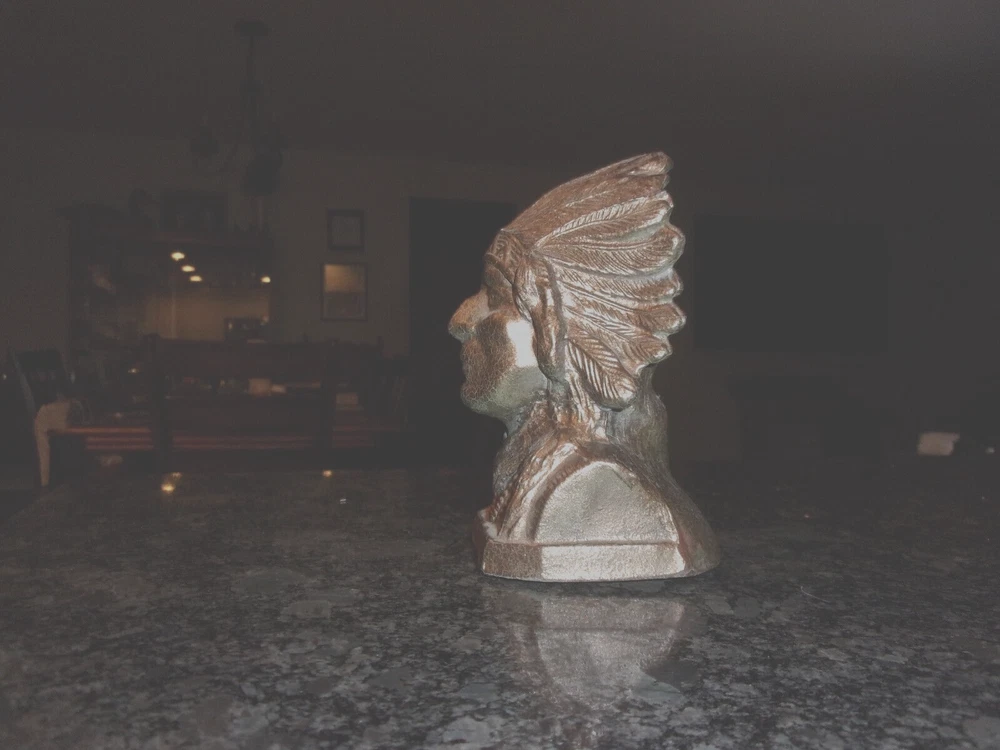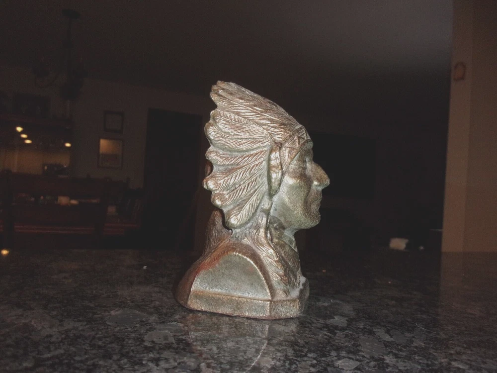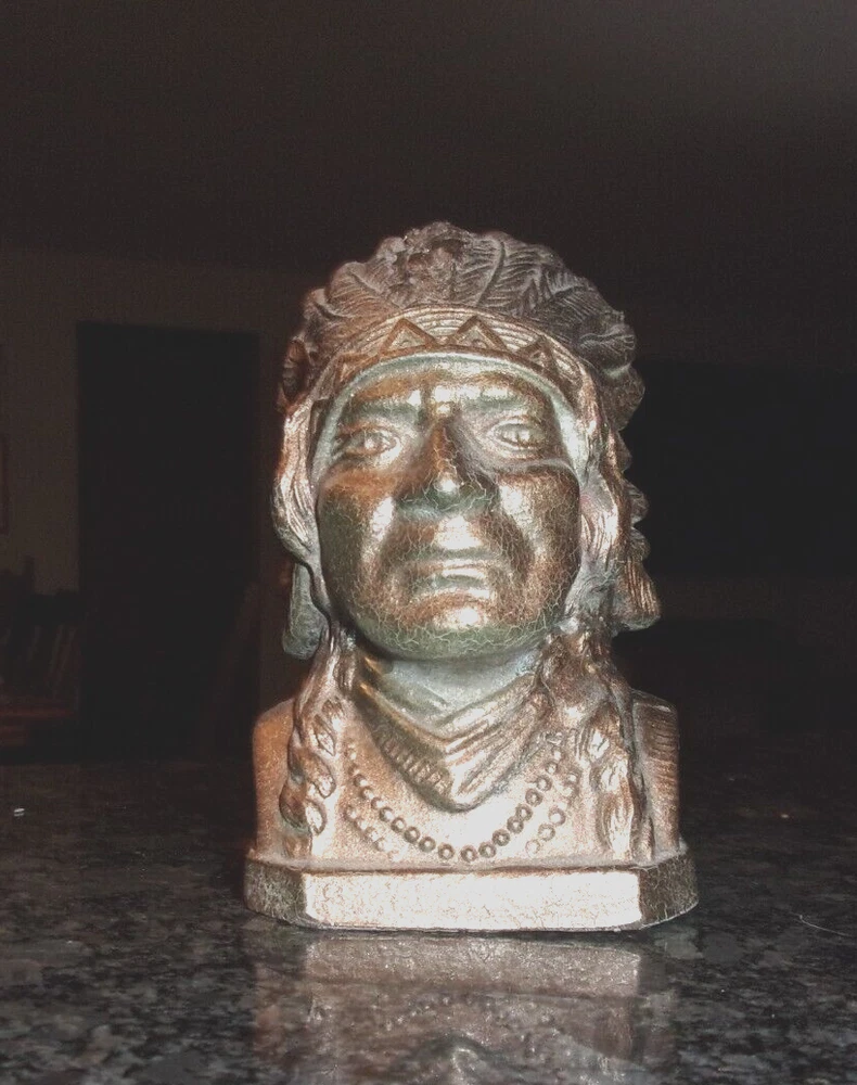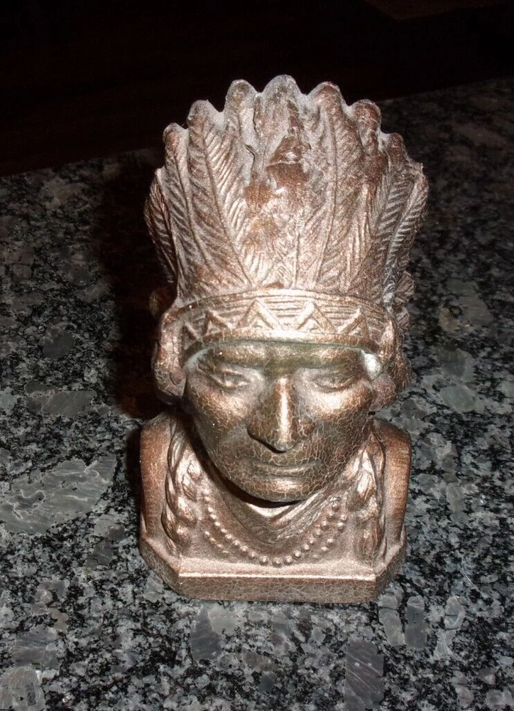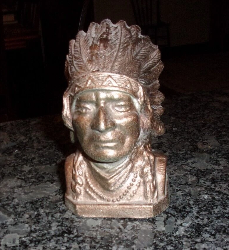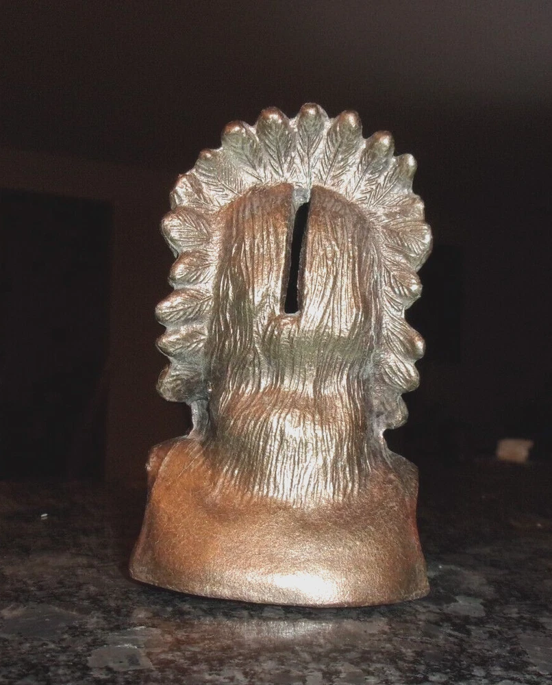 VINTAGE CAST METAL NATIVE AMERICAN INDIAN COIN BANK - COPPER PAINTED -