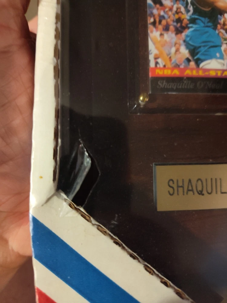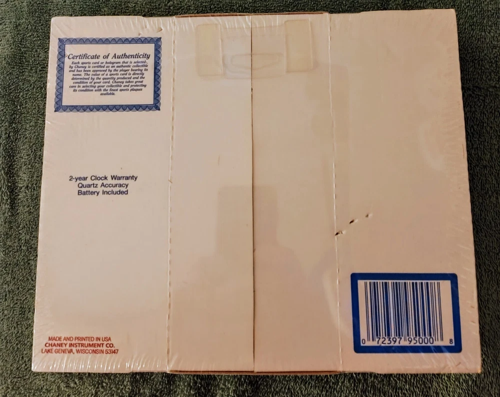 A vintage Chaney Clock Collection wall clock from 1986 featuring Shaquille O'Neal in a traditional style. This rectangular clock has a glossy finish with a wooden frame and plastic materials. It is powered by a quartz battery and showcases a basketball theme. This unique NBA franchise collectible includes a plaque and card, making it a special addition for fans of Shaquille O'Neal and basketball memorabilia. This item is sealed and new in original packaging with a small hole in the clear plastic as shown in the pictures. Please feel free to ask any questions before purchasing and thanks for looking A1
