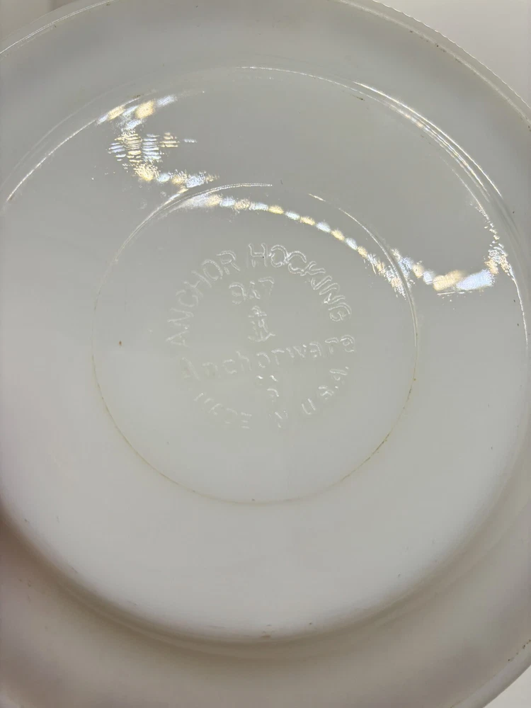 Production Style:Milk GlassPattern:VintageVintage:YesMaterial:GlassOccasion:All OccasionsSet Includes:Plate SetHandmade:NoShape:RoundOriginal/Licensed Reproduction:OriginalBrand:Anchor HockingColor:WhiteType:Salad PlateStyle:Mid-Century ModernCountry/Region of Manufacture:United States