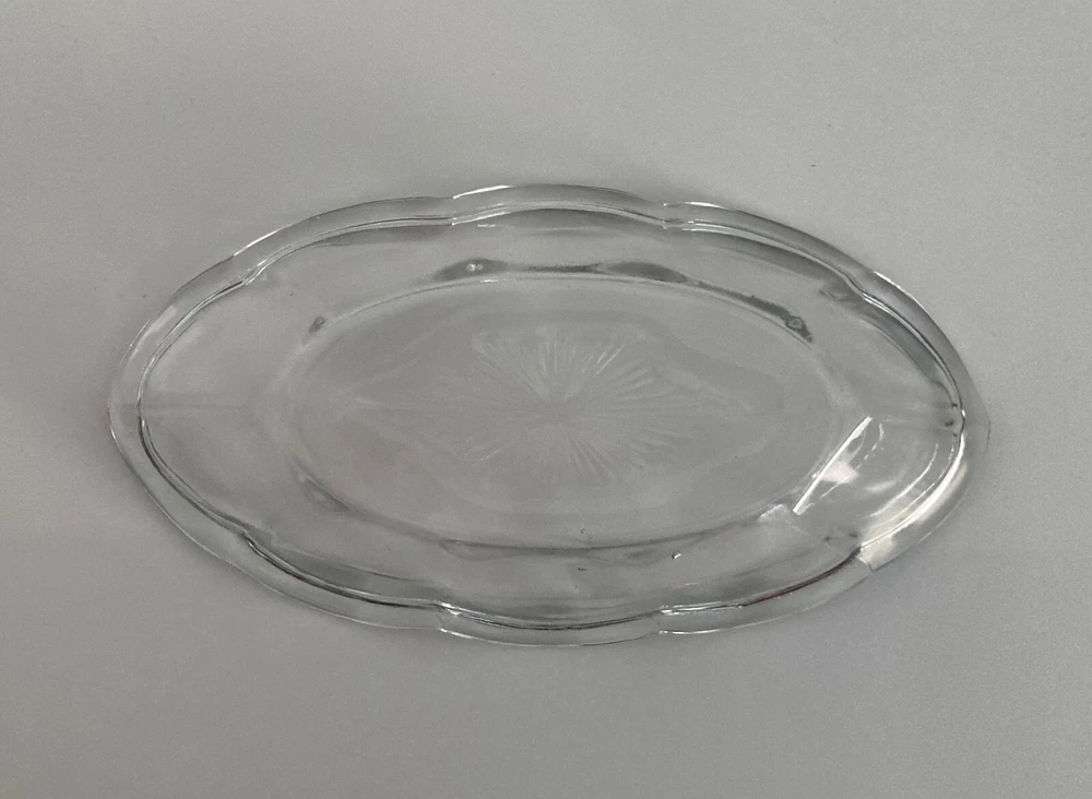 Vintage Clear Glass Oval Banana Split Dish or for Relish, Snacks, etc. Excellent condition – no chips or cracks Scalloped Rim – Starburst Design in Bottom 7 1/2” Long – 4” Wide – 1 ¼” Tall May be Depression Glass – it’s from a family member’s estate and she collected mostly Depression Era Glassware. Not sure of the pattern. Smoke free home – PPU if located in or near Howell, Michigan