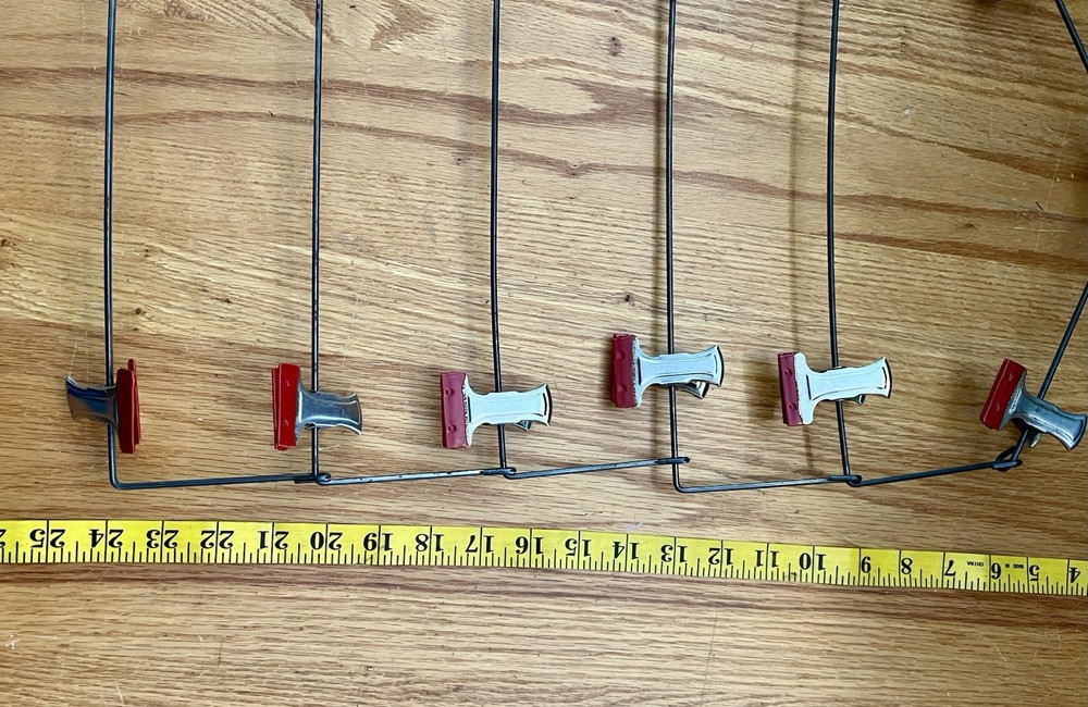 This vintage closet coat hanger pants clip holder is a metal coat hook with a single hook ideal for organizing and storing coats, hats, and other items in your home. The sturdy metal construction ensures durability and longevity, making it a practical and stylish addition to any closet or entryway. Ideal for keeping your outerwear neat and easily accessible, this hanger adds a touch of retro charm to your home decor.