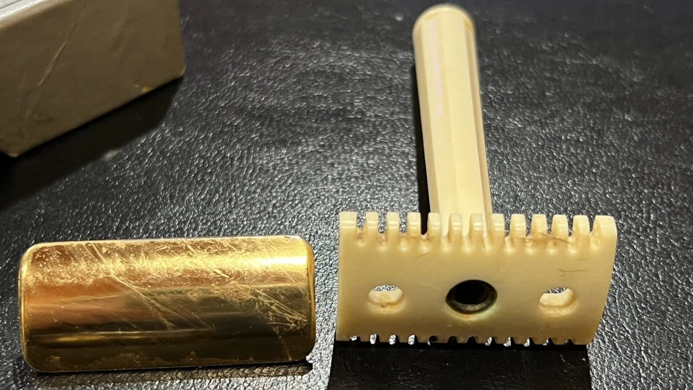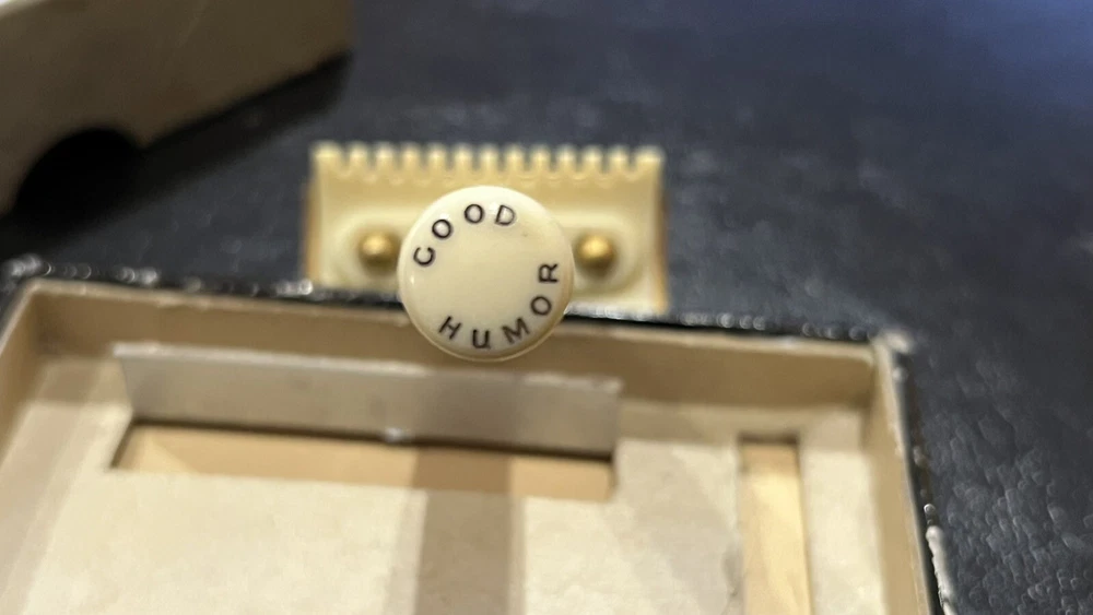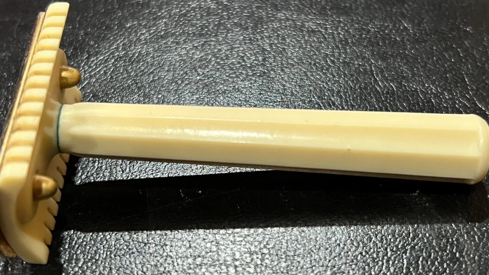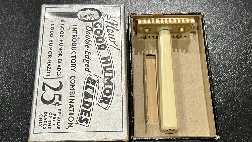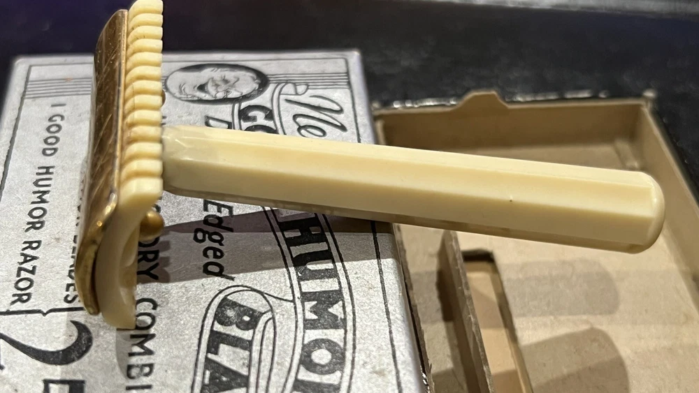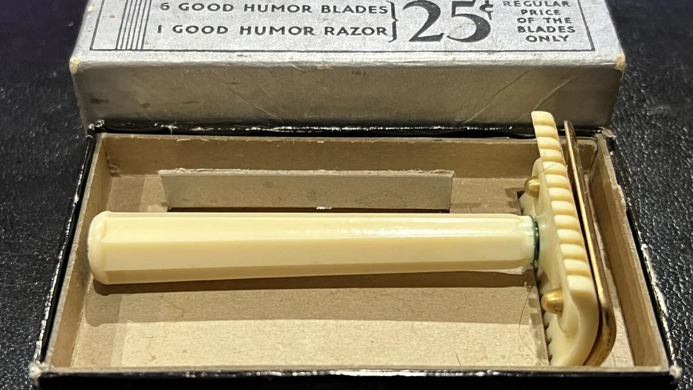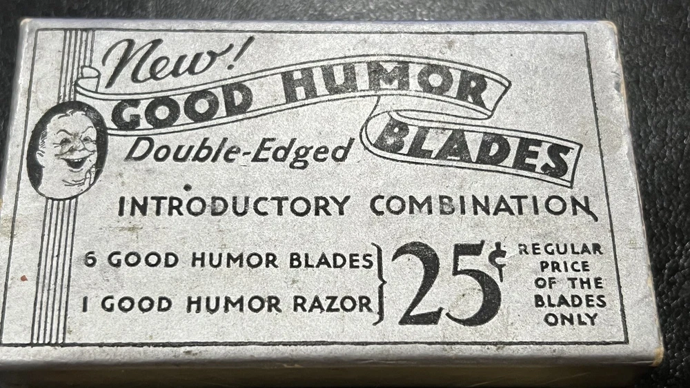 This listing is for a: VINTAGE Conrad 32's "GOOD HUMOR" Two-Piece Open Comb Type Double edge Safety Razor Comes with original box Razor has Good Humor stamped on end of handle In the early 30's Good Humor (TM) Blades were sold under the J.C. Penny house label and MFG by Prybrands Inc. This is a white blade base and handle razor with gold tone cap This item will make a great addition to your Barber / Razor Collection. Please see all photos as they are part of the description