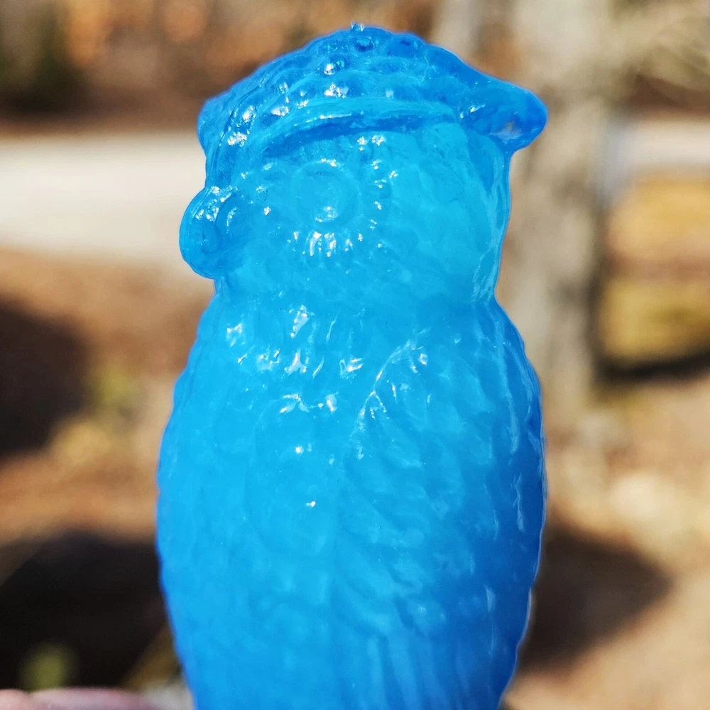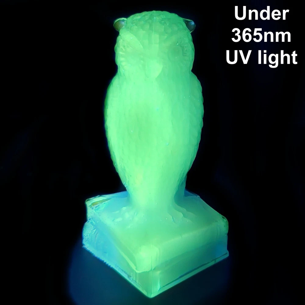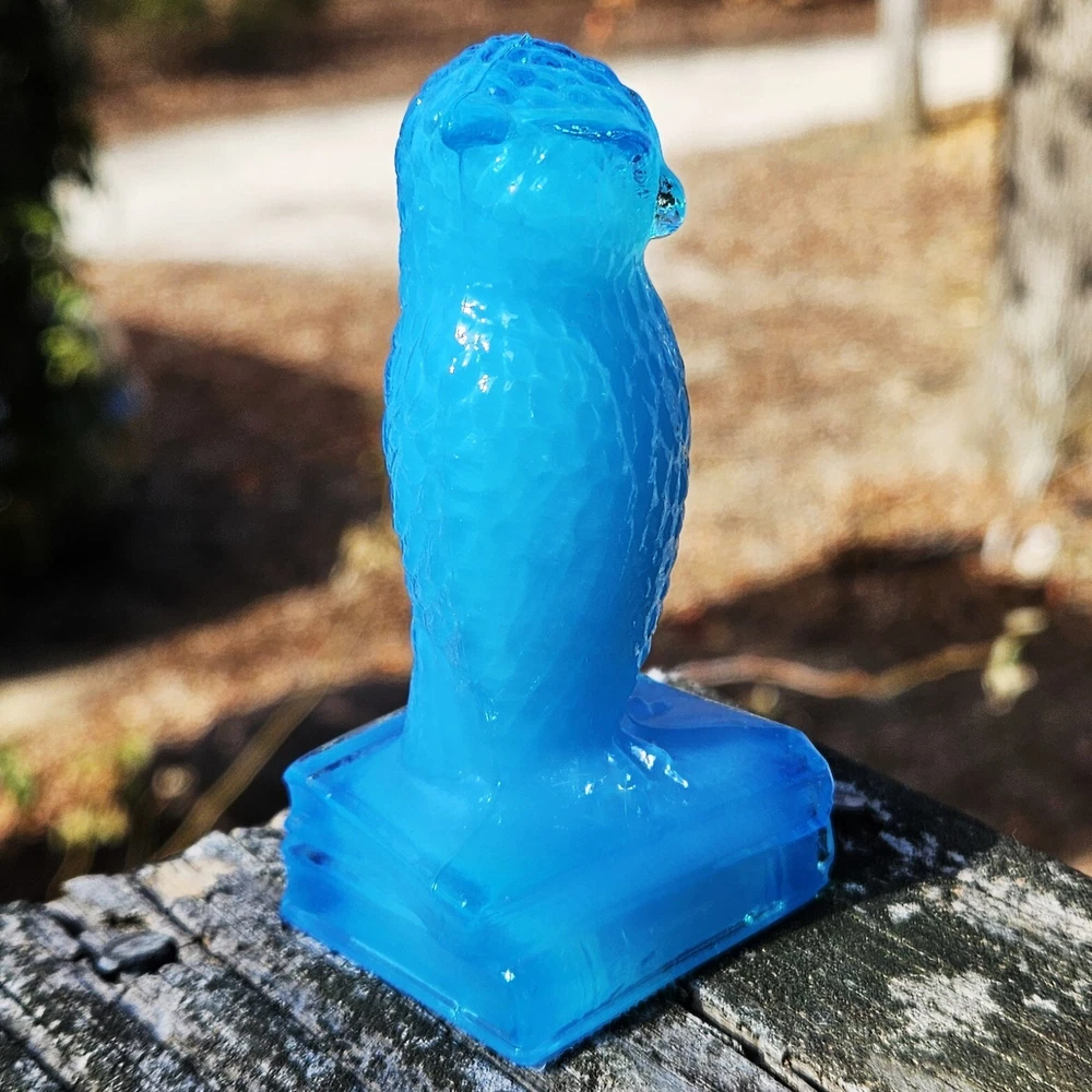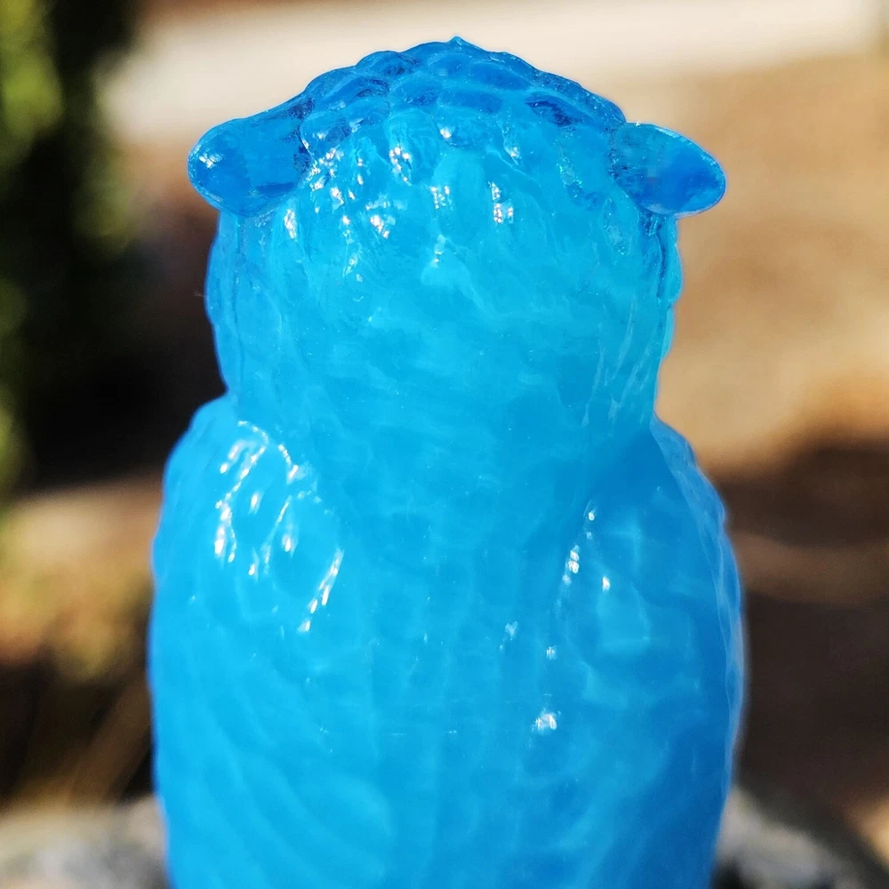 Up for auction is a Degenhart glass owl in the color "Chad's Little Boy Blue" (#179). This is a gorgeous opaque turquoise blue with opalescence in the head. It glows pale green under a 365nm blacklight due to Manganese in the glass. It's in excellent condition with no flaws of any kind. It looks stunning in the sunlight. It stands 3.5 inches tall and has the Degenhart "D" embossed on the bottom of the figurine. Degenhart Glass made this owl from 1967 to 1978. The owl was permanently retired in 1978 and never made again. All pictures were taken in natural outdoor lighting. I'm a highly experienced glass shipper, so you can rest assured that your item will be very carefully wrapped and will arrive safely. Please read below for info on the blacklight/UV light I use and recommendations on the best way to view your owl under a blacklight. 1. What blacklight do you use? The blacklight I use is the Lumenshooter S3 that I purchased through Amazon. This has a 365nm wavelength which is the best for viewing the fluorescing properties of Cadmium, Manganese and Selenium. Uranium glows even brighter than normal with this blacklight. 2. Are 365nm and 395nm blacklights the same? The are not! :) A 395nm blacklight emits a violet light and creates a less intense glow. It is best suited for Uranium glass only. I highly recommend purchasing a blacklight with a 365nm wavelength, as they have the advantage of not emitting violet light, which can be a distraction and create a less intense glow. Most objects containing Cadmium, Manganese, Selenium and Uranium will fluoresce strongest under a 365nm black light. 3. What is the best way to view my Degenhart Owl under a blacklight? I recommend using a completely dark room or closet with no additional lighting that could be a distraction. This will give you the brightest glow possible. All UV pictures in my listings are taken in a completely dark closet with only my blacklight and my phone on the night setting. Thank you for looking and please let me know if you have any questions. :)