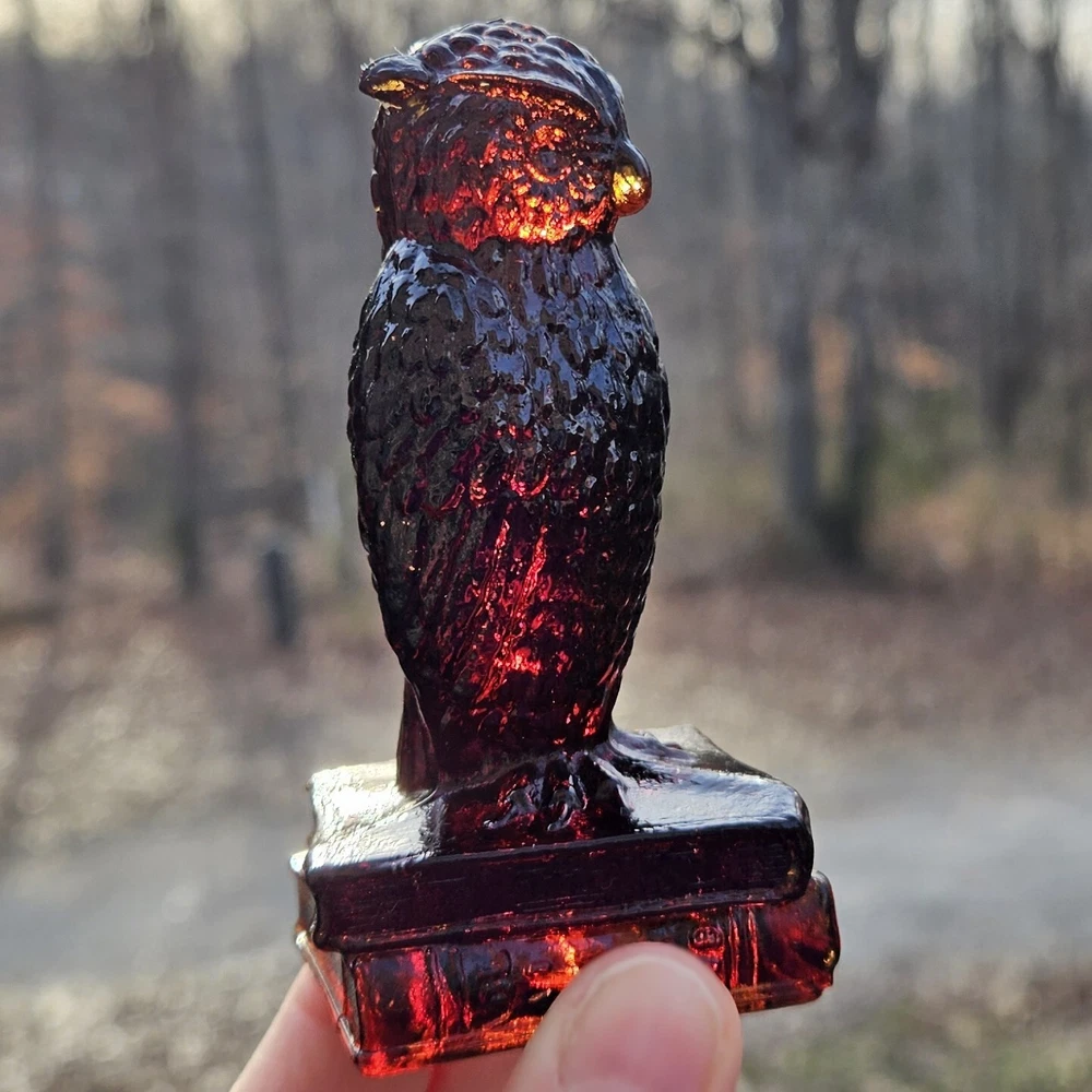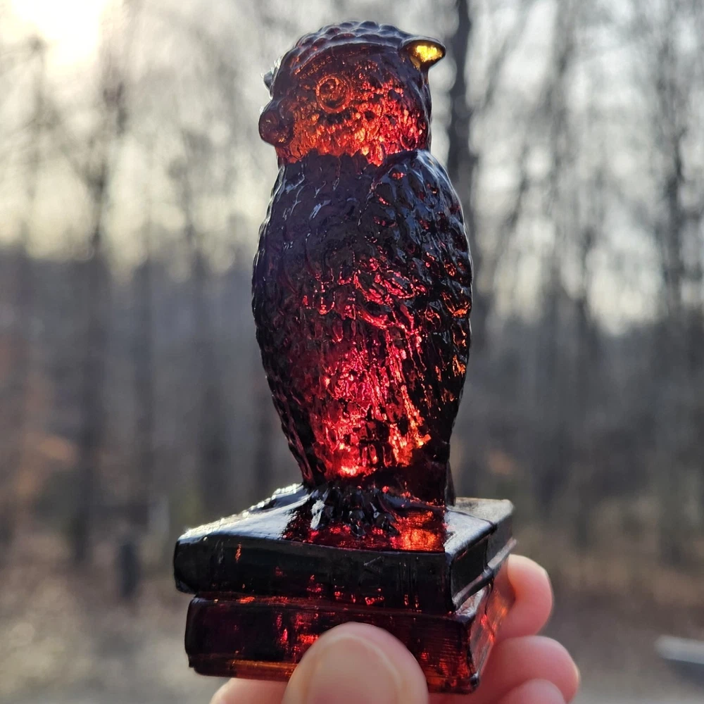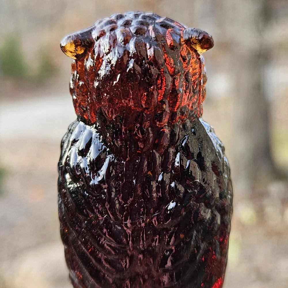 Up for auction is a RARE Degenhart glass owl in the color "Jabes Amber". This is a rich reddish amber. It's similar to a very dark burgundy or wine red. It's very beautiful in person. This is a hard to find color that was named after Jabe Tarter, a friend of the Degenharts. It's in excellent condition with no flaws of any kind. It looks stunning in the sunlight. It stands 3.5 inches tall and has the Degenhart "D" embossed on the bottom of the figurine. Degenhart Glass made this owl from 1967 to 1978. The owl was permanently retired in 1978 and never made again. All pictures were taken in natural outdoor lighting. I'm a highly experienced glass shipper, so you can rest assured that your item will be very carefully wrapped and will arrive safely. Please read below for info on the blacklight/UV light I use and recommendations on the best way to view your owl under a blacklight. 1. What blacklight do you use? The blacklight I use is the Lumenshooter S3 that I purchased through Amazon. This has a 365nm wavelength which is the best for viewing the fluorescing properties of Cadmium, Manganese and Selenium. Uranium glows even brighter than normal with this blacklight. 2. Are 365nm and 395nm blacklights the same? The are not! :) A 395nm blacklight emits a violet light and creates a less intense glow. It is best suited for Uranium glass only. I highly recommend purchasing a blacklight with a 365nm wavelength, as they have the advantage of not emitting violet light, which can be a distraction and create a less intense glow. Most objects containing Cadmium, Manganese, Selenium and Uranium will fluoresce strongest under a 365nm black light. 3. What is the best way to view my Degenhart Owl under a blacklight? I recommend using a completely dark room or closet with no additional lighting that could be a distraction. This will give you the brightest glow possible. All UV pictures in my listings are taken in a completely dark closet with only my blacklight and my phone on the night setting. Thank you for looking and please let me know if you have any questions. :)