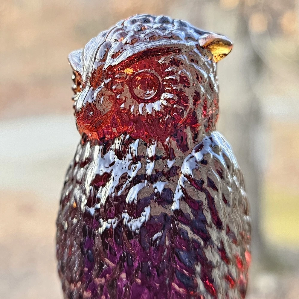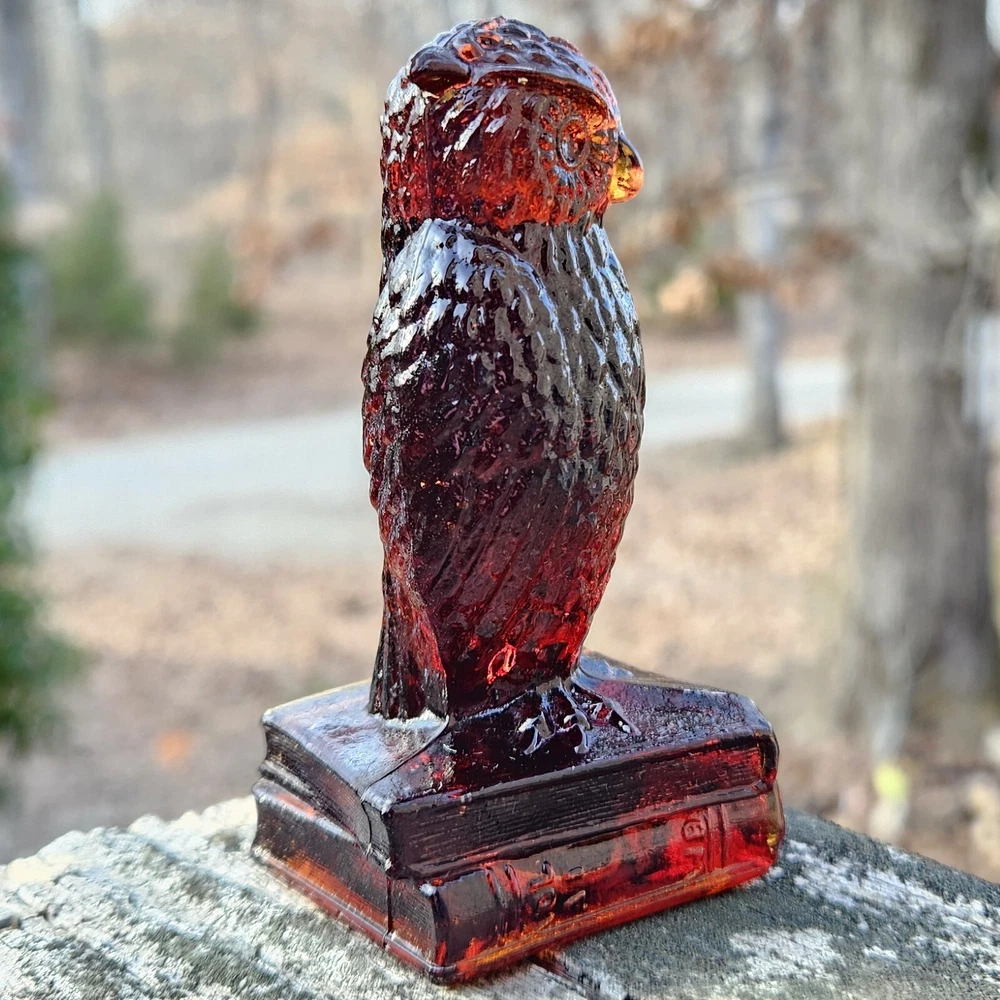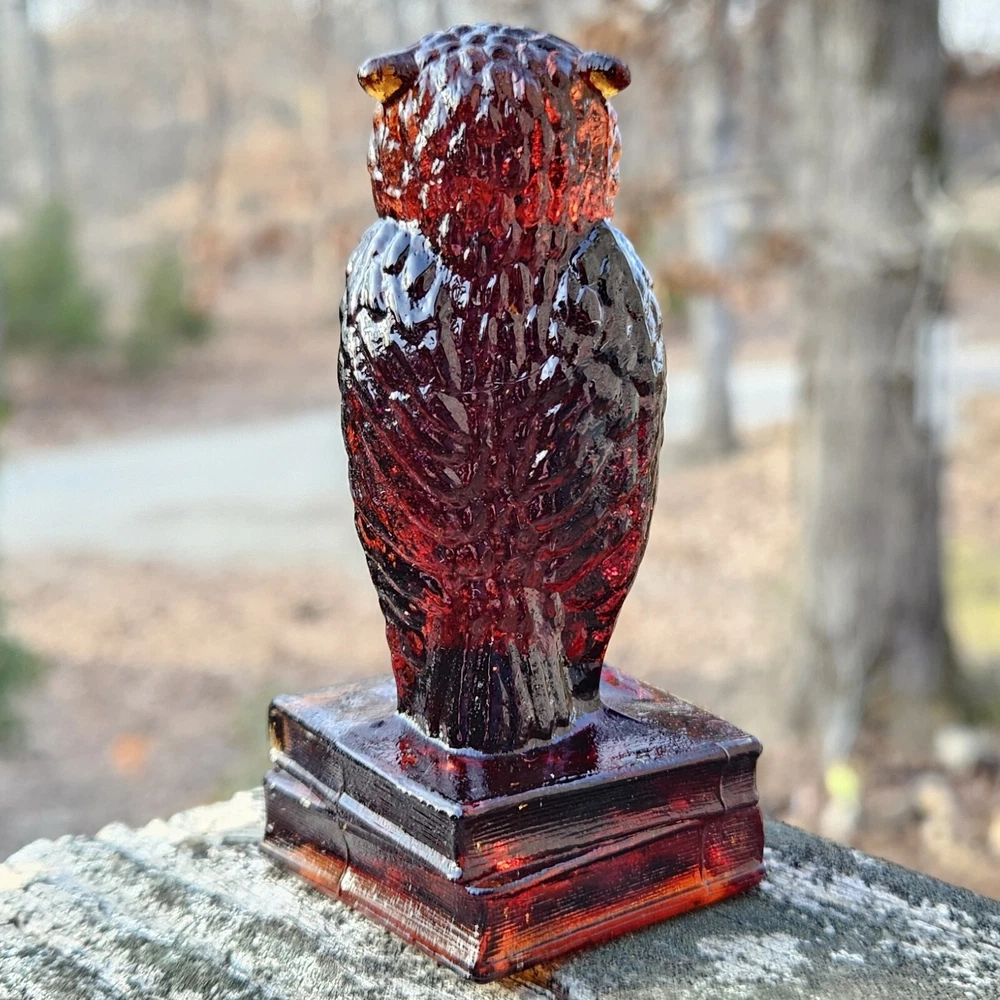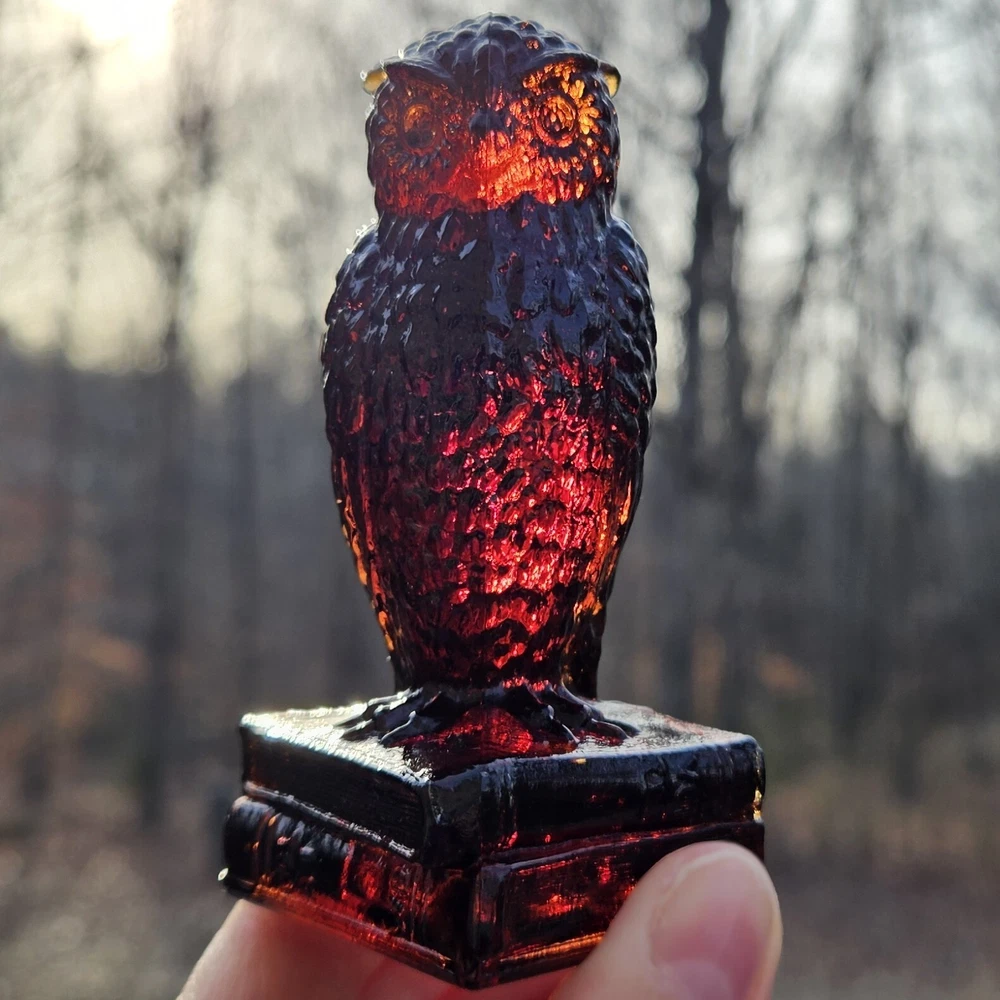 Up for auction is a RARE Degenhart glass owl in the color "Jabes Amber". This is a rich reddish amber. It's similar to a very dark burgundy or wine red. It's very beautiful in person. This is a hard to find color that was named after Jabe Tarter, a friend of the Degenharts. It's in excellent condition with no flaws of any kind. It looks stunning in the sunlight. It stands 3.5 inches tall and has the Degenhart "D" embossed on the bottom of the figurine. Degenhart Glass made this owl from 1967 to 1978. The owl was permanently retired in 1978 and never made again. All pictures were taken in natural outdoor lighting. I'm a highly experienced glass shipper, so you can rest assured that your item will be very carefully wrapped and will arrive safely. Please read below for info on the blacklight/UV light I use and recommendations on the best way to view your owl under a blacklight. 1. What blacklight do you use? The blacklight I use is the Lumenshooter S3 that I purchased through Amazon. This has a 365nm wavelength which is the best for viewing the fluorescing properties of Cadmium, Manganese and Selenium. Uranium glows even brighter than normal with this blacklight. 2. Are 365nm and 395nm blacklights the same? The are not! :) A 395nm blacklight emits a violet light and creates a less intense glow. It is best suited for Uranium glass only. I highly recommend purchasing a blacklight with a 365nm wavelength, as they have the advantage of not emitting violet light, which can be a distraction and create a less intense glow. Most objects containing Cadmium, Manganese, Selenium and Uranium will fluoresce strongest under a 365nm black light. 3. What is the best way to view my Degenhart Owl under a blacklight? I recommend using a completely dark room or closet with no additional lighting that could be a distraction. This will give you the brightest glow possible. All UV pictures in my listings are taken in a completely dark closet with only my blacklight and my phone on the night setting. Thank you for looking and please let me know if you have any questions. :)