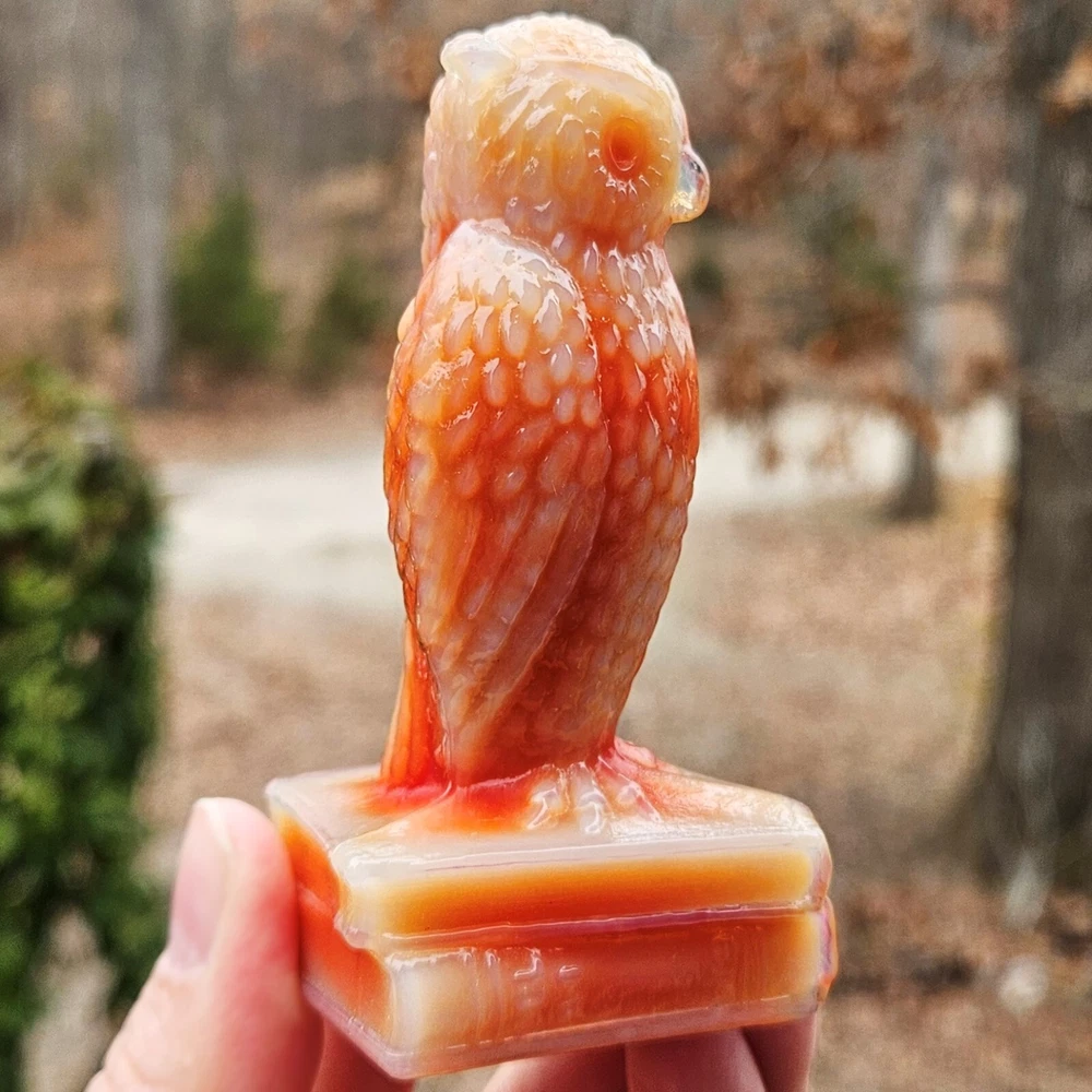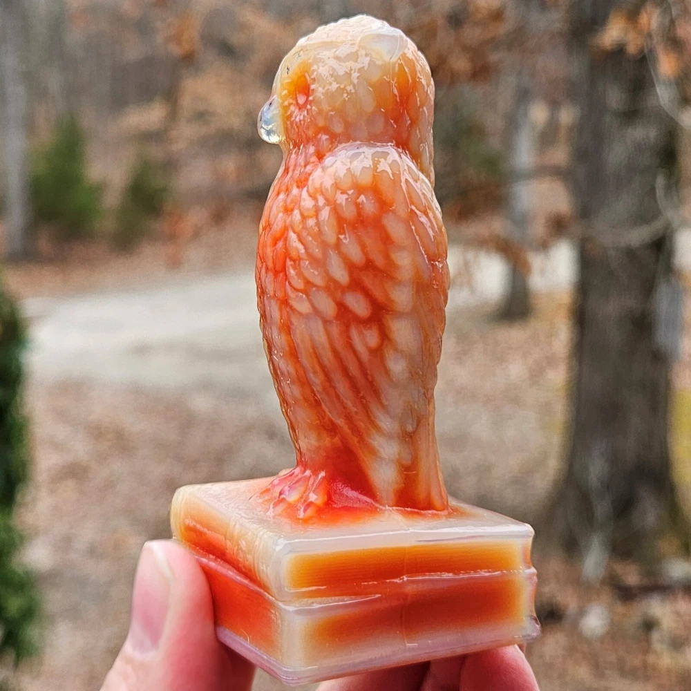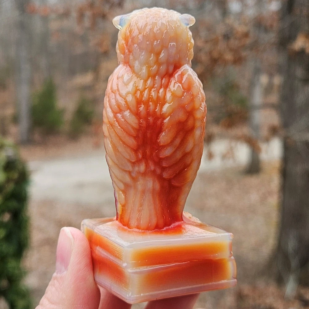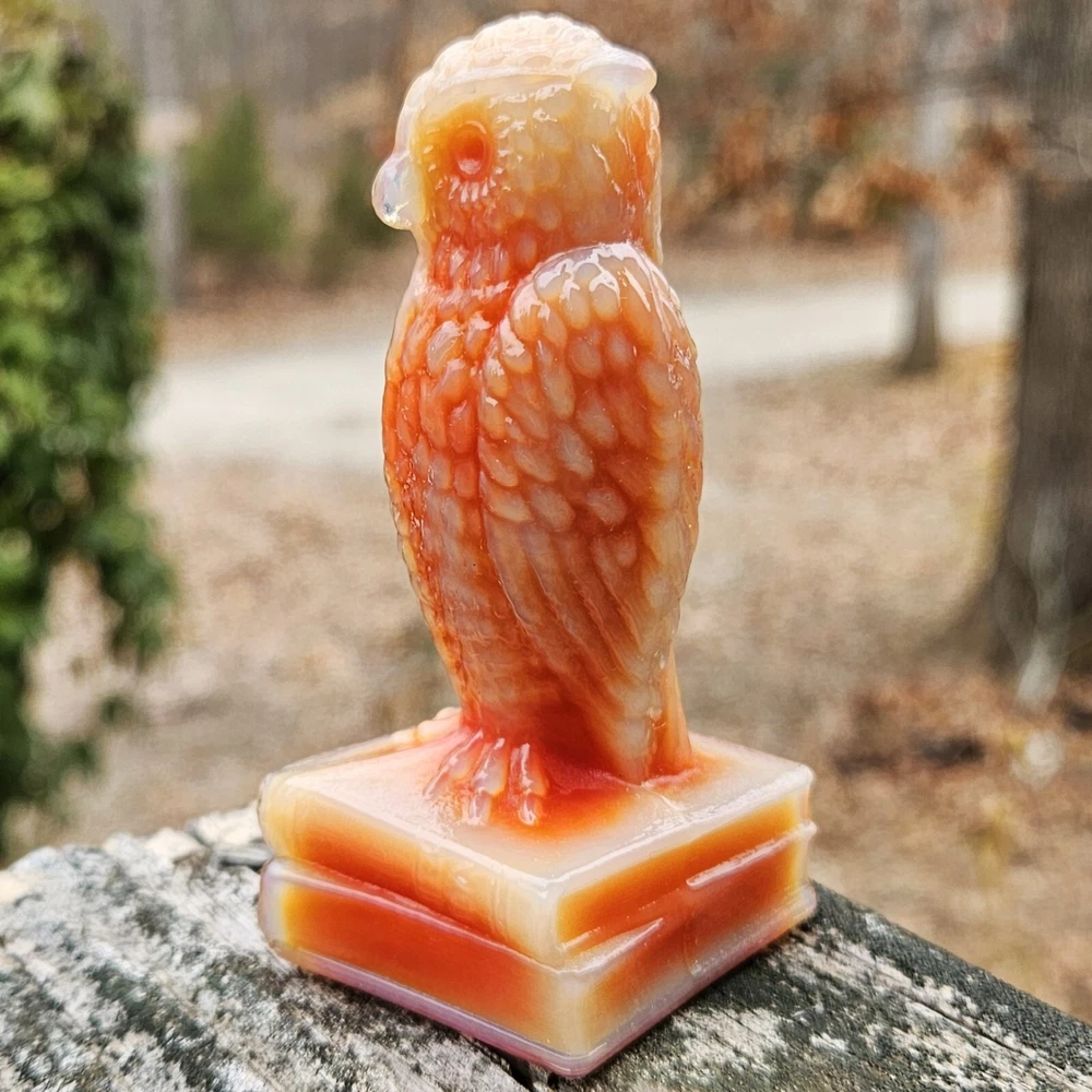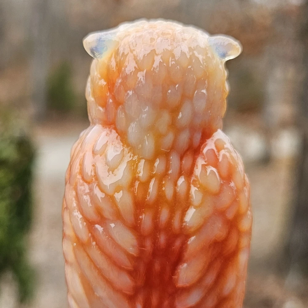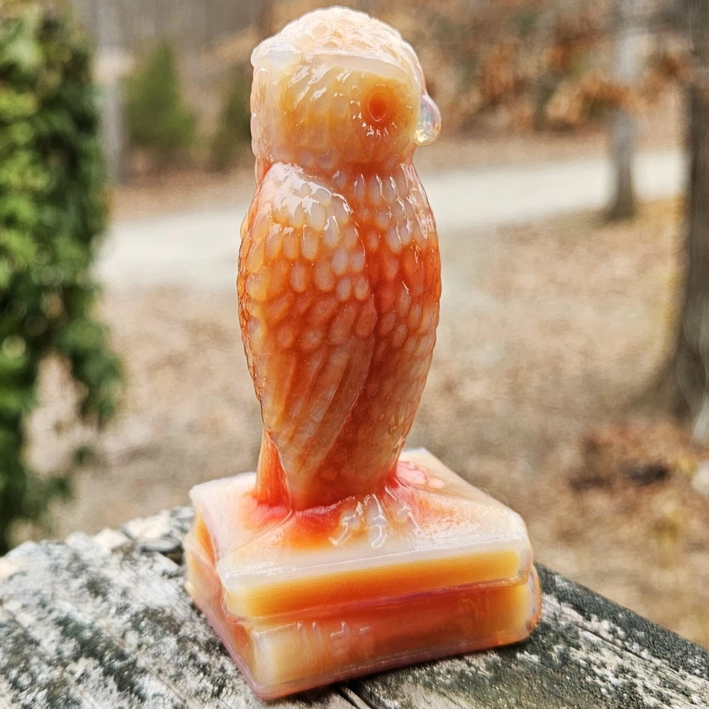 Up for auction is a RARE Degenhart slag glass owl in the color "Bloody Mary #2" (made in 1973). This color consists of cream custard glass with red and orange slag on top. This is a stunning color in person. It glows bright orange and red under a 365nm blacklight due to Cadmium and Selenium in the glass. It's in excellent condition with no flaws of any kind. It looks stunning in the sunlight. It stands 3.5 inches tall and has the Degenhart "D" embossed on the bottom of the figurine. Degenhart Glass made this owl from 1967 to 1978. The owl was permanently retired in 1978 and never made again. All pictures were taken in natural outdoor lighting. I'm a highly experienced glass shipper, so you can rest assured that your item will be very carefully wrapped and will arrive safely. Please read below for info on the blacklight/UV light I use and recommendations on the best way to view your owl under a blacklight. 1. What blacklight do you use? The blacklight I use is the Lumenshooter S3 that I purchased through Amazon. This has a 365nm wavelength which is the best for viewing the fluorescing properties of Cadmium, Manganese and Selenium. Uranium glows even brighter than normal with this blacklight. 2. Are 365nm and 395nm blacklights the same? The are not! :) A 395nm blacklight emits a violet light and creates a less intense glow. It is best suited for Uranium glass only. I highly recommend purchasing a blacklight with a 365nm wavelength, as they have the advantage of not emitting violet light, which can be a distraction and create a less intense glow. Most objects containing Cadmium, Manganese, Selenium and Uranium will fluoresce strongest under a 365nm black light. 3. What is the best way to view my Degenhart Owl under a blacklight? I recommend using a completely dark room or closet with no additional lighting that could be a distraction. This will give you the brightest glow possible. All UV pictures in my listings are taken in a completely dark closet with only my blacklight and my phone on the night setting. Thank you for looking and please let me know if you have any questions. :)