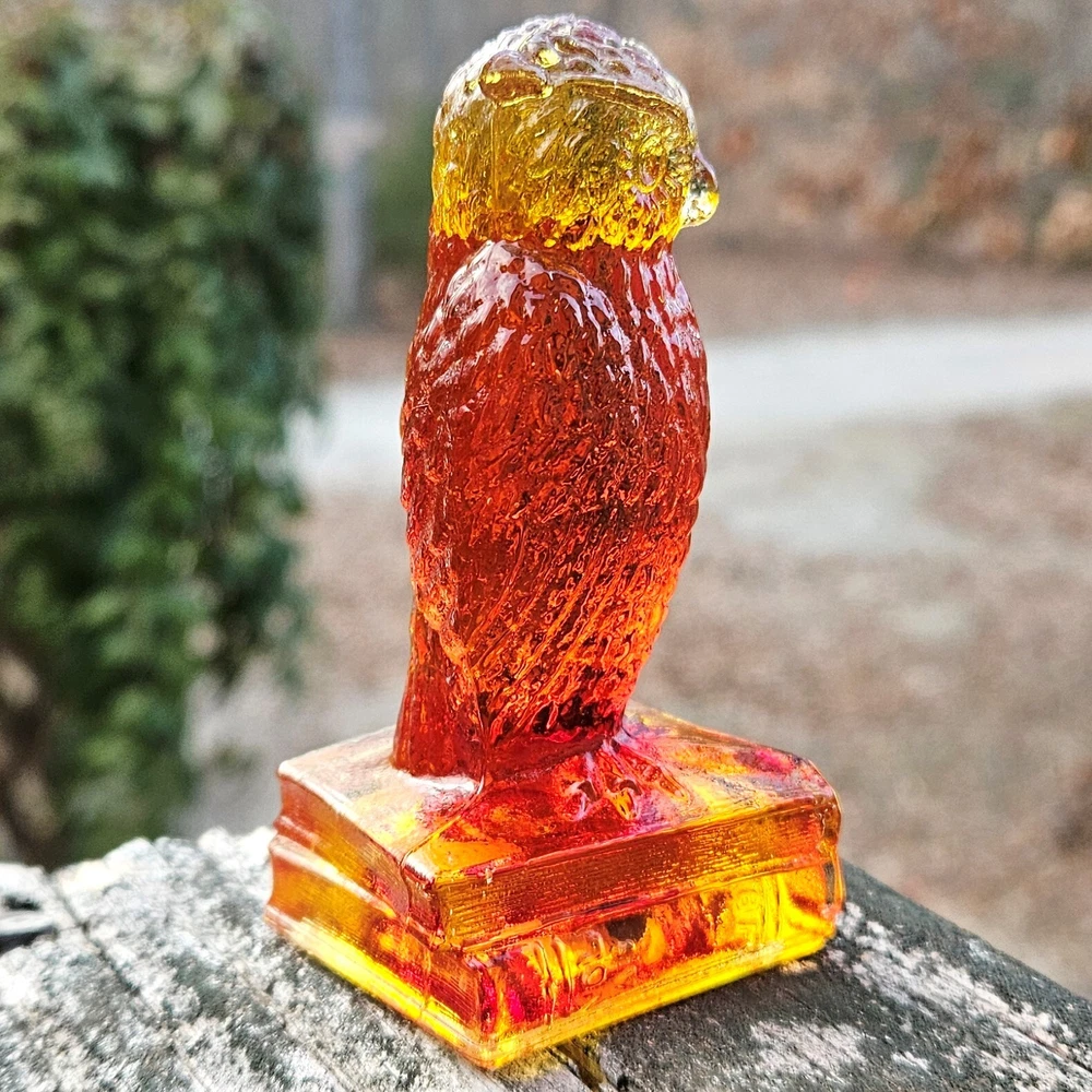 Up for auction is a vintage Degenhart slag glass owl in the color "Desert Sun Warmed in" (made in 1975). This color consists of a golden yellow with an intense orangish-red center. It was originally bought as "warmed in" because the red center was darker and covered more area than the regular "Desert Sun". It glows bright orange and red under a 365nm blacklight due to Cadmium and Selenium in the glass. It's in excellent condition with no flaws of any kind. It looks stunning in the sunlight. It stands 3.5 inches tall and has the Degenhart "D" embossed on the bottom of the figurine. Degenhart Glass made this owl from 1967 to 1978. The owl was permanently retired in 1978 and never made again. All pictures were taken in natural outdoor lighting. I'm a highly experienced glass shipper, so you can rest assured that your item will be very carefully wrapped and will arrive safely. Please read below for info on the blacklight/UV light I use and recommendations on the best way to view your owl under a blacklight. 1. What blacklight do you use? The blacklight I use is the Lumenshooter S3 that I purchased through Amazon. This has a 365nm wavelength which is the best for viewing the fluorescing properties of Cadmium, Manganese and Selenium. Uranium glows even brighter than normal with this blacklight. 2. Are 365nm and 395nm blacklights the same? The are not! :) A 395nm blacklight emits a violet light and creates a less intense glow. It is best suited for Uranium glass only. I highly recommend purchasing a blacklight with a 365nm wavelength, as they have the advantage of not emitting violet light, which can be a distraction and create a less intense glow. Most objects containing Cadmium, Manganese, Selenium and Uranium will fluoresce strongest under a 365nm black light. 3. What is the best way to view my Degenhart Owl under a blacklight? I recommend using a completely dark room or closet with no additional lighting that could be a distraction. This will give you the brightest glow possible. All UV pictures in my listings are taken in a completely dark closet with only my blacklight and my phone on the night setting. Thank you for looking and please let me know if you have any questions. :)