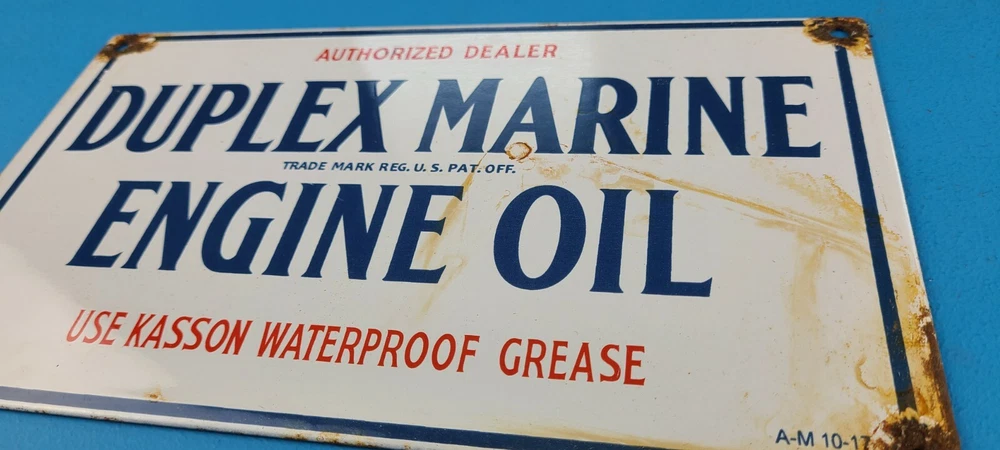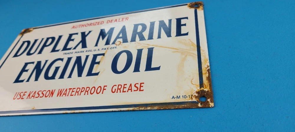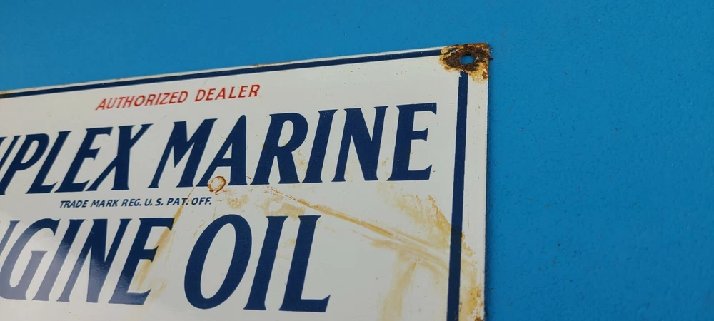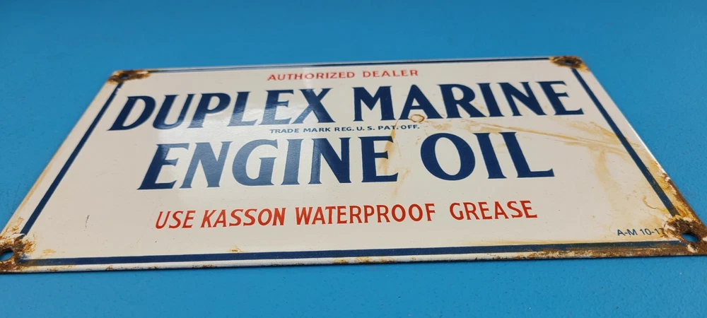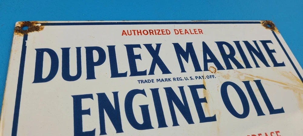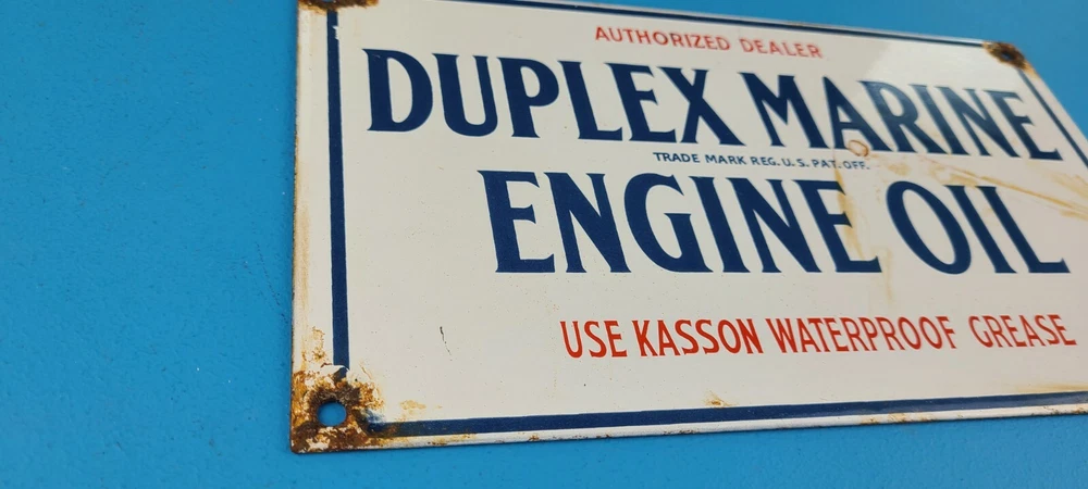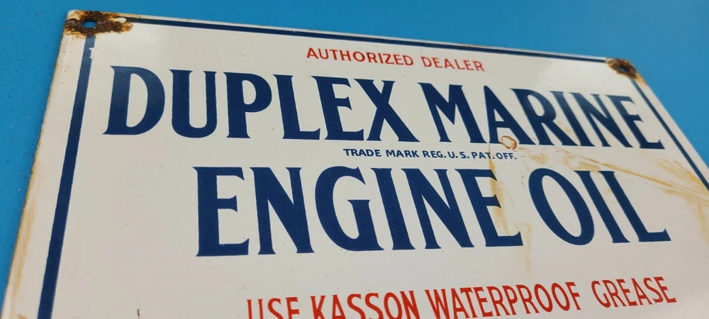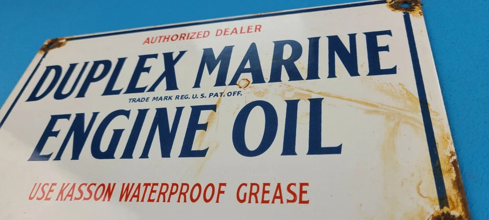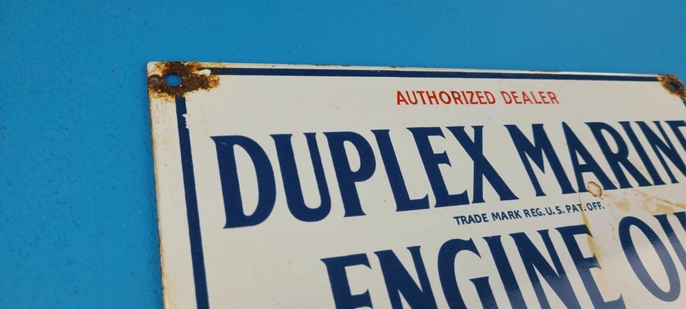 Room to Display: Man Cave, Gas Collection, Garage, Shop, Den, DIY Basement, Shed Type of Advertising: Sign Conditions of sign: May include Rust, Chips, Scratches, Fragile Porcelain. See Images Brand: Duplex Marine Engine Oil Material: Heavy Gauge Steel, Porcelain on front and Back Sign Usage: Indoor, Outdoor, Diner, Restaurant, Pool House, Wall Decor, Home Theme: Gas & Oil Characteristics: Petroliana, Retro, Americana, Rustic, Nostalgic, Classic, Vintage Sign Features: Holes for Hanging or use small antique easel for display