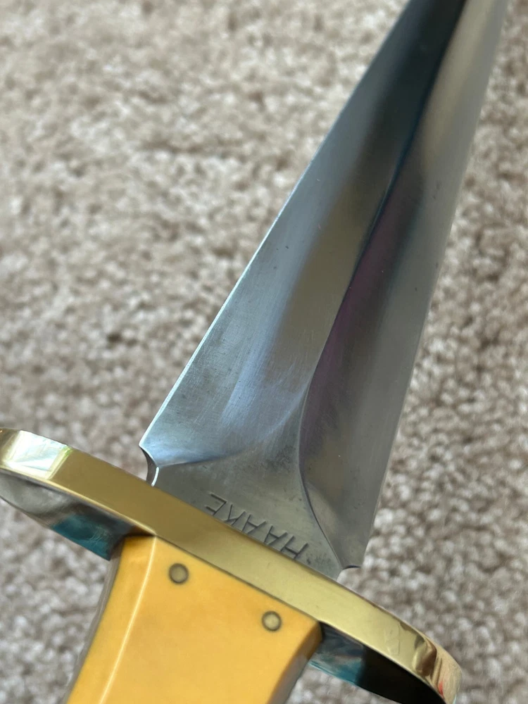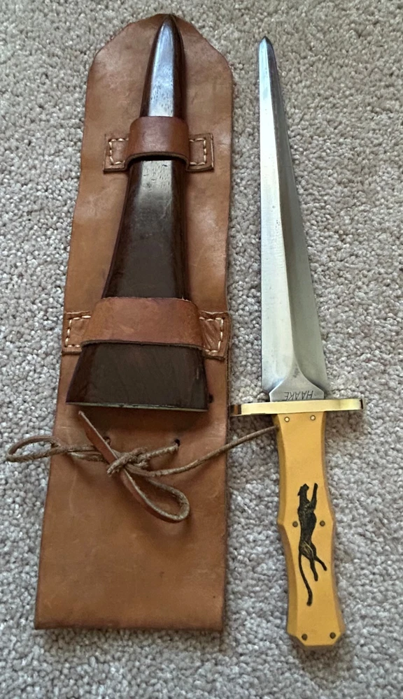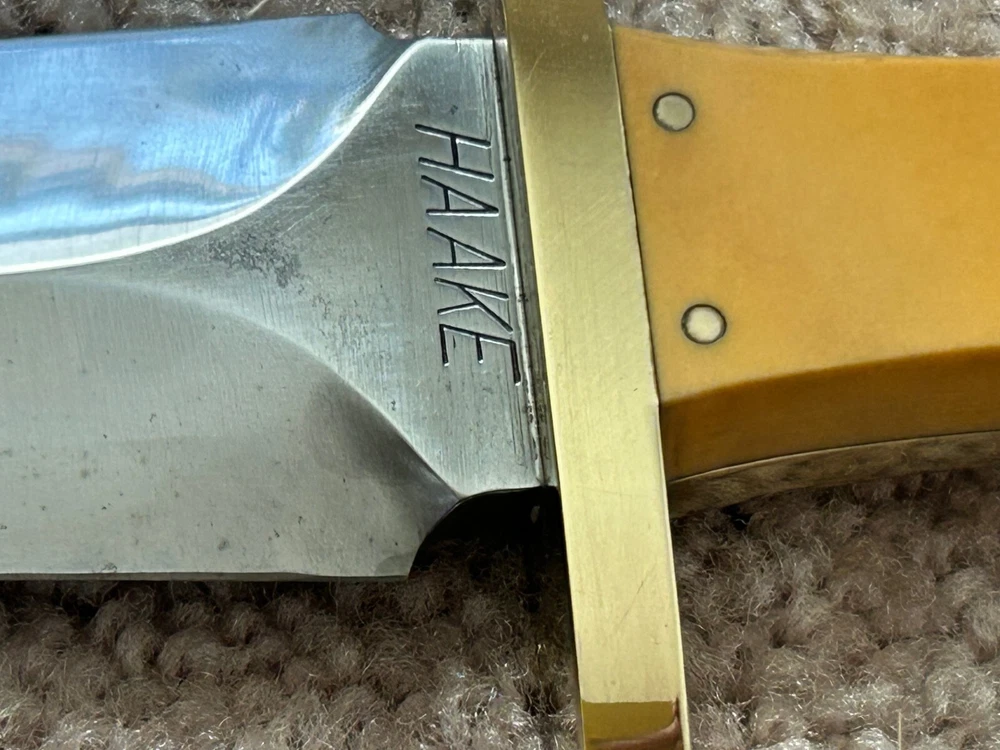 Features: Sheath Included Blade Type: Spear Point Blade Length: Over 5in. Blade Edge: Plain Color: Silver Vintage: Yes Handle Material: MICARTA Seller Notes: “PRE-OWNED / VINTAGE / SOME SCRATCHES AND MARKS THROUGHOUT” Handmade: Yes Type: Boot, Bowie, Combat, Hunting, Survival Brand: HAAKE Blade Material: Carbon Steel Original/Reproduction: Original Dexterity: Ambidextrous Tang: Full