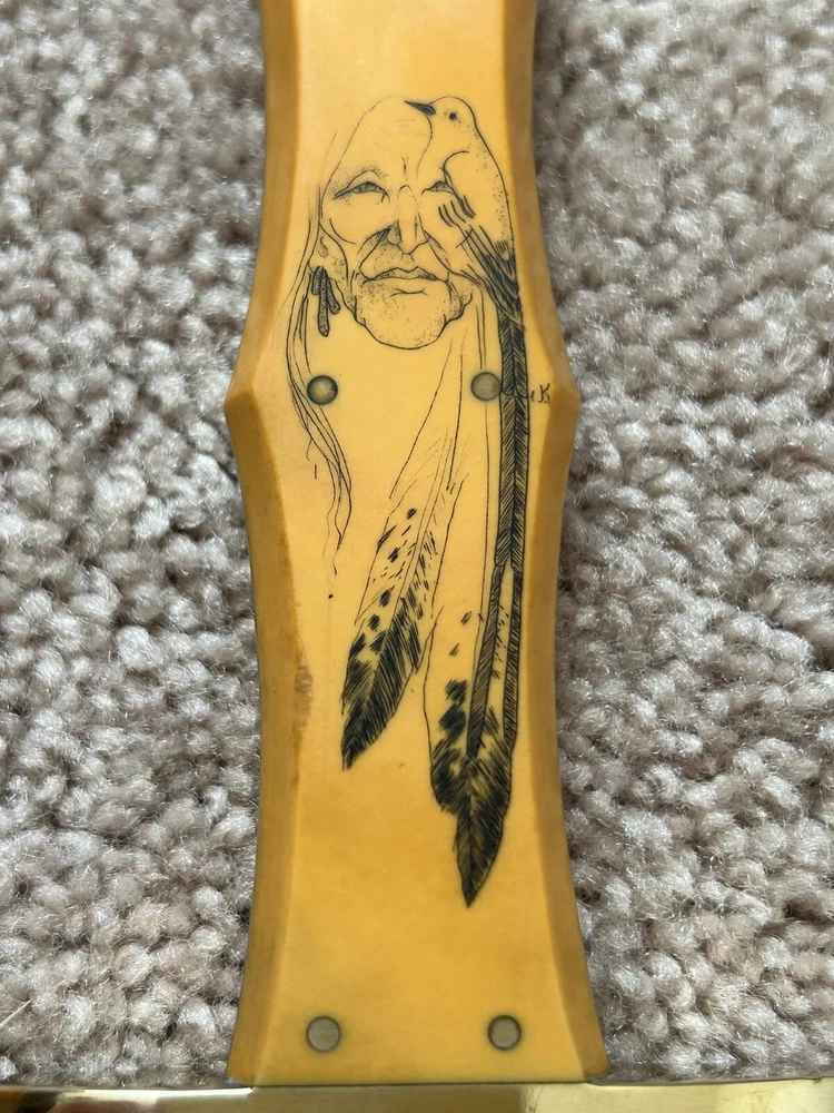 VINTAGE FIGHTING DAGGER STAMPED 'HAAKE' SCIMSHAW OF AMERICAN INDIAN SIGNED J.K