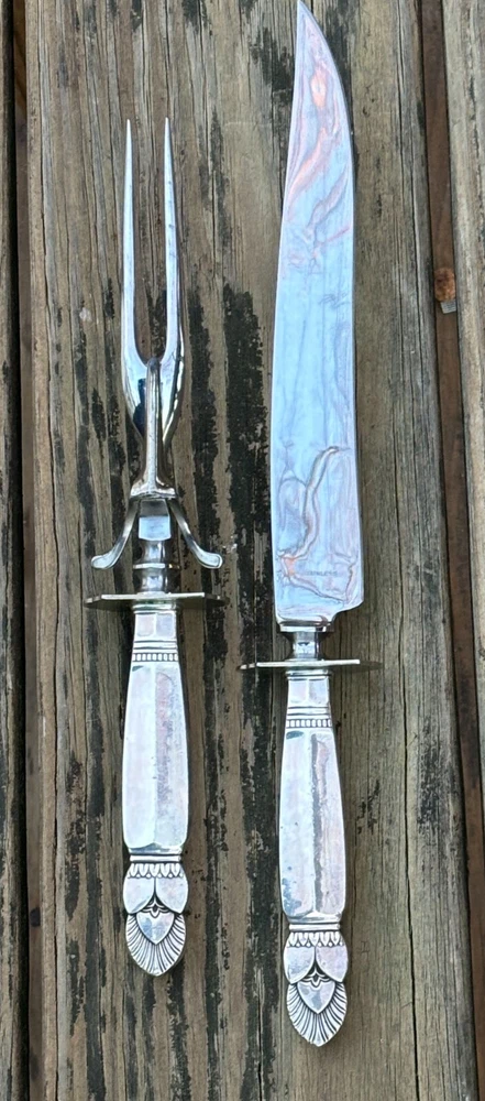 You are bidding on a vintage Frank Whiting Princess Ingrid heavyweight carving knife and fork set. Stainless steel with sterling silver handles. Beautiful deco-like design. Shipping is $10.95. Sorry I can't do free shipping on this auction. SHIPPING PRICE IS NOT NEGOTIABLE. Please note that I DO NOT GIVE PARTIAL REFUNDS for any reason. If there is a problem, you will be asked to return the item for a full refund. Check out my other auctions I will gladly combine shipping! No returns please. HAPPY BIDDING!!