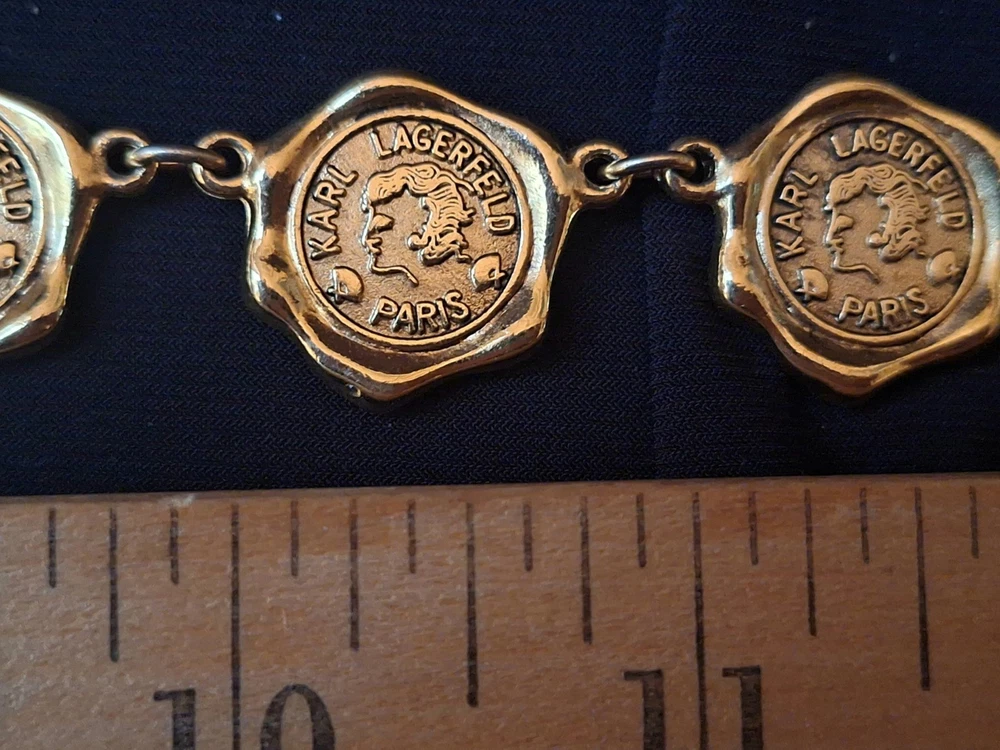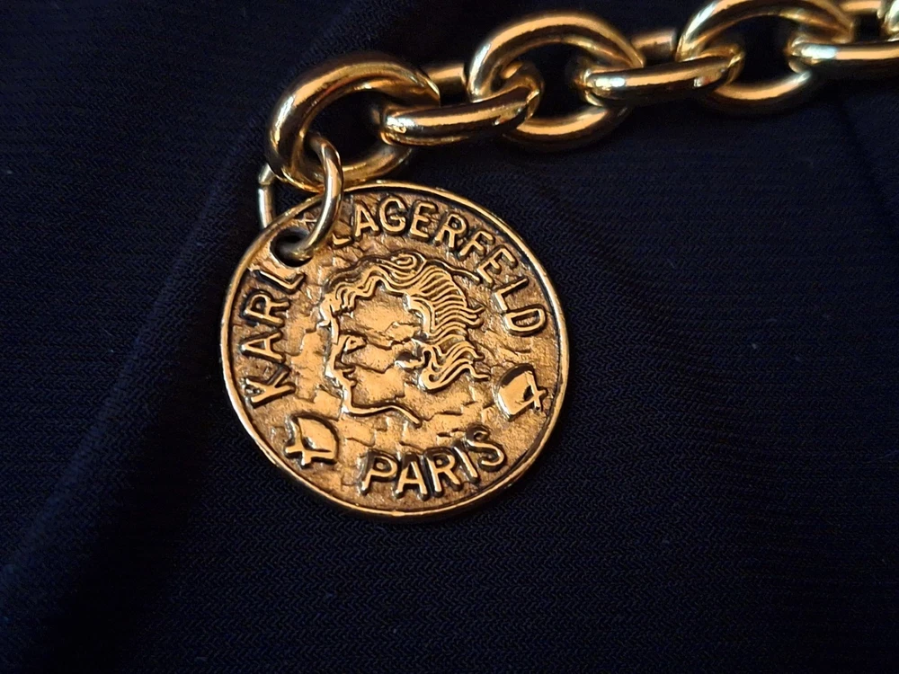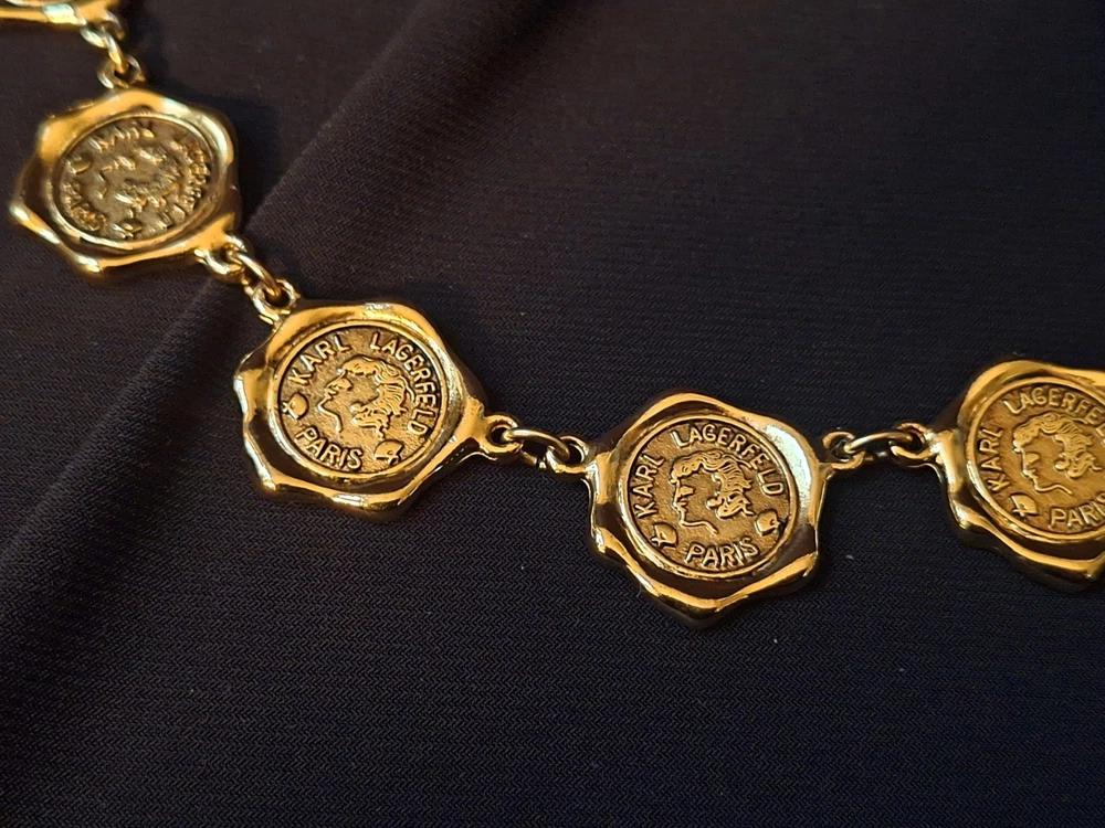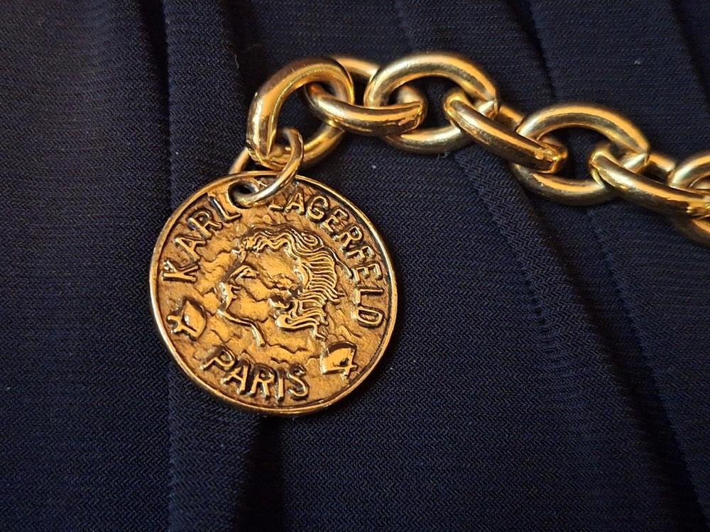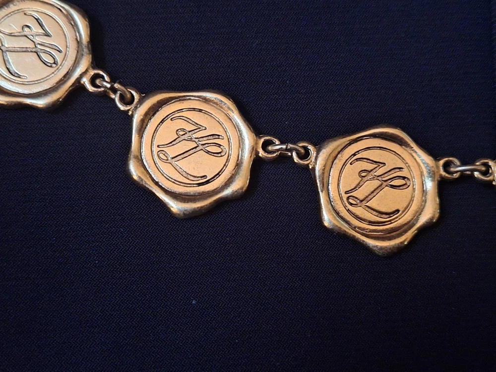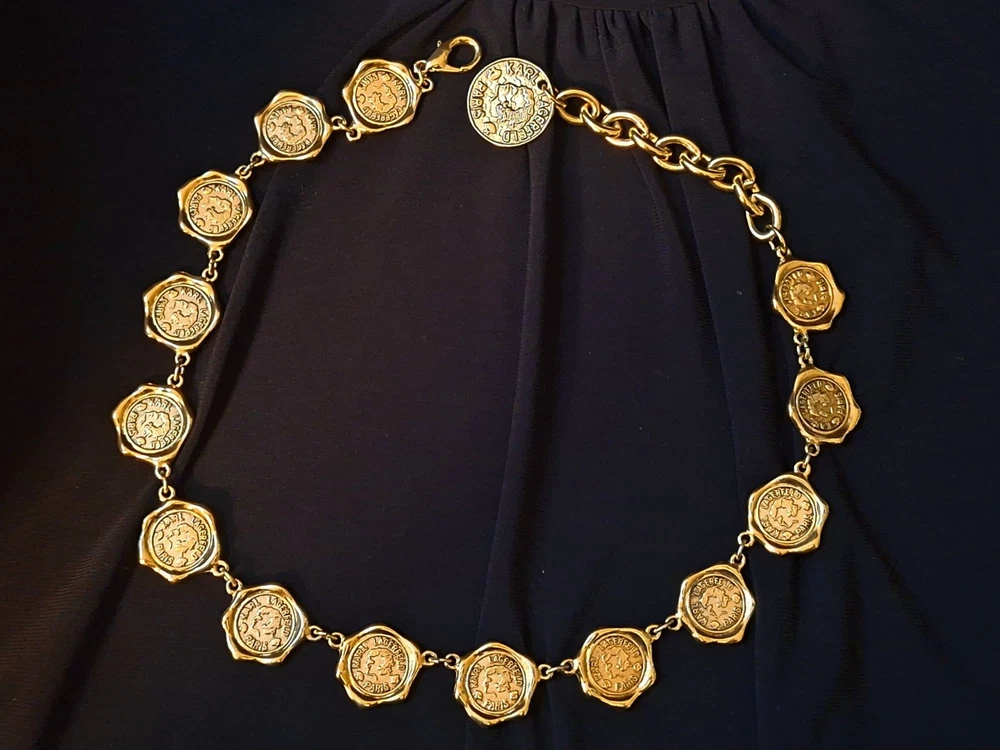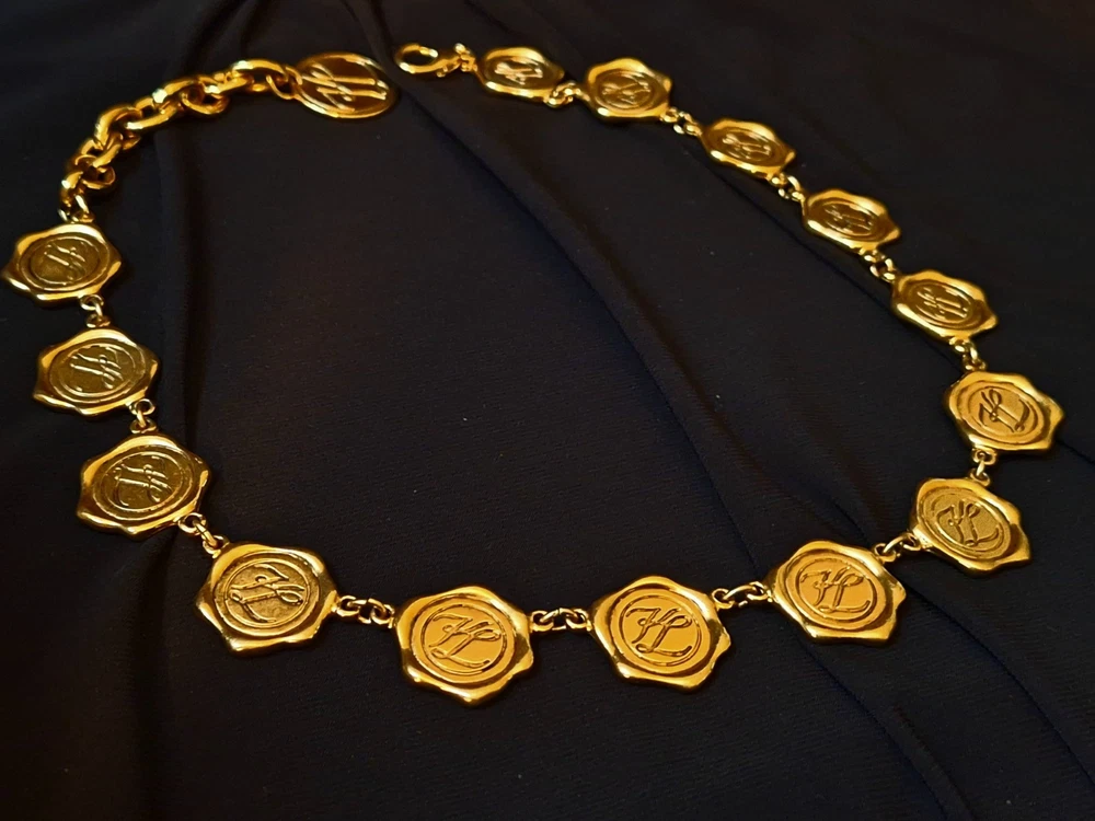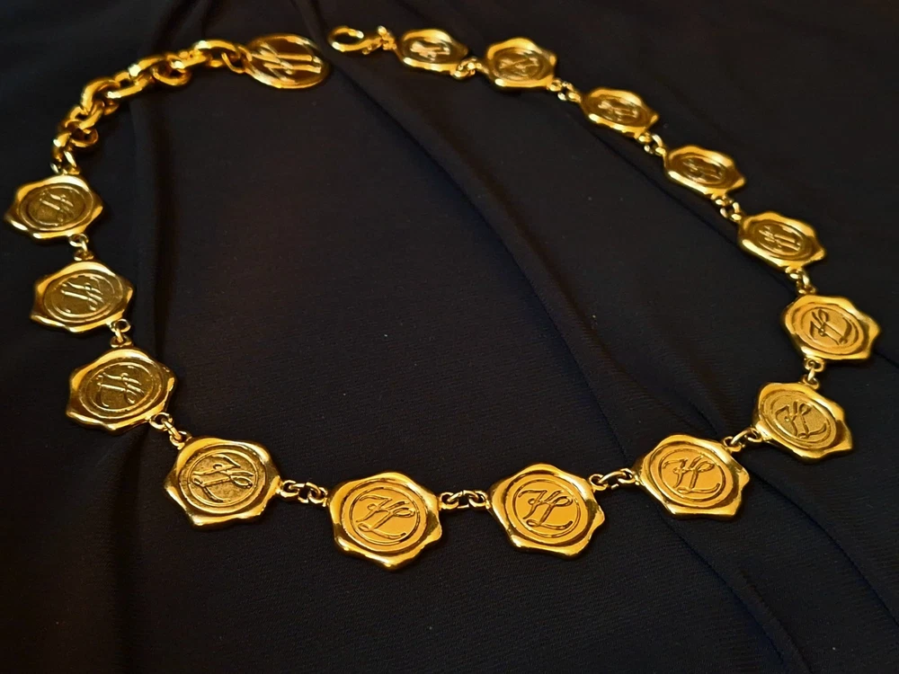 This vintage Karl Lagerfeld runway logo wax seal design gold tone necklace features a 20-inch yellow gold plated chain with a lobster closure. This iconic runway piece from the 1980s is exudes a classic fashion-forward style. 2 sided design features logo coun on one side with KL initials on the reverse. Perfect for women who appreciate high-quality fashion jewelry with a touch of nostalgia, this necklace is a timeless accessory from the renowned Karl Lagerfeld brand. Excellent pre-owned condition. 20 inch collar style necklace. UPS SHIPPING INSURED/SIGNATURE REQUIRED DELIVERY