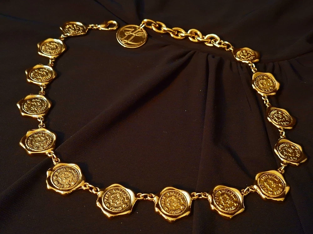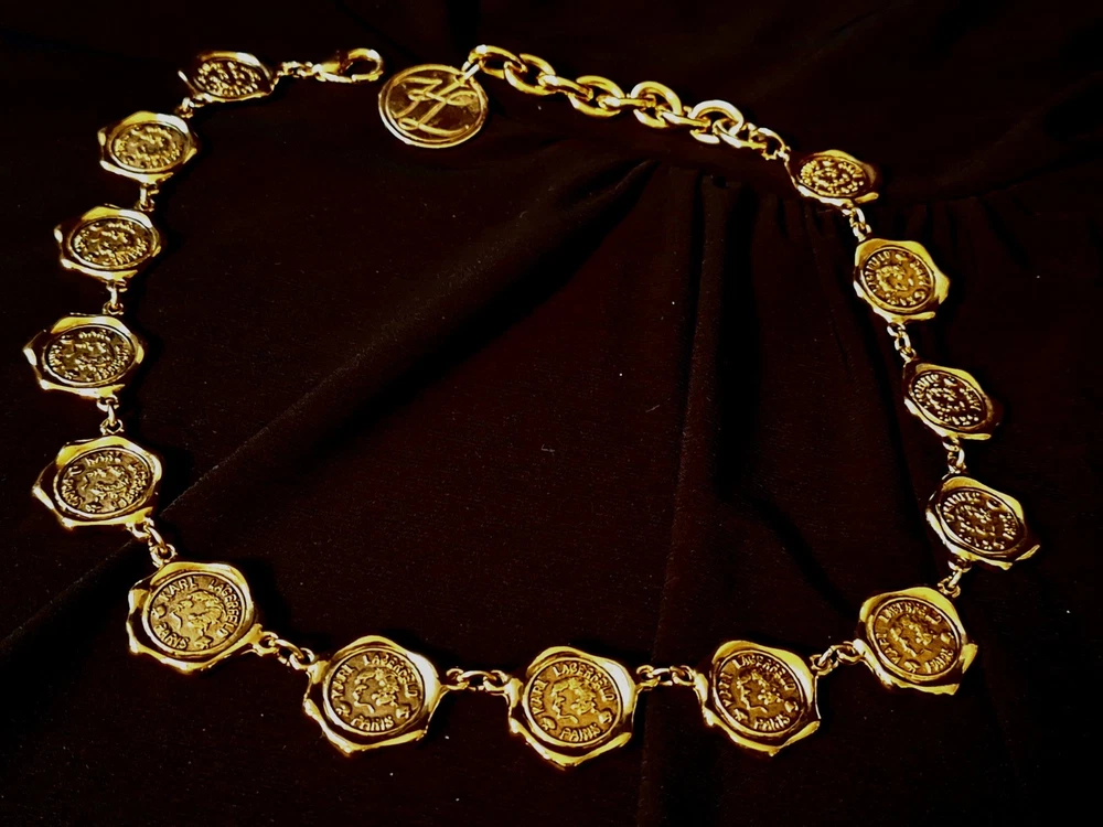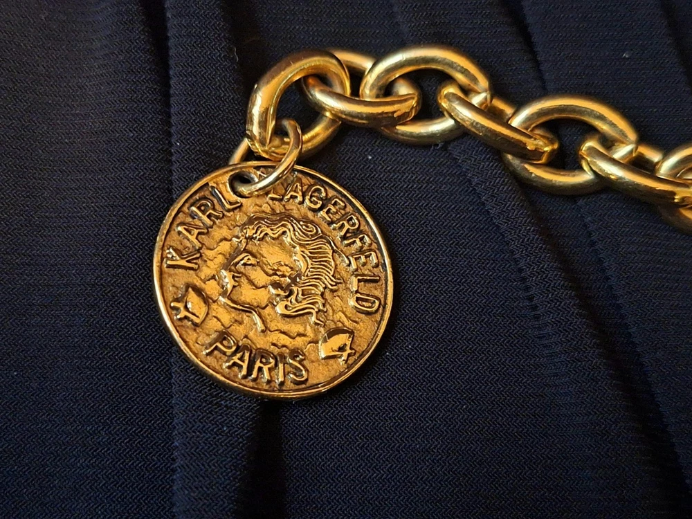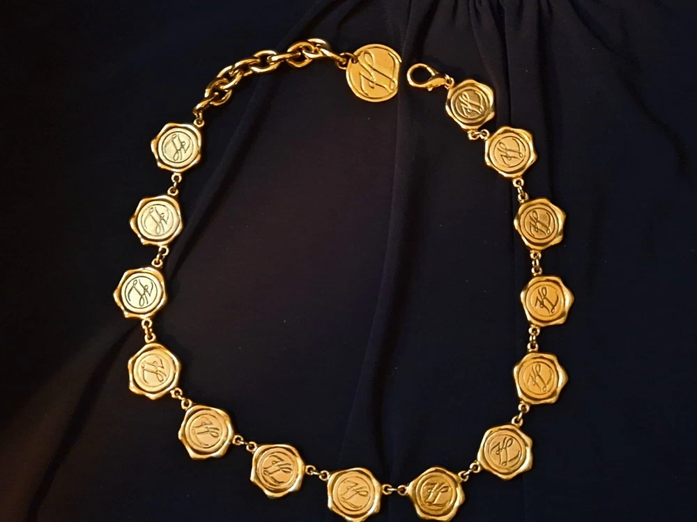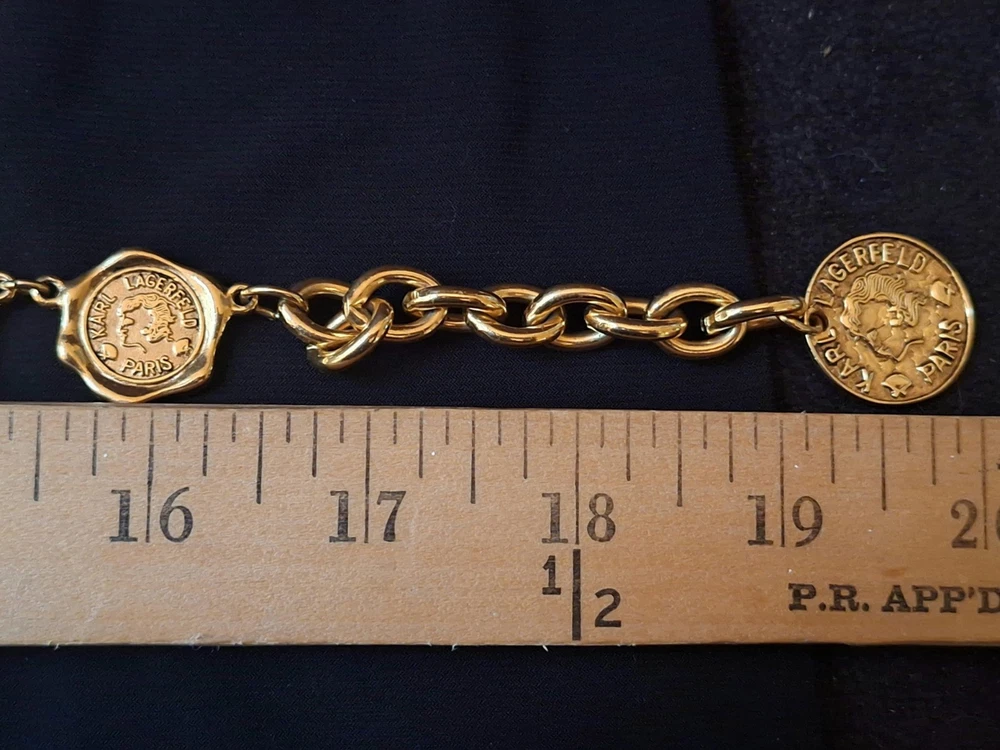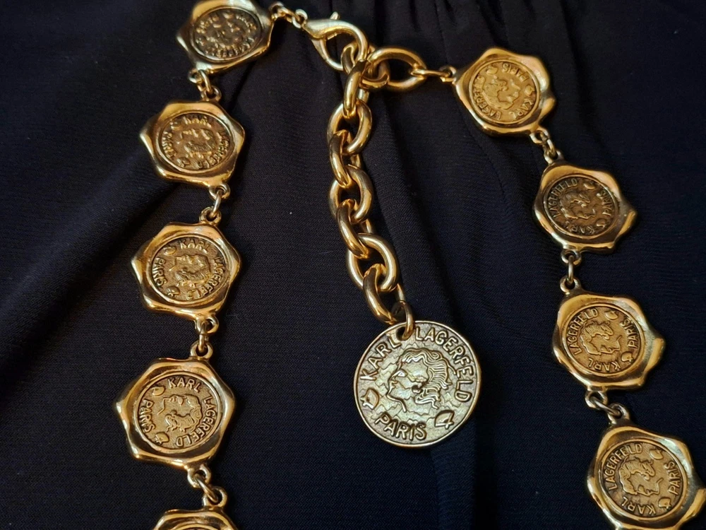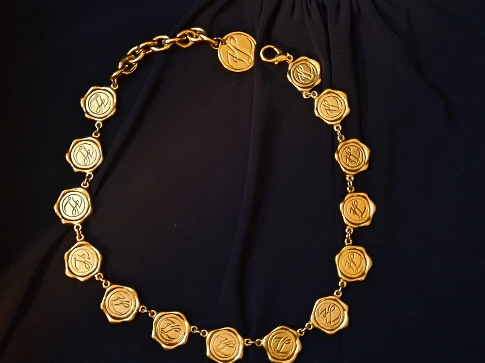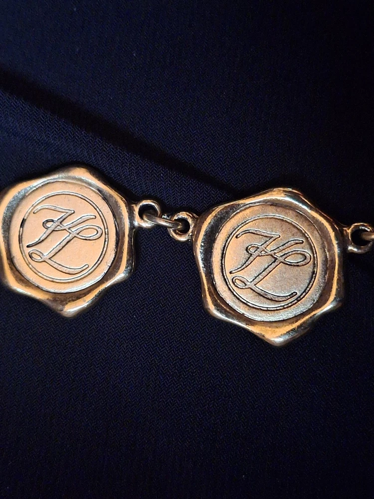 This vintage Karl Lagerfeld runway logo wax seal design gold tone necklace features a 20-inch yellow gold plated chain with a lobster closure. This iconic runway piece from the 1980s is exudes a classic fashion-forward style. 2 sided design features logo coun on one side with KL initials on the reverse. Perfect for women who appreciate high-quality fashion jewelry with a touch of nostalgia, this necklace is a timeless accessory from the renowned Karl Lagerfeld brand. Excellent pre-owned condition. 20 inch collar style necklace. UPS SHIPPING INSURED/SIGNATURE REQUIRED DELIVERY