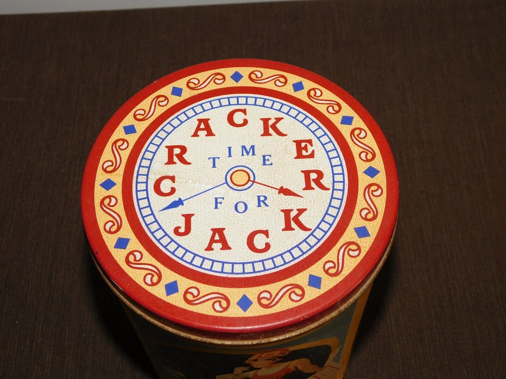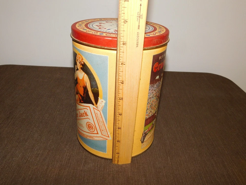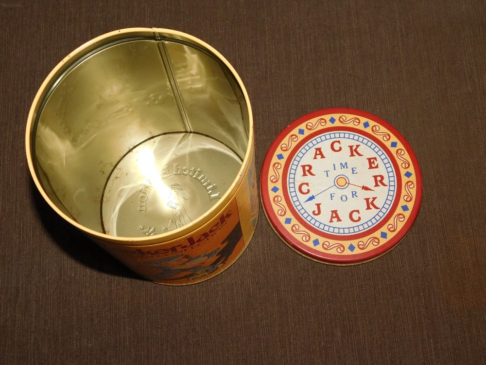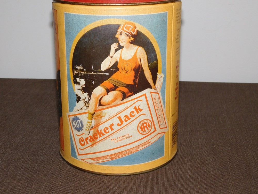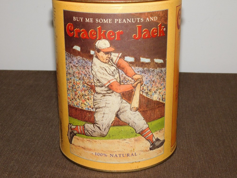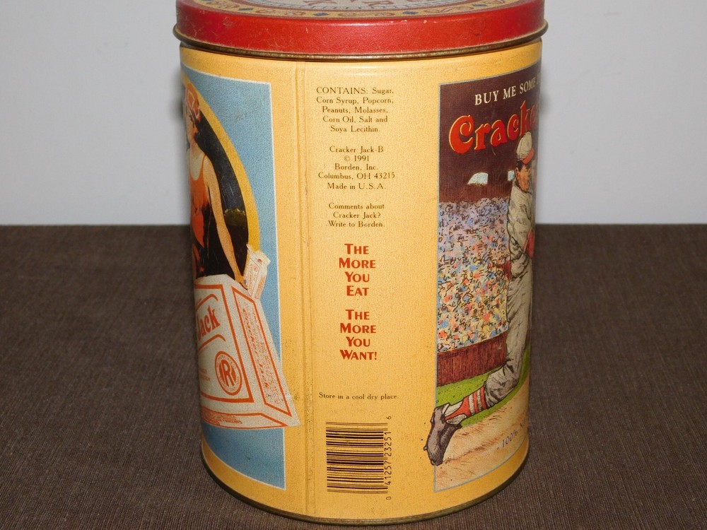 YOU ARE BIDDING ON..... VINTAGE KITCHEN 1991 8" HIGH CRACKER JACK POPCORN TIN CAN *EMPTY* ..SHOWS HANDLING/AGE WEAR..HAS SCRATCHES/PAINT LOSS/STAINS/AGE DISCOLORATION ... PLEASE VIEW PHOTOS FOR CONDITION.***PLEASE E-MAIL IF YOU HAVE A QUESTION OR WANT AN ADDITIONAL PICTURE....PLEASE VISIT MY EBAY STORE FOR ADDITIONAL VINTAGE ITEMS..THANK YOU***8VBX1330 PLSBG