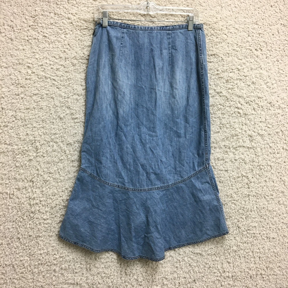 VINTAGE LRL Ralph Lauren Skirt 4 Women Blue Denim Midi Trumpet Ruffle A Line Y2K